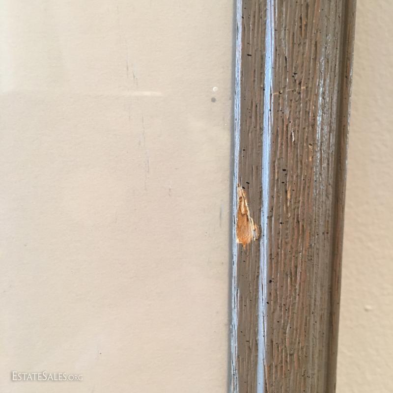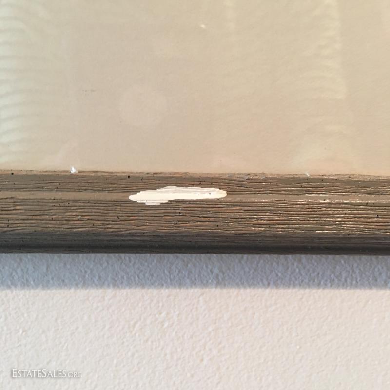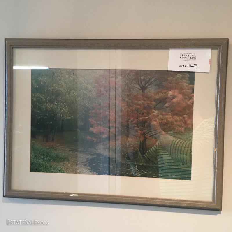 Original photography, one mat & framed. Subject: early morning foggy fall scene. Light grey, faux wood frame: 19.5" L x 25" W