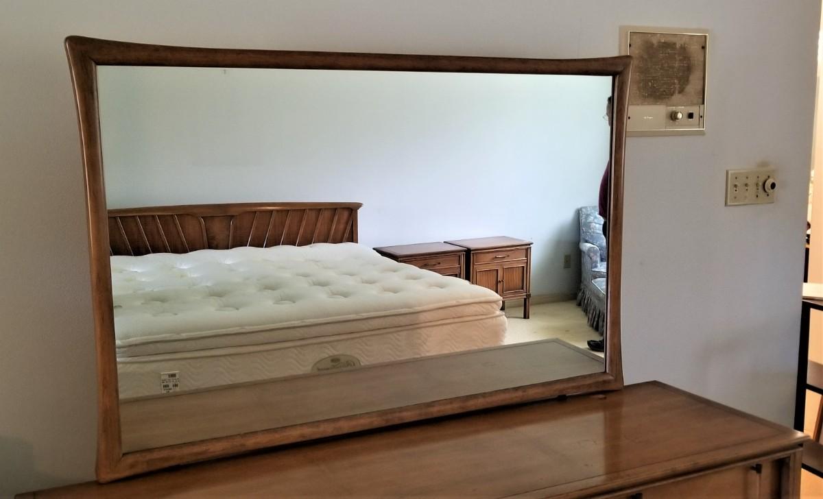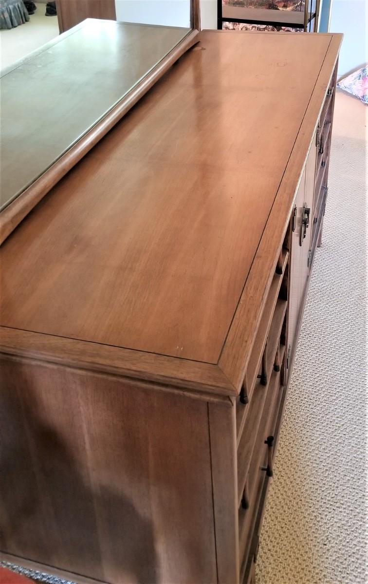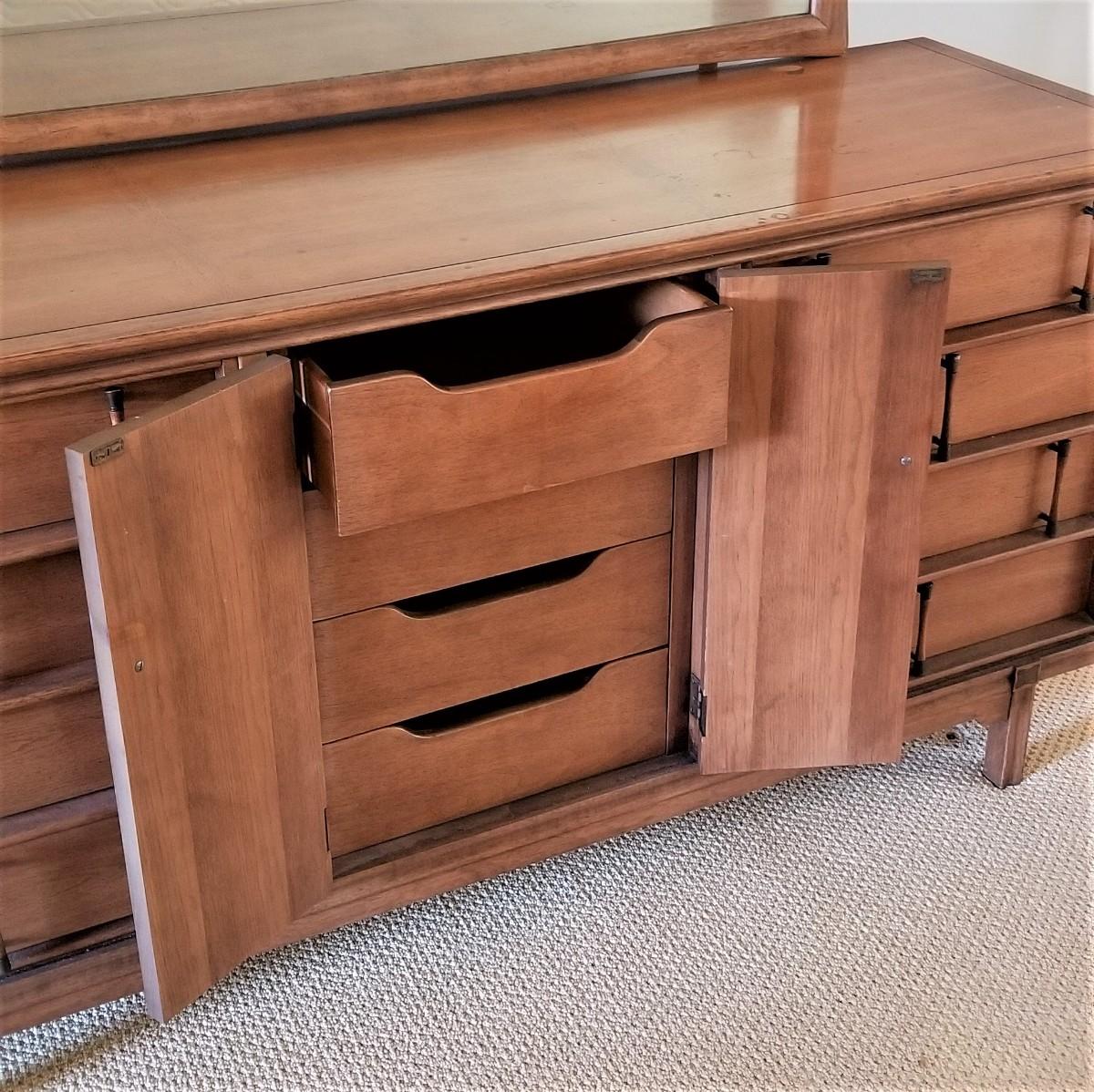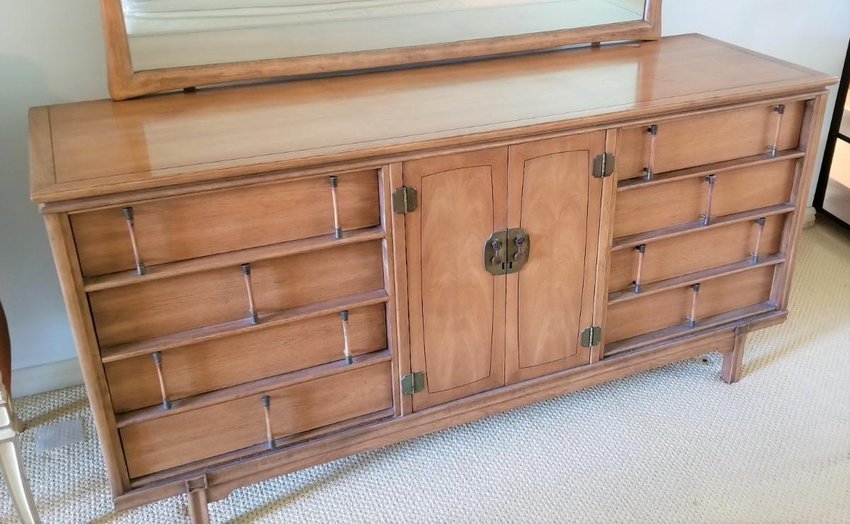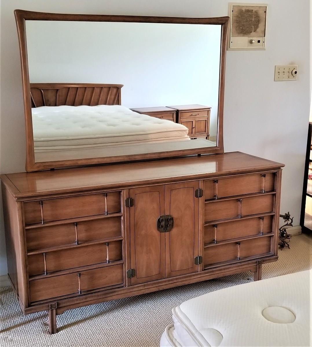 This piece matches lot #146/143. Thomasville furniture - solid wood. Gorgeous MidCentury Modern dresser with 11 drawers - mirror is removeable. 20" deep, 65" across, not counting the mirror 31" tall - with mirror 66.5" tall. You must be prepared to move this yourself (it's upstairs). Overall very good condition. - only gently used.