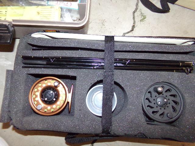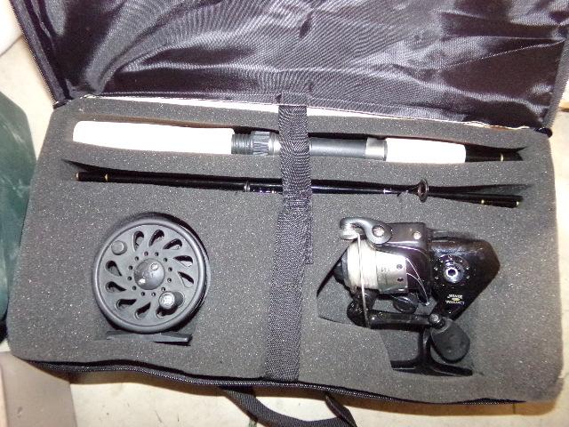 2 CRYSTAL RIVER - FISHING RODS AND REELS (FLY REEL AND SPINNING REEL) IN CASES.