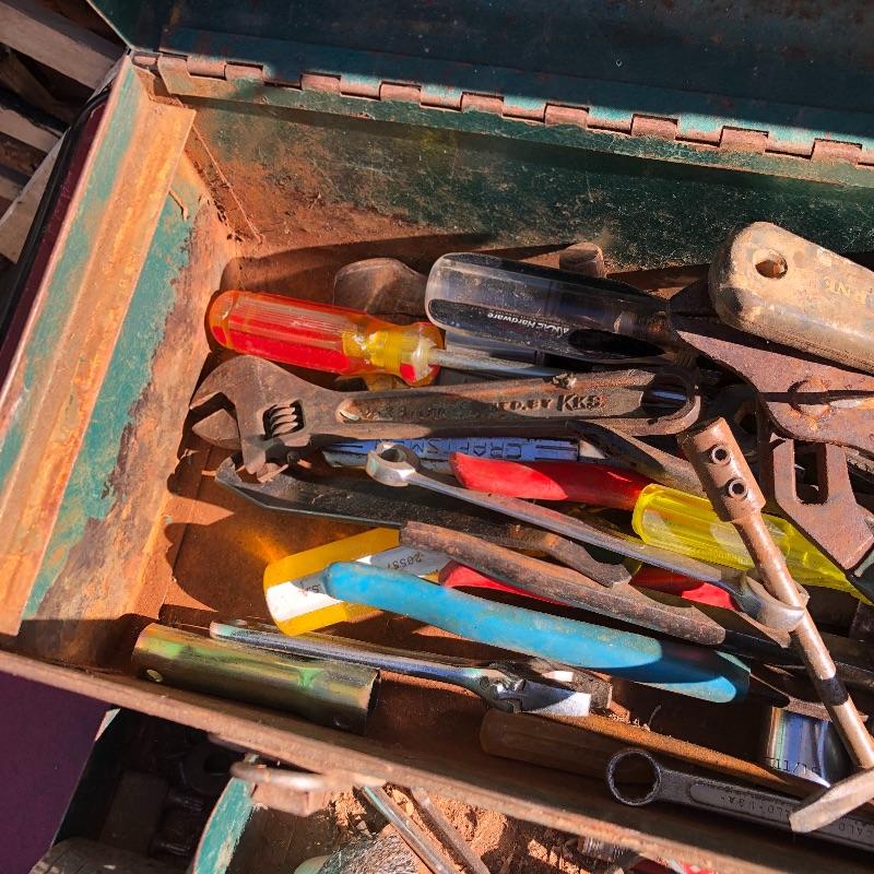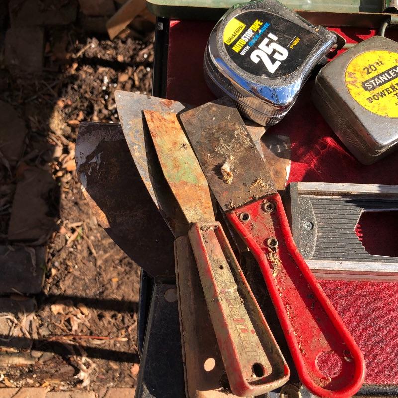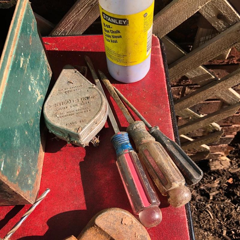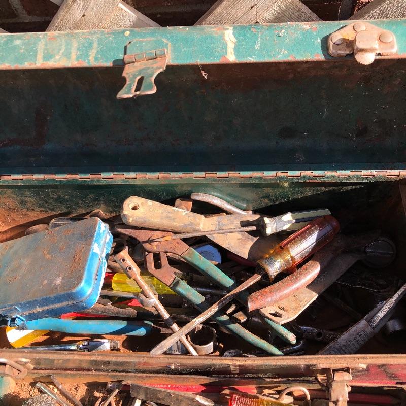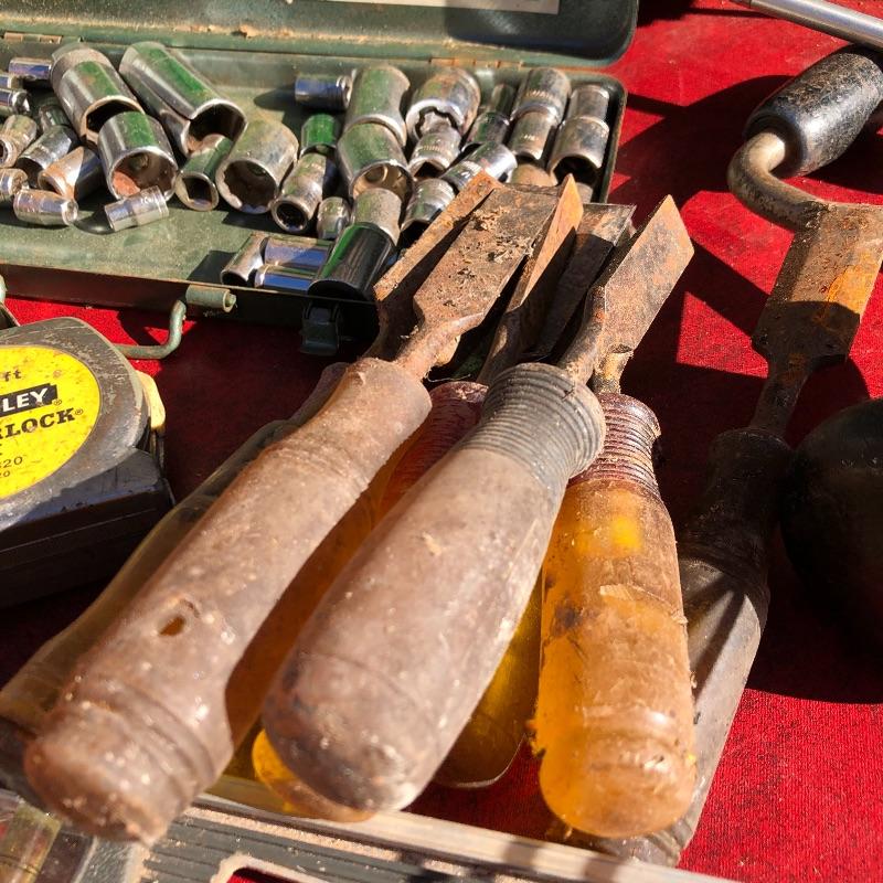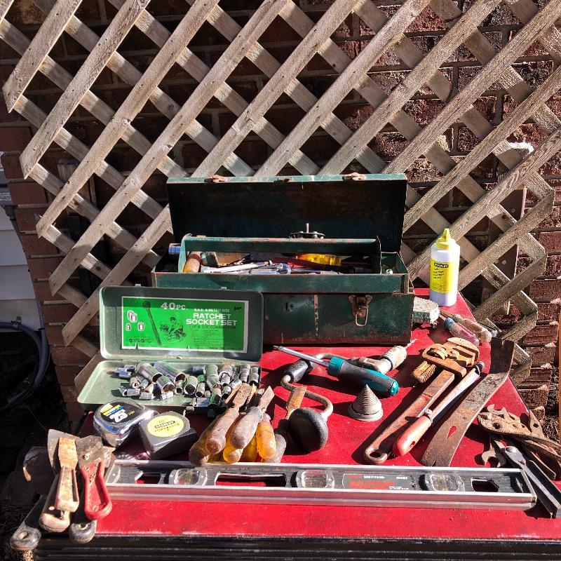 This lot contains a large toolbox (22” x 9.5” x 9) that contains many tools. Some of them include several chisels with a yellow handle of various sizes, a level, a tape measurer (the 25’ measurer was removed from the lot), sockets of various sizes, and several screwdrivers. The toolbox has two layers, with tools on the top and bottom layer. Local pickup only.