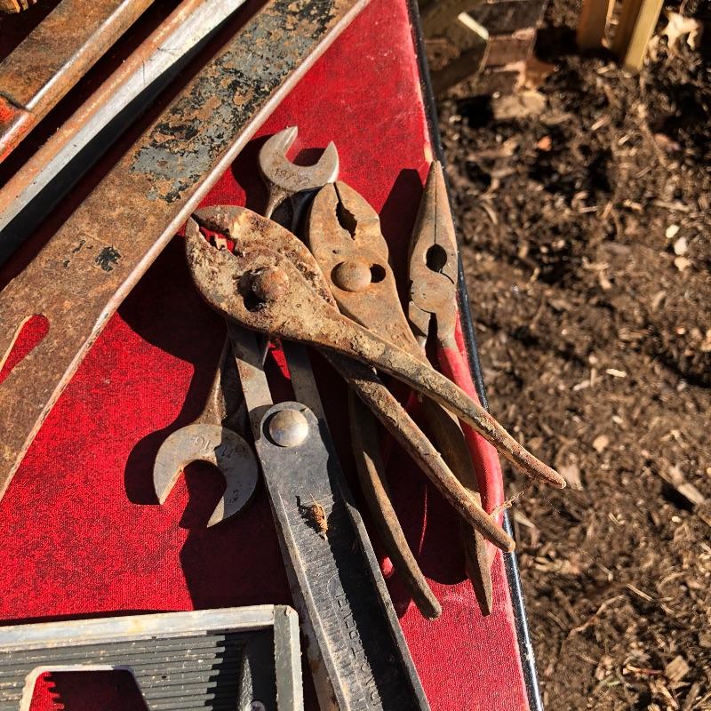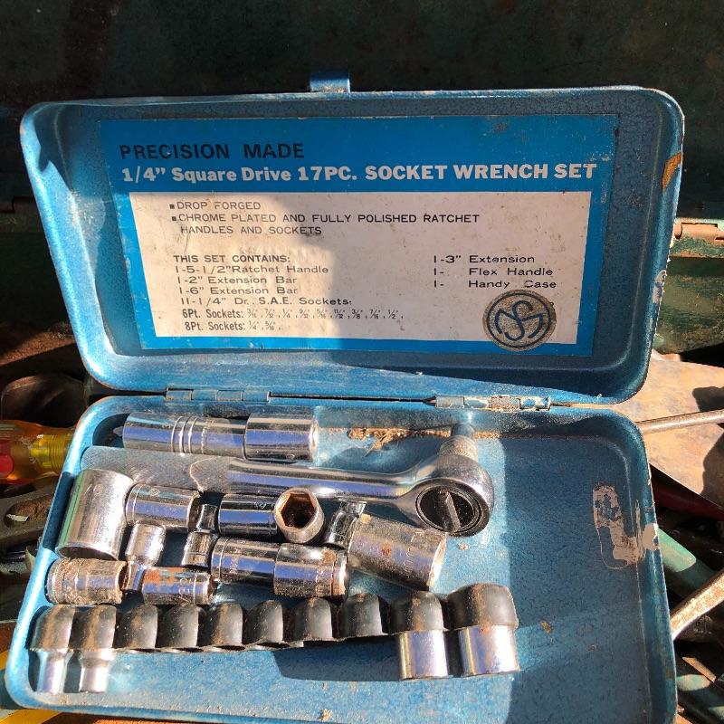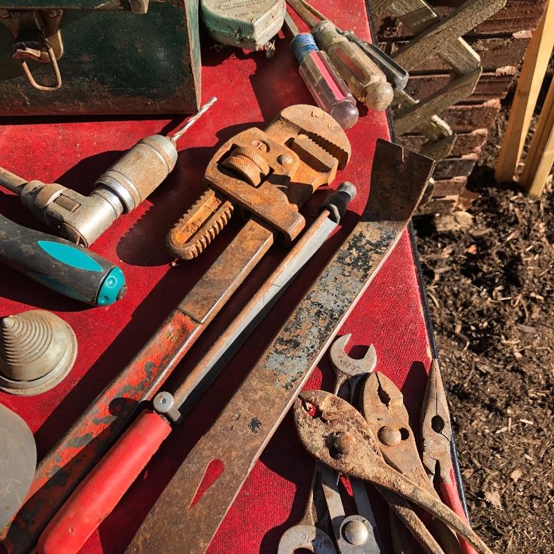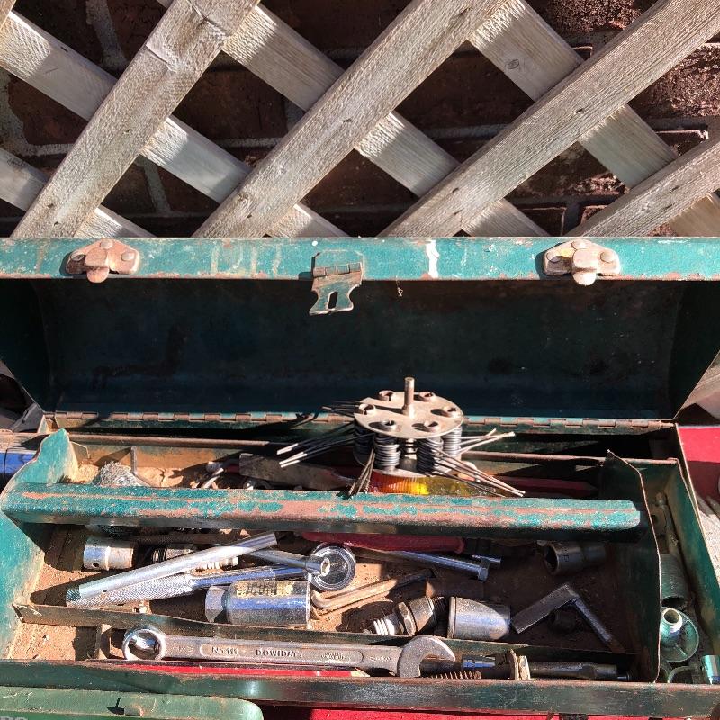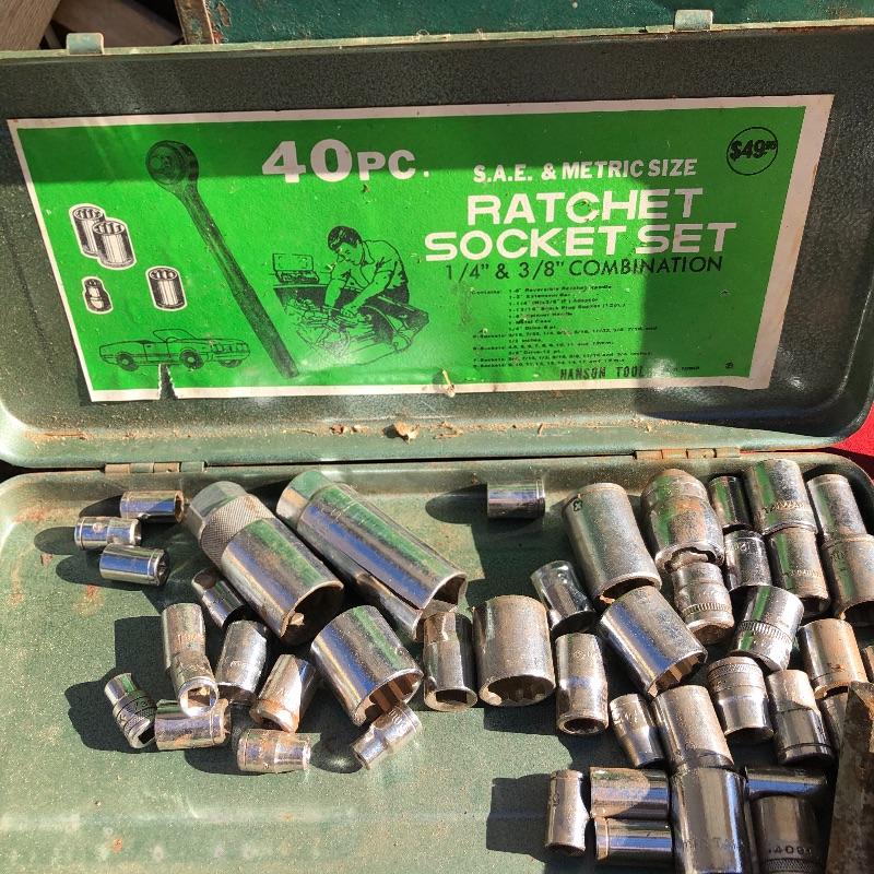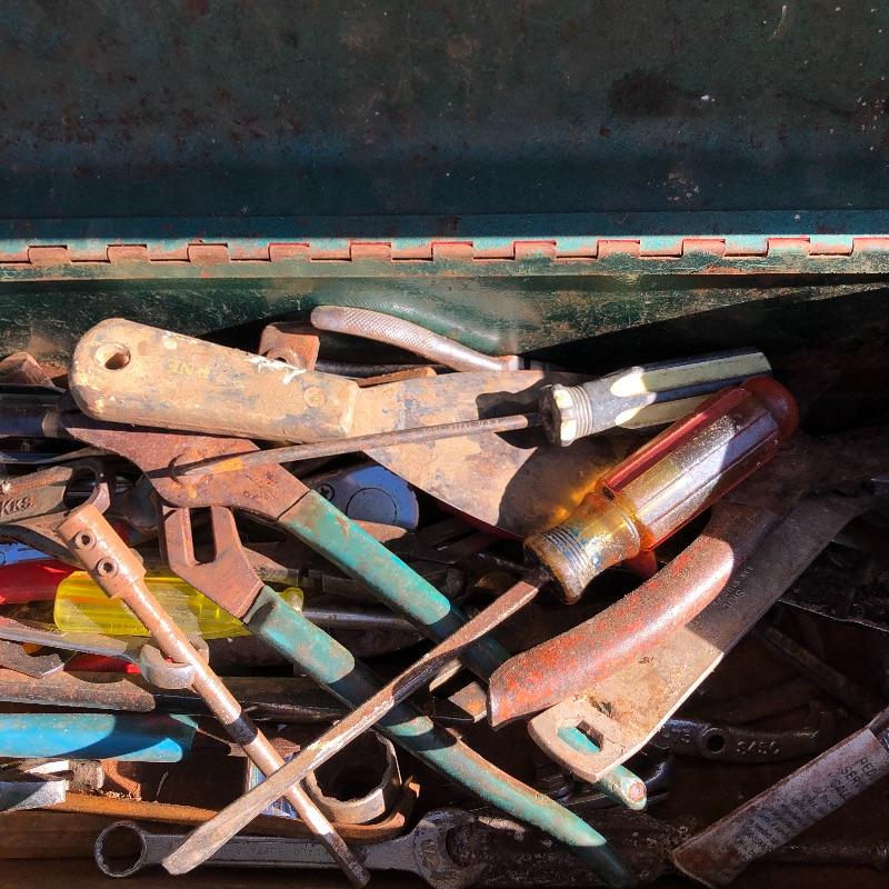 This lot contains a large toolbox (22” x 9.5” x 9) that contains many tools. Some of them include several chisels with a yellow handle of various sizes, a level, a tape measurer (the 25’ measurer was removed from the lot), sockets of various sizes, and several screwdrivers. The toolbox has two layers, with tools on the top and bottom layer. Local pickup only.