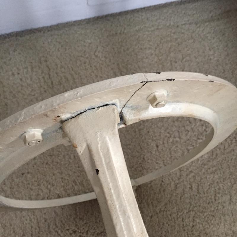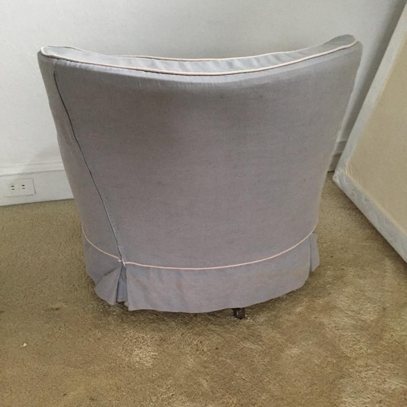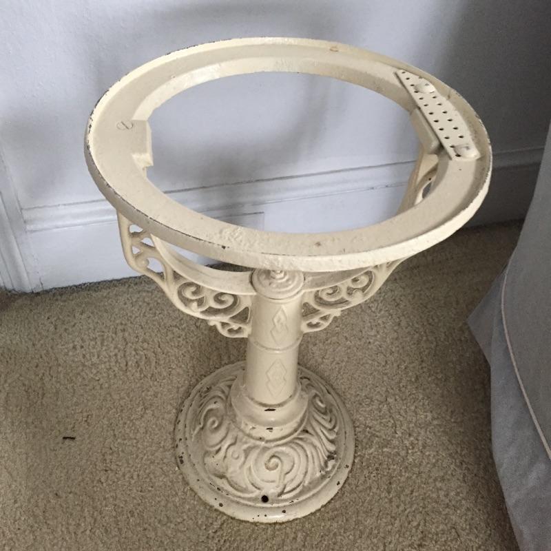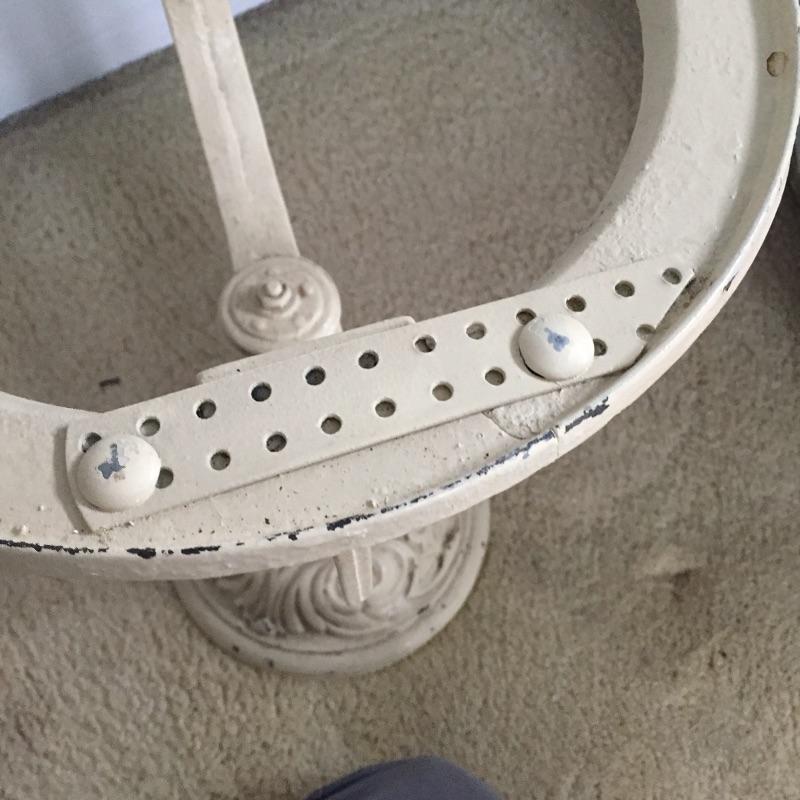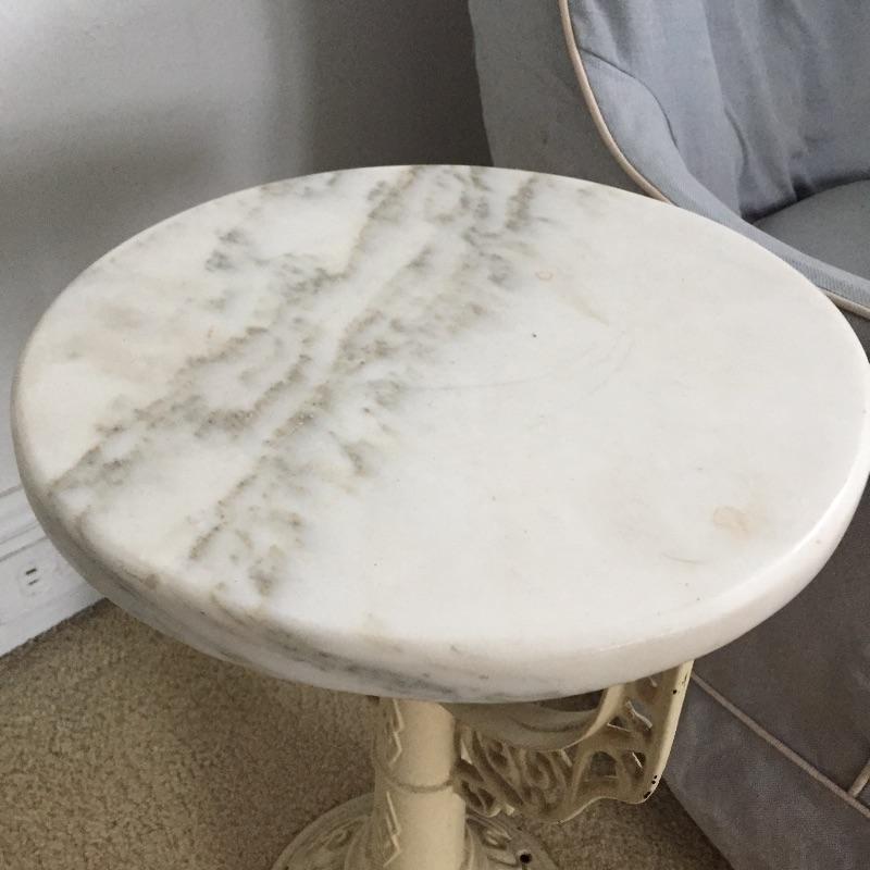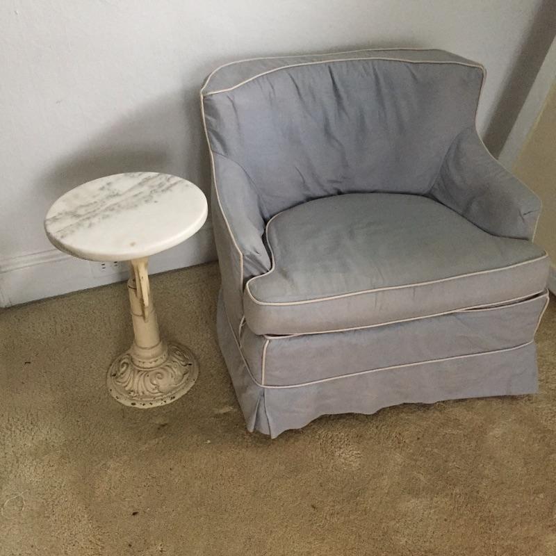 Enchanting Iron table base with removable marble top and green swivel rocker that has a blue slip cover on it. Chair measures 30” x 32” x 26” and table measures 21”D x 14” tall. Iron base looks to have been repaired- see pictures.