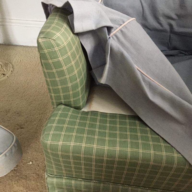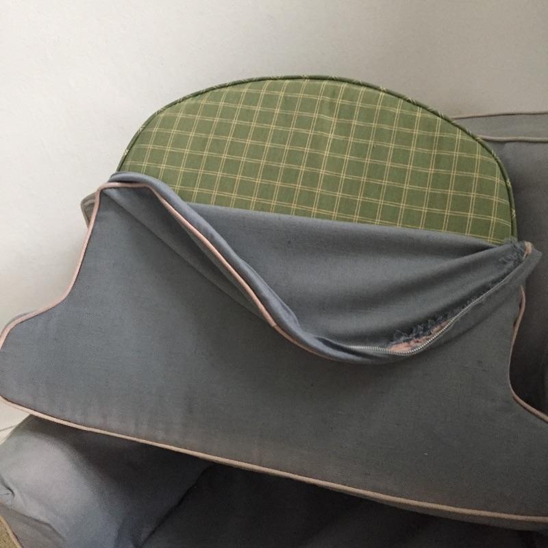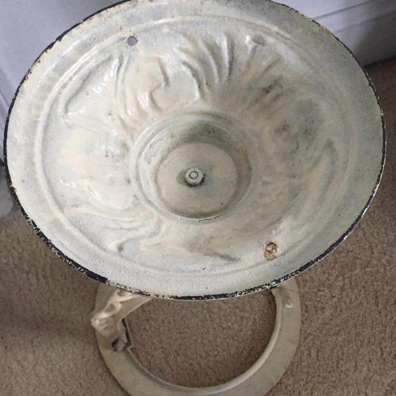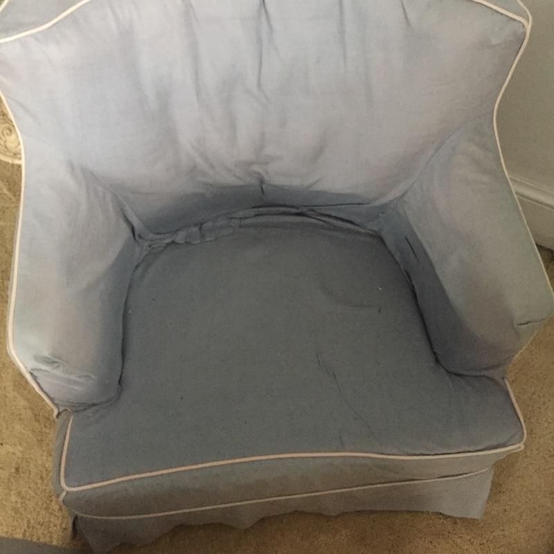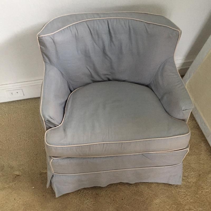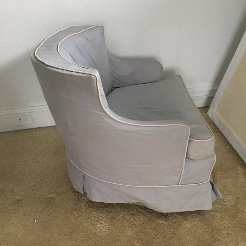 Enchanting Iron table base with removable marble top and green swivel rocker that has a blue slip cover on it. Chair measures 30” x 32” x 26” and table measures 21”D x 14” tall. Iron base looks to have been repaired- see pictures.