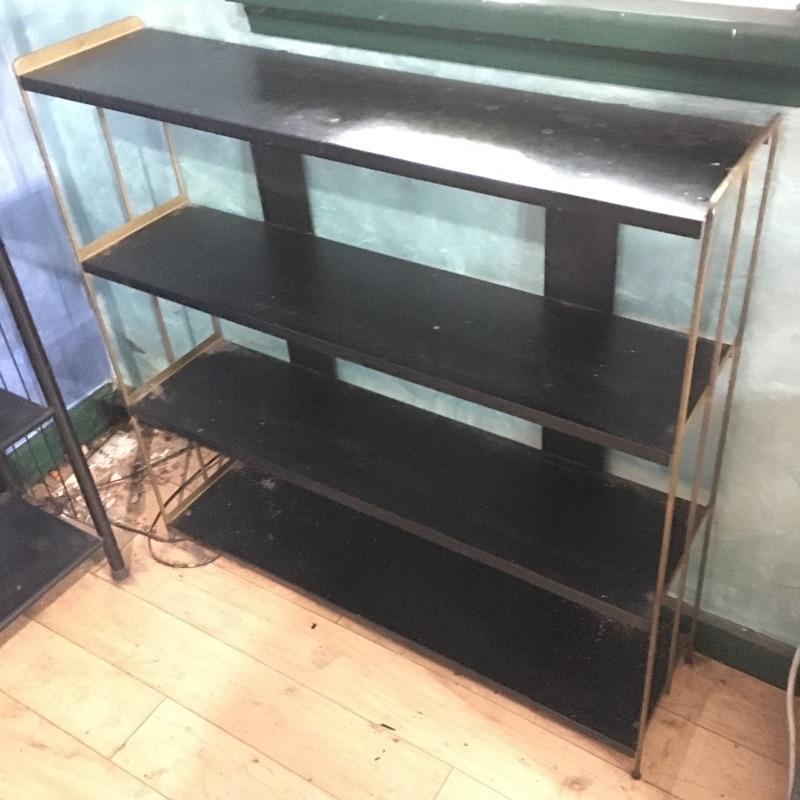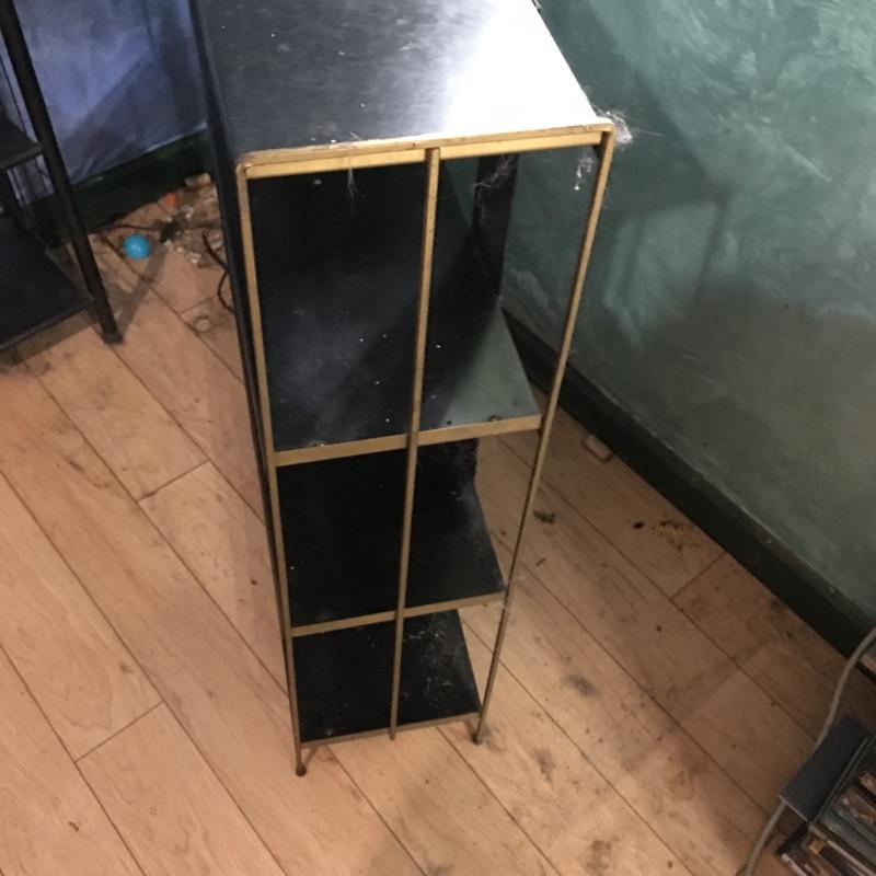 Sleek metal bookcase and stool. Lot includes adjustable height metal stool and metal bookcase. Items have animal hair on them, but can be easily cleaned.