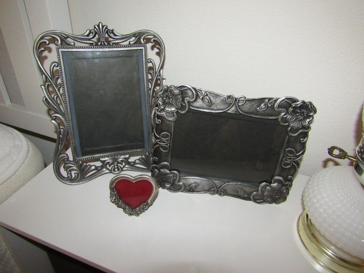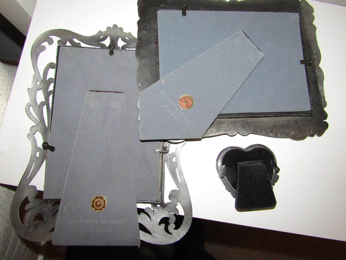 2 JENNIFER MOORE PEWTER LIKE FRAMES AND 1 SMALL HEART SHAPED FRAME