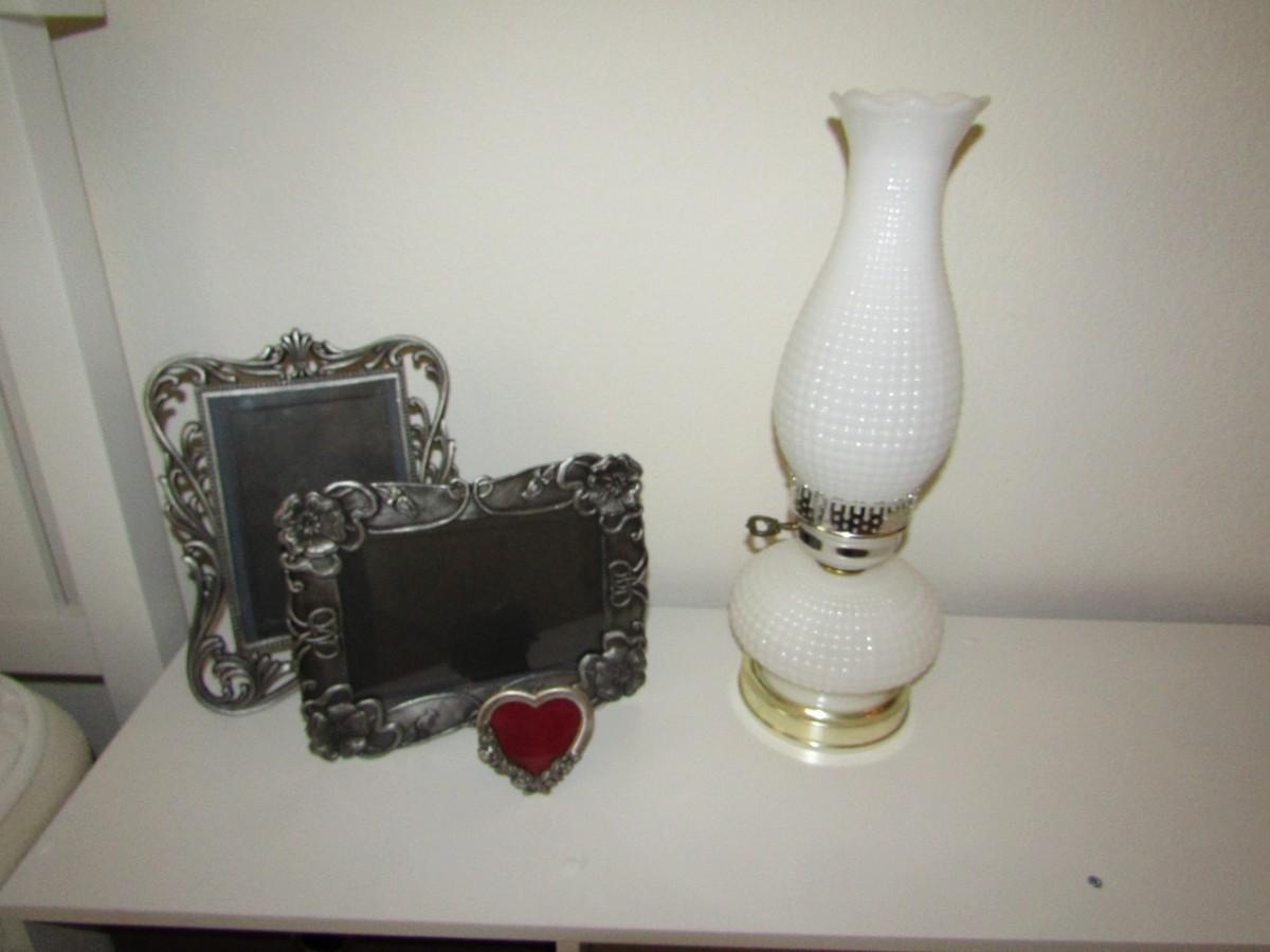 LOT 147 MILK GLASS LAMP AND 3 PEWTER LIKE FRAMES