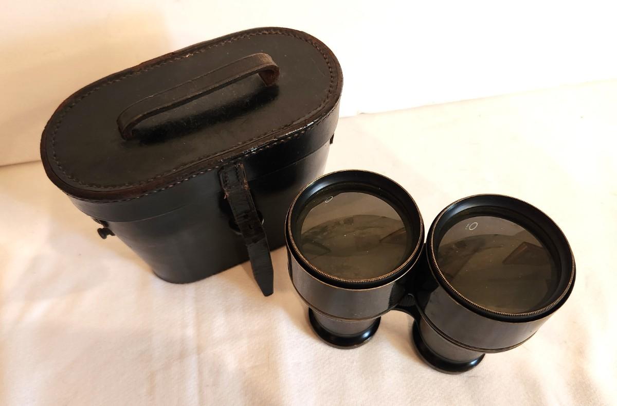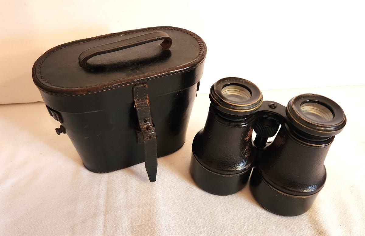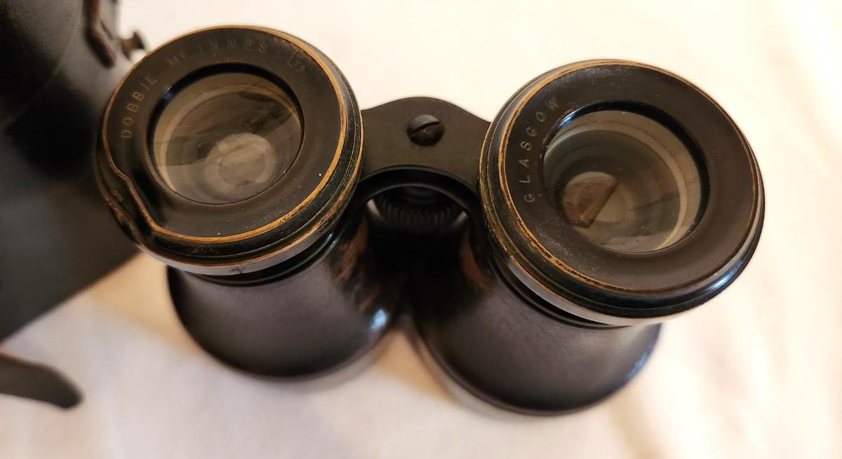 Nice paid of old binoculars with case - note: 1 eyepiece dinged a bit on the rim. Marked Dobbie McInnes, Ltd,, Glasgow (Scotland).