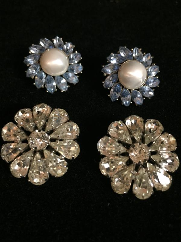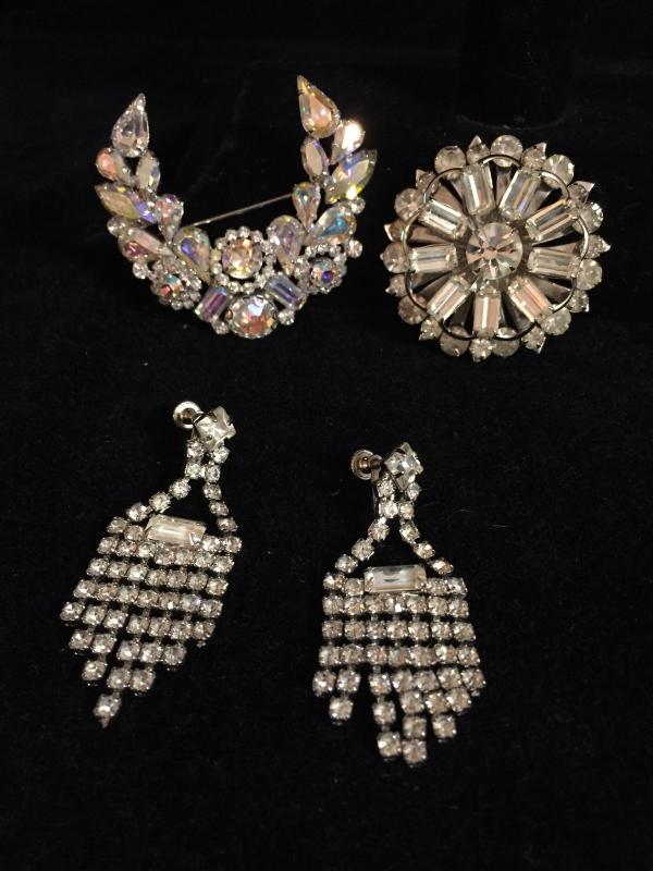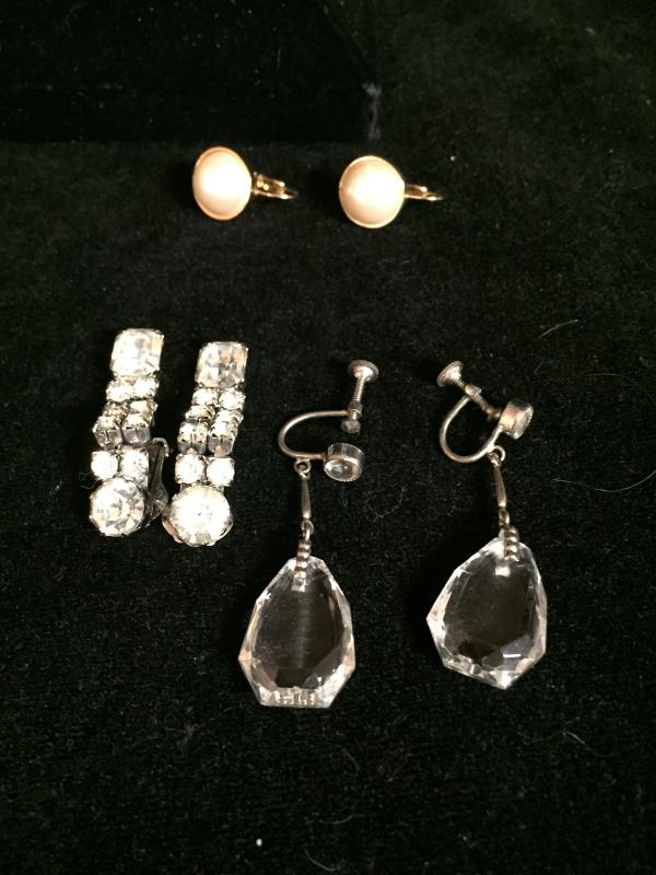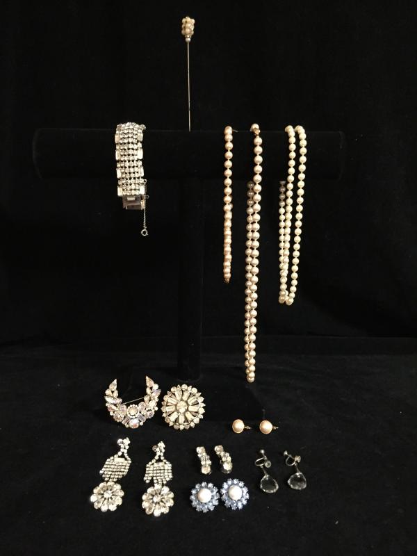 Stunning Pearls with Statement Pieces of Costume Jewelry. Several clip on earrings and pendants with crystals and a hat pin also included.