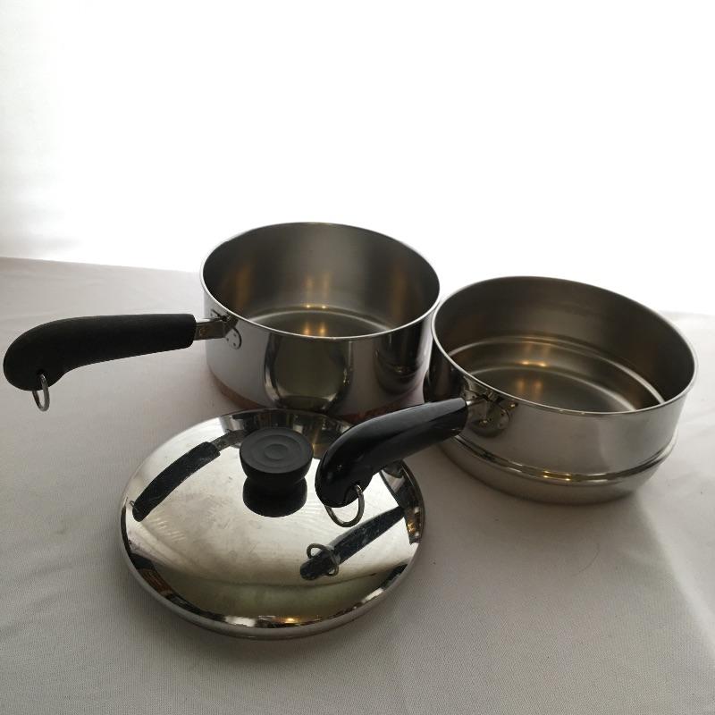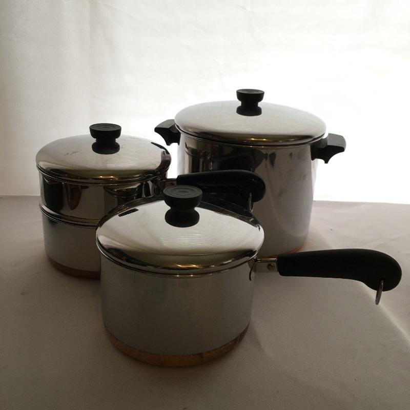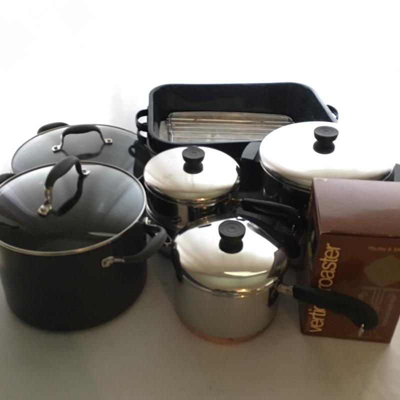 Revere Ware and more. Lot includes seven piece Revere Ware set, four piece Anolon cook ware set, vertical roaster and large roaster.