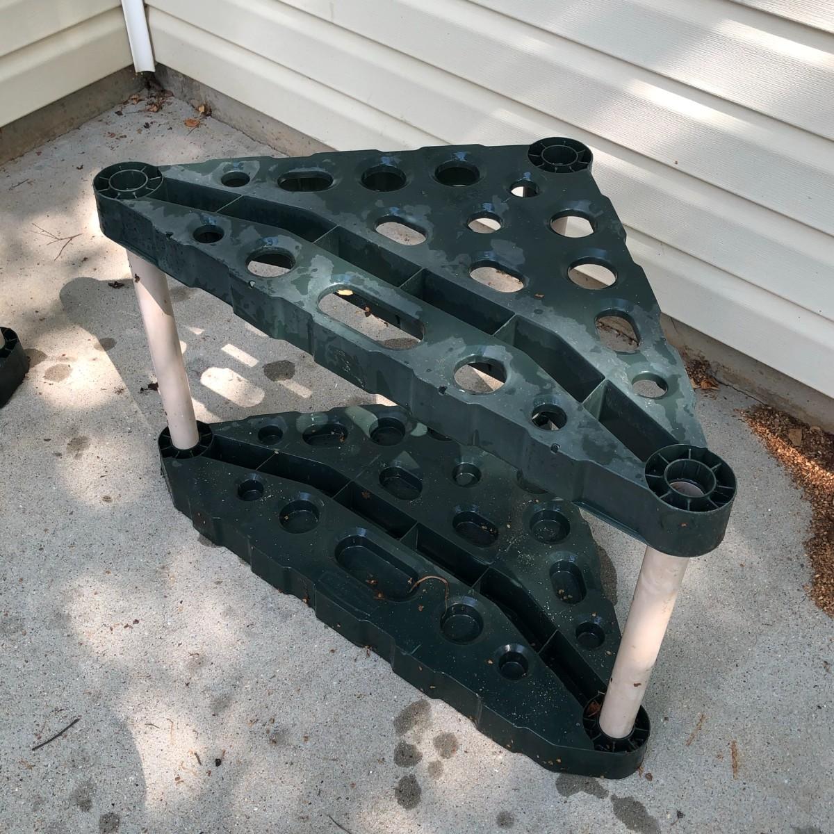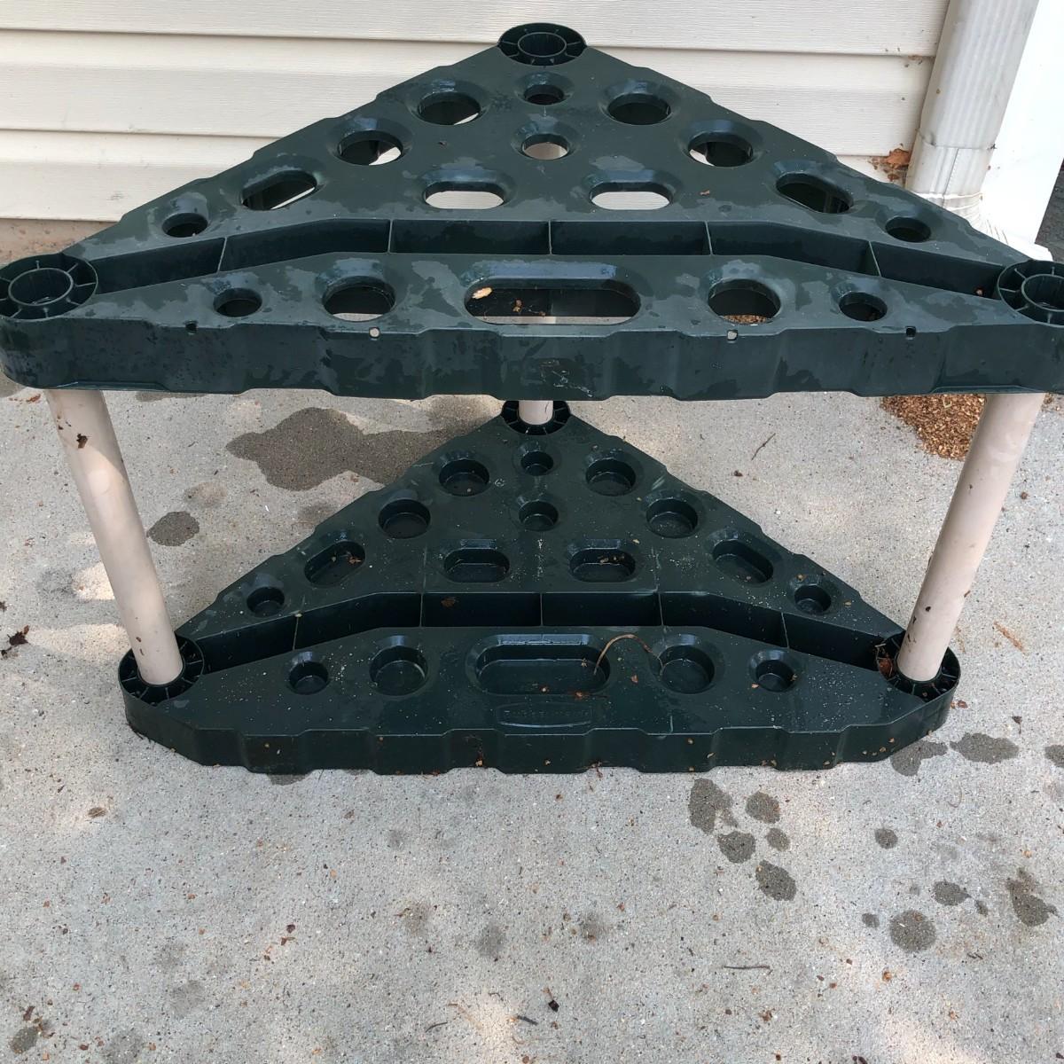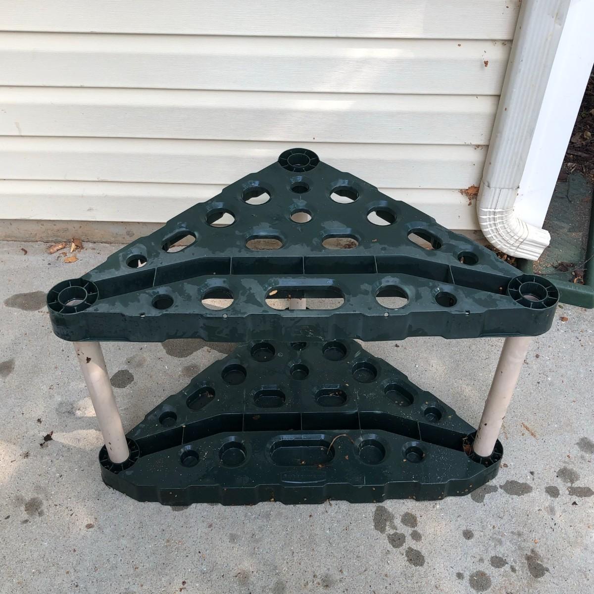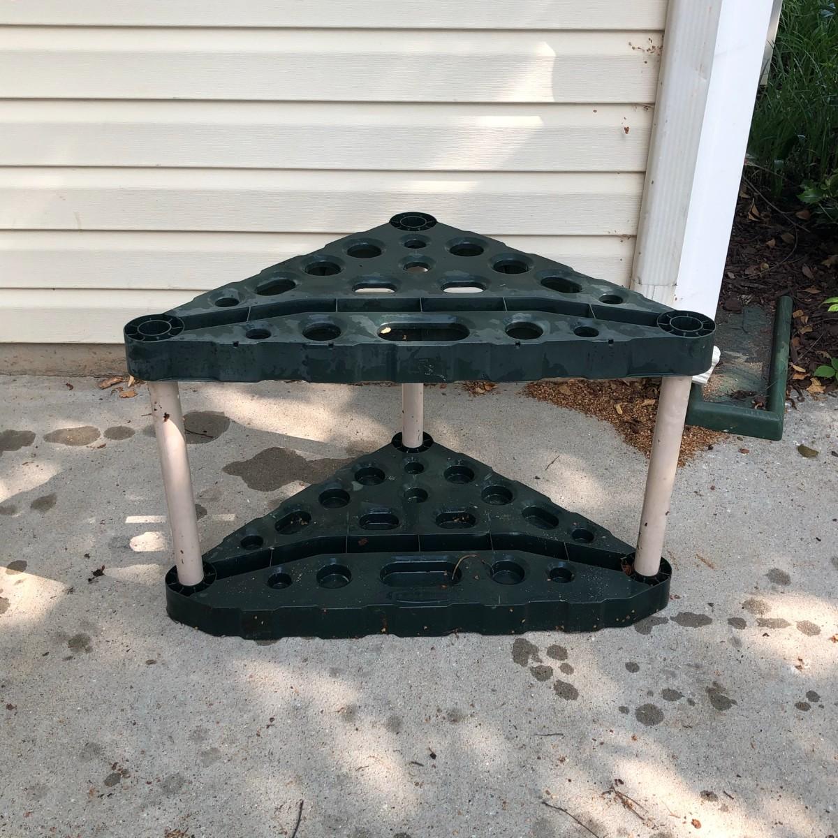 This unit sits in the corner and holds your garden equipment in a standing position (such as shovels, rakes, etc). In very good condition.