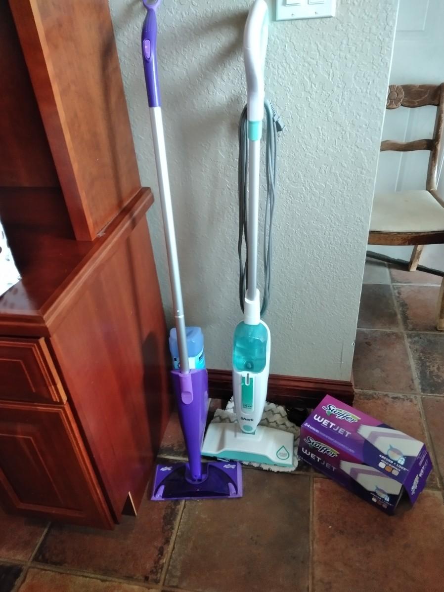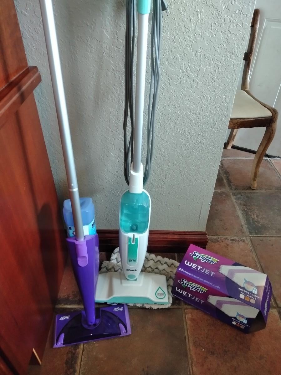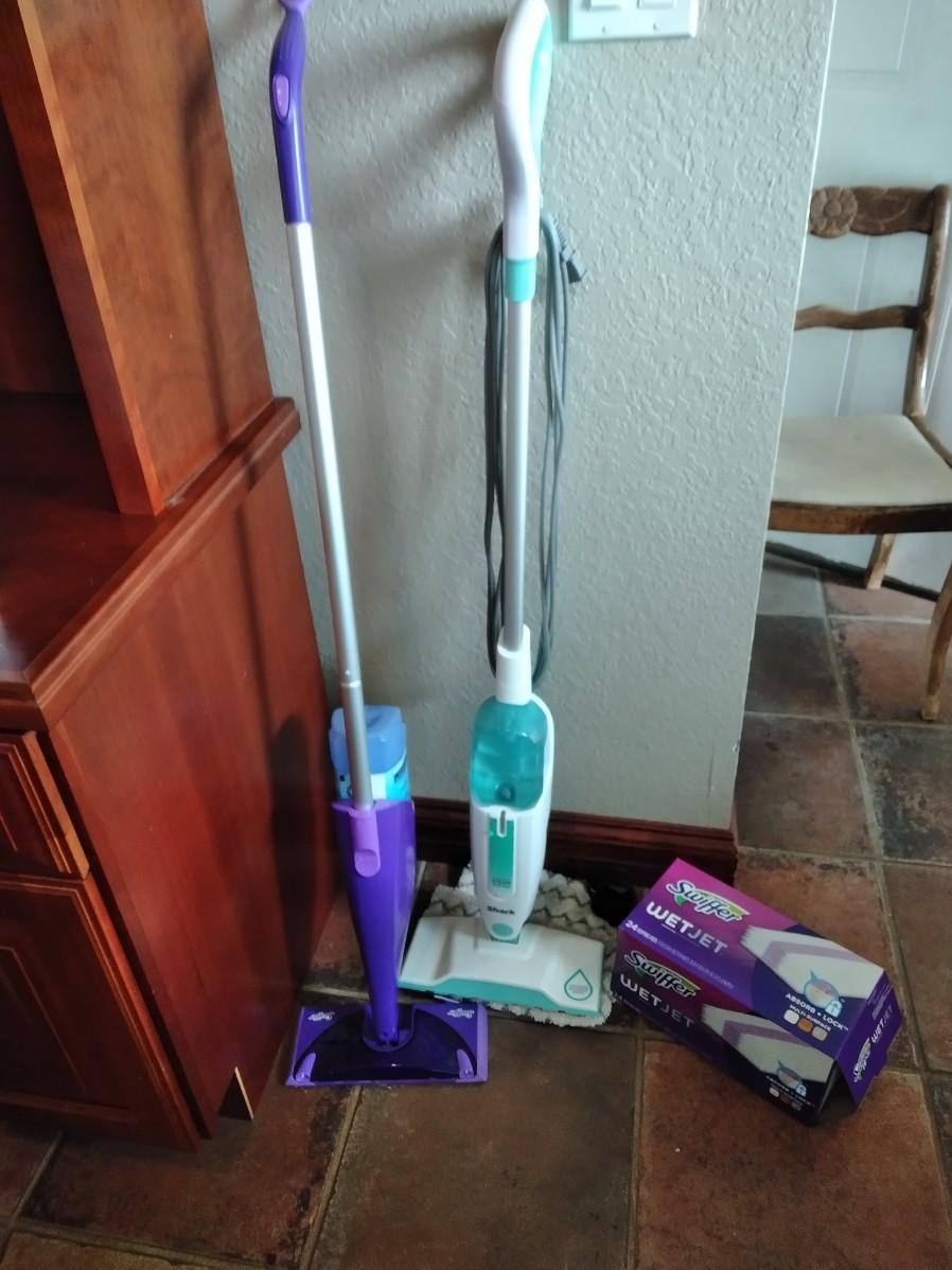 ELECTRIC SHARK STEAM CLEANER WITH PADS AND A SWIFFER WET JET MOP WITH PARIAL (mostly full) BOX OF CLEANING PADS.