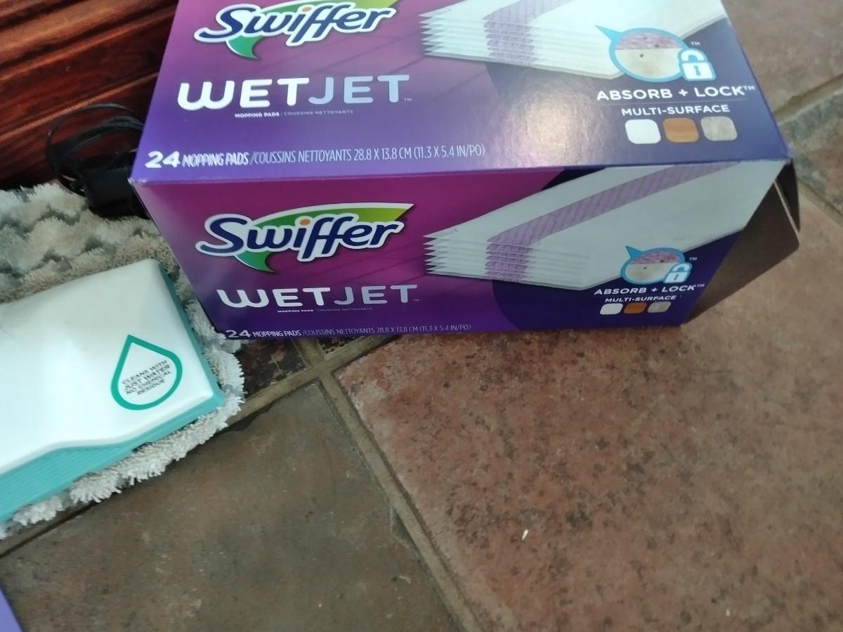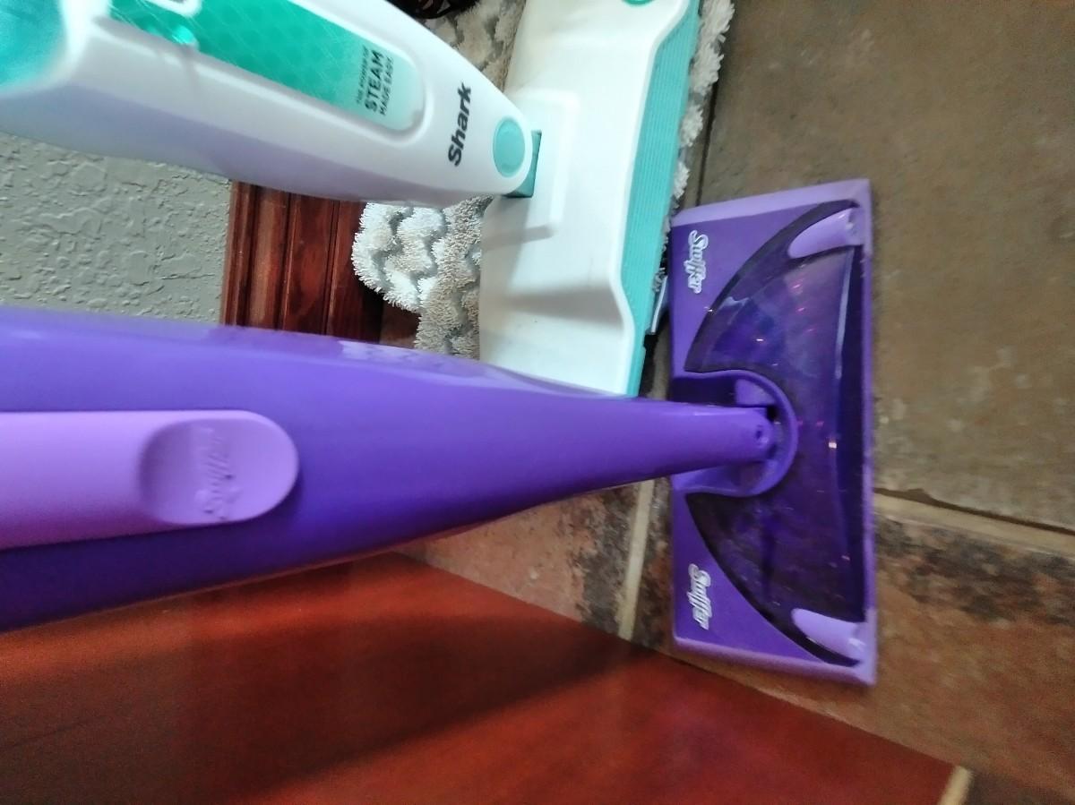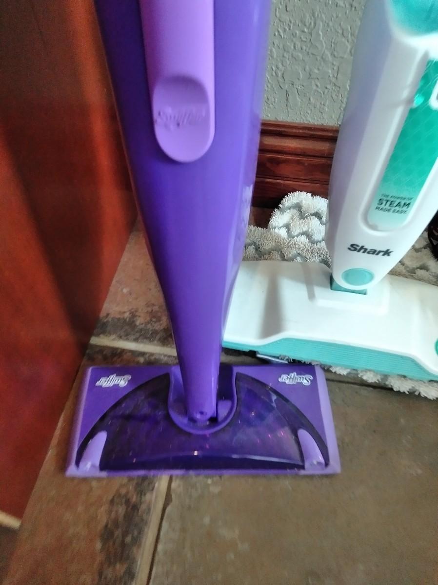 ELECTRIC SHARK STEAM CLEANER WITH PADS AND A SWIFFER WET JET MOP WITH PARIAL (mostly full) BOX OF CLEANING PADS.