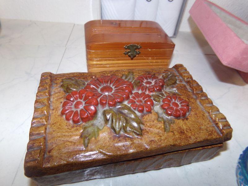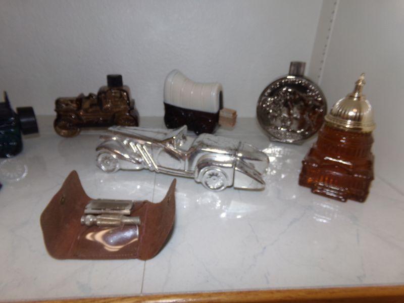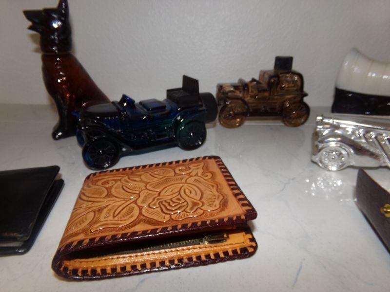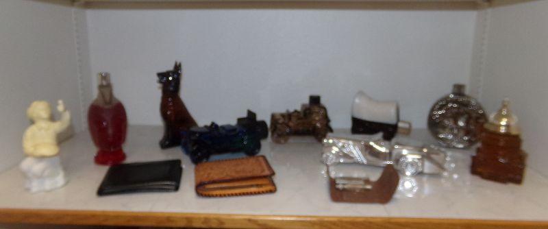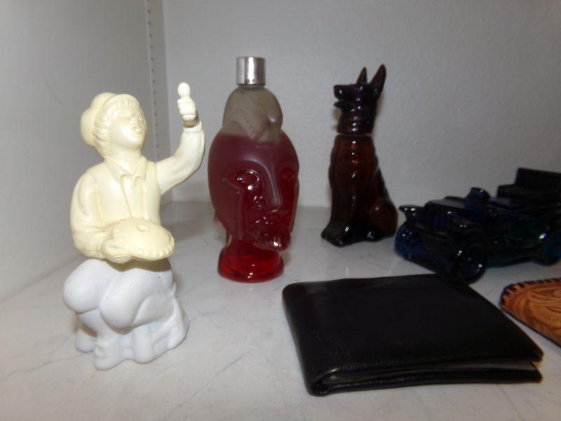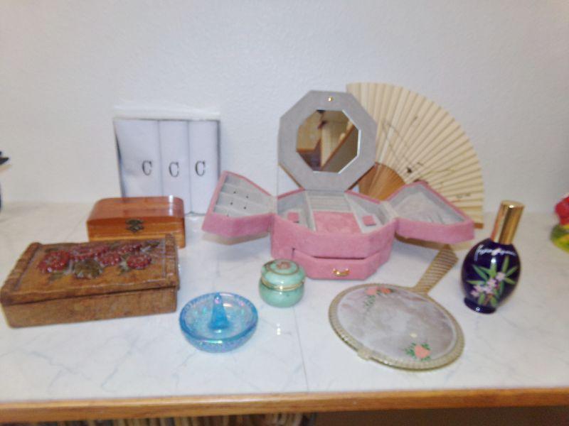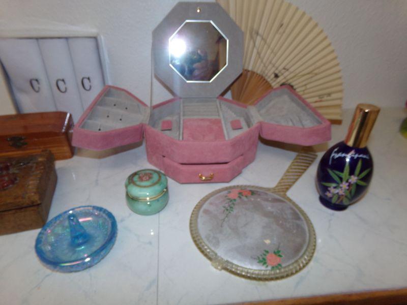 BOXES, MIRROR, RING HOLDER, AVON COLOGNE BOTTLES, MEN'S WALLETS, VINTAGE TRAVEL RAZOR AND MORE
