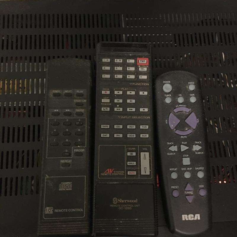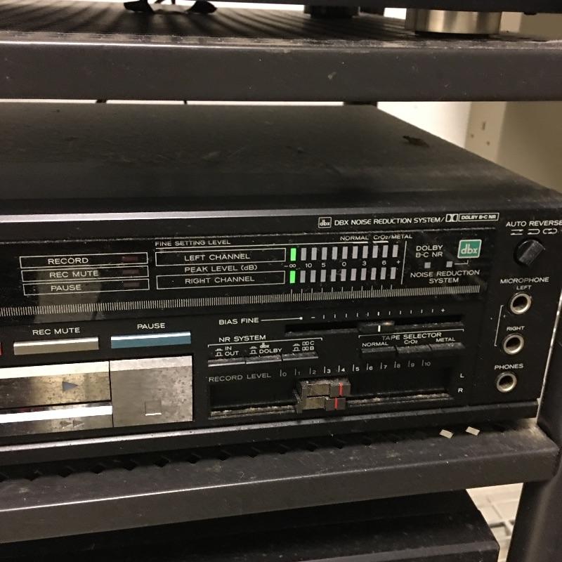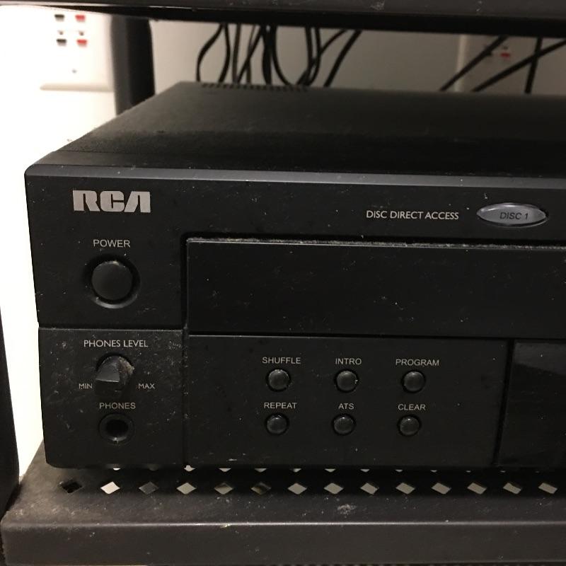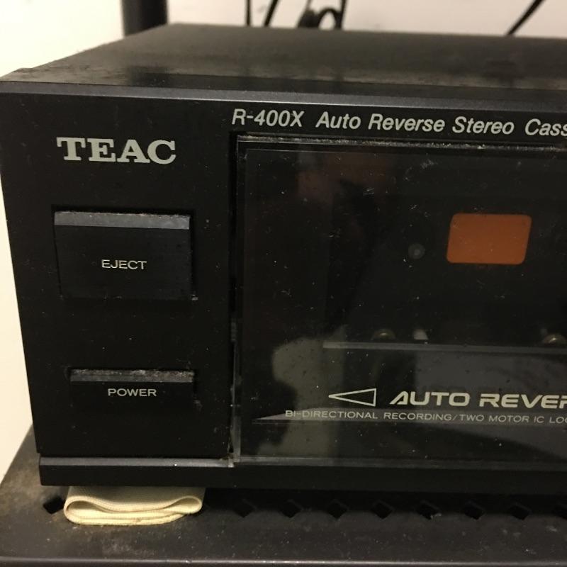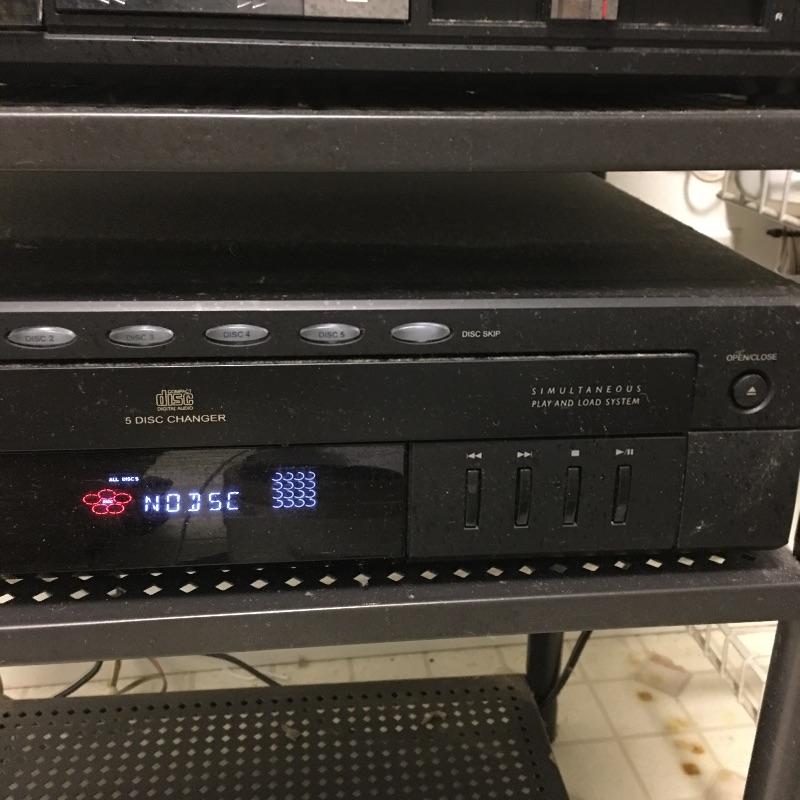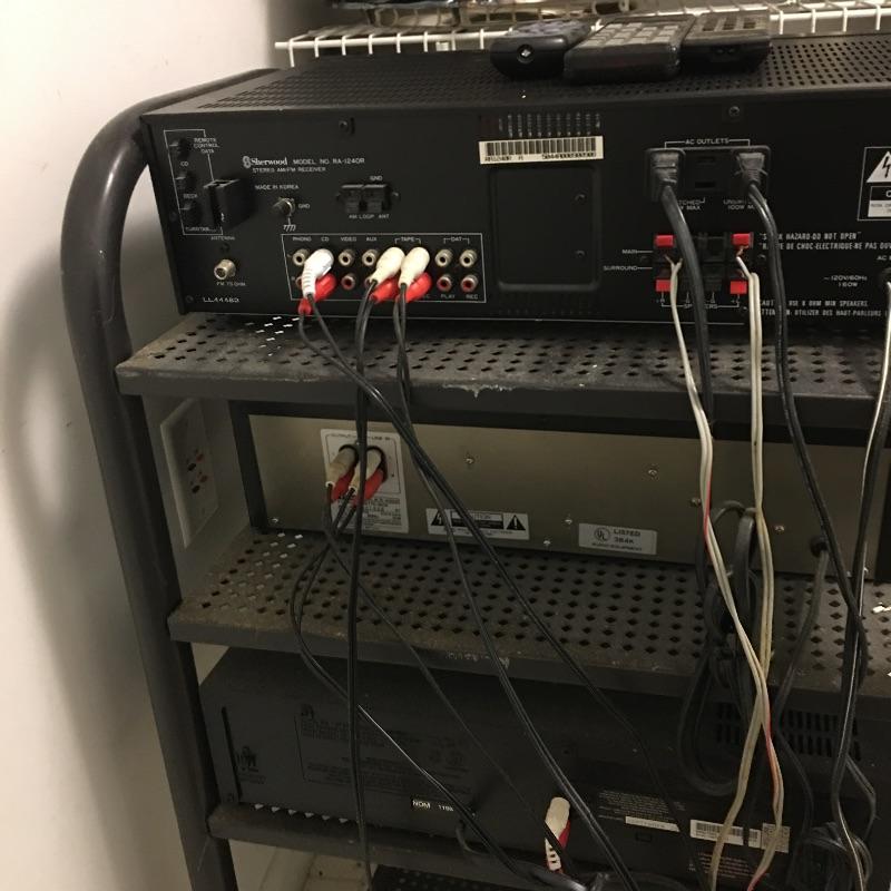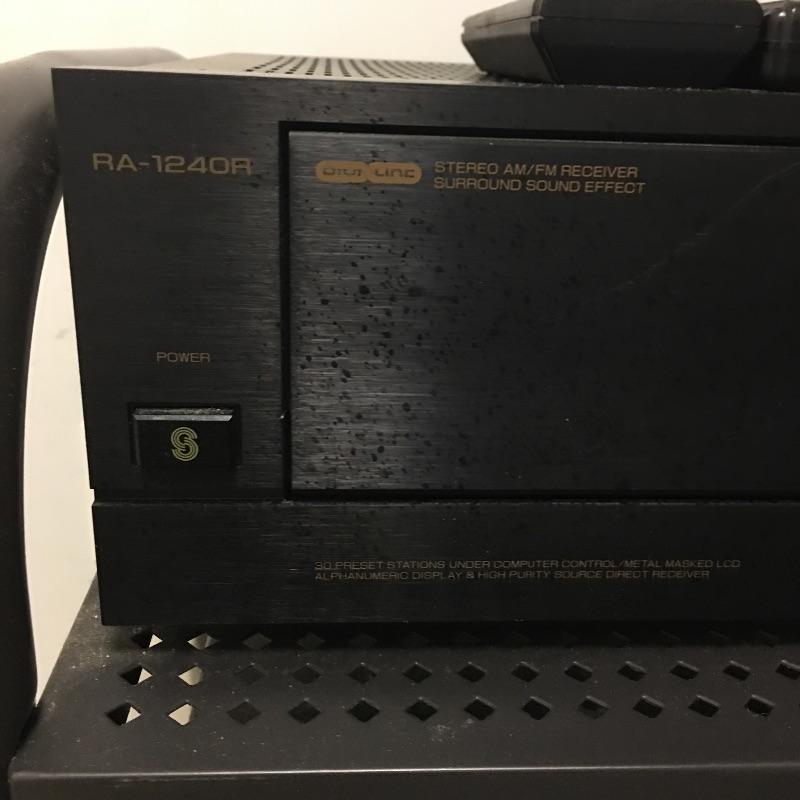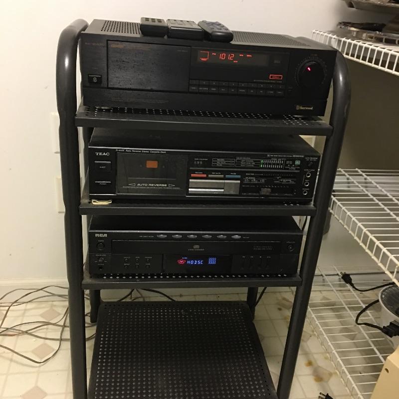 Stereo system and stand. Lot includes Sherwood RA-1240R stereo receiver, TEAC R-400X stereo cassette deck, RCA 5 disc CD changer and the stand it all sits on. All components powered on when tested. Stand measures 15” x 20” x 34”.