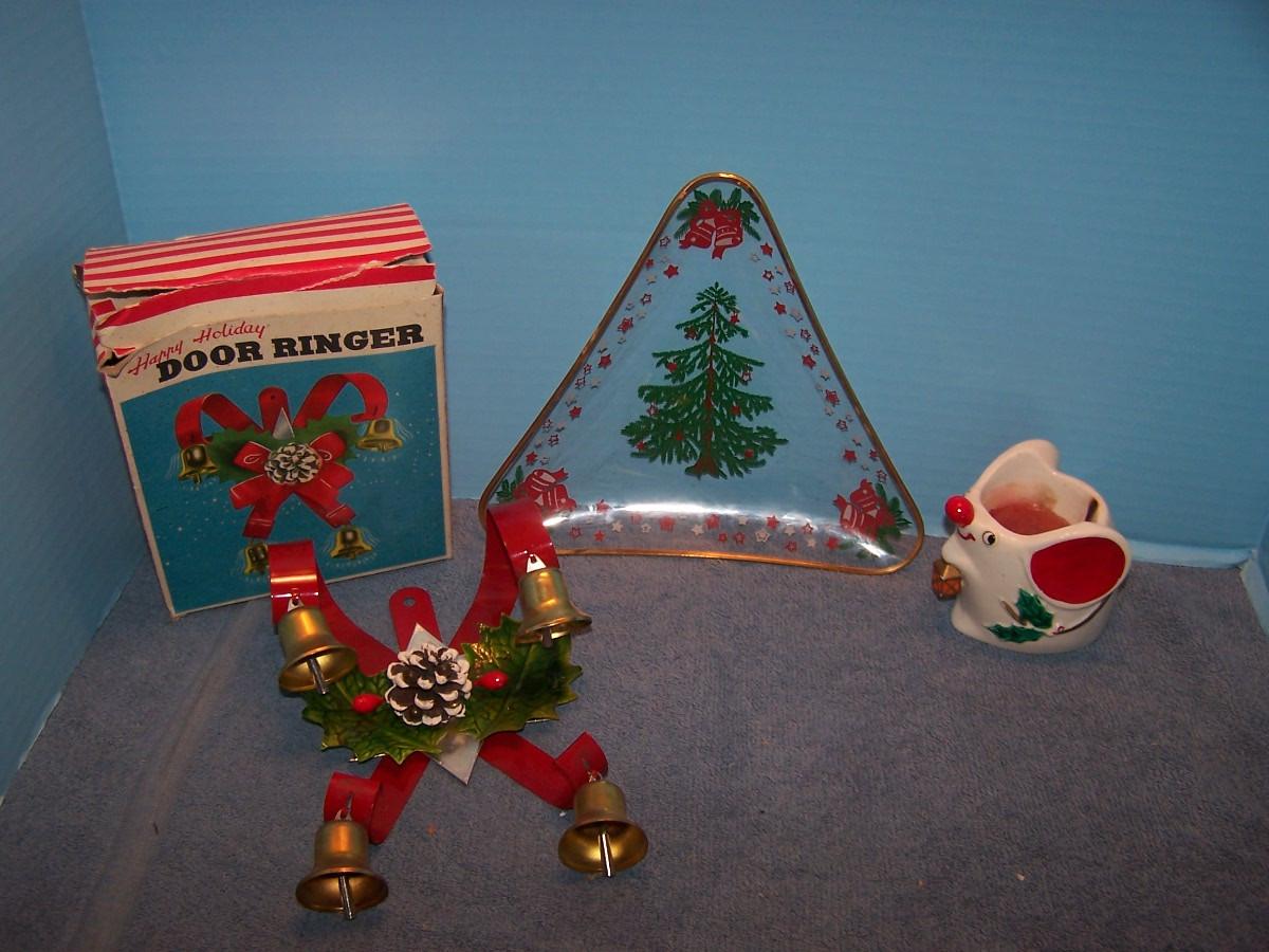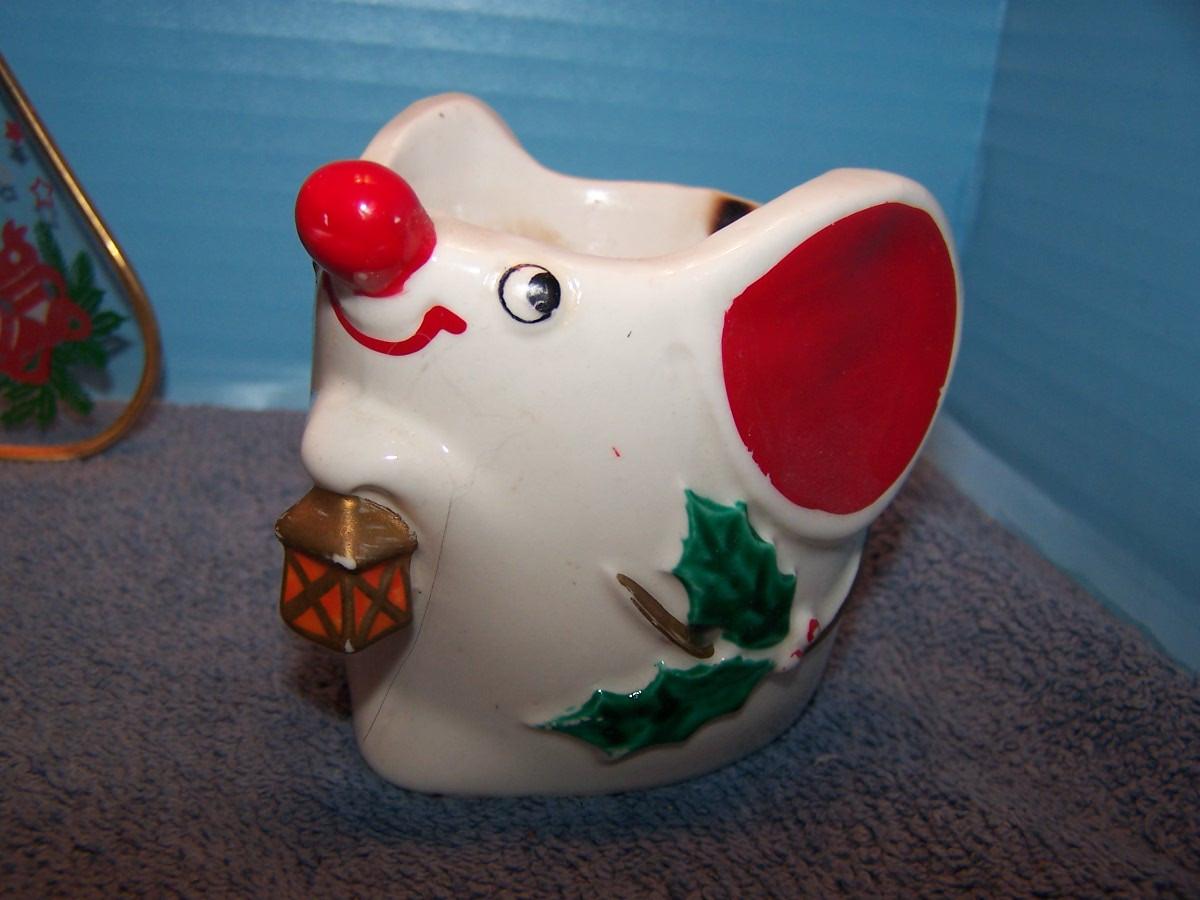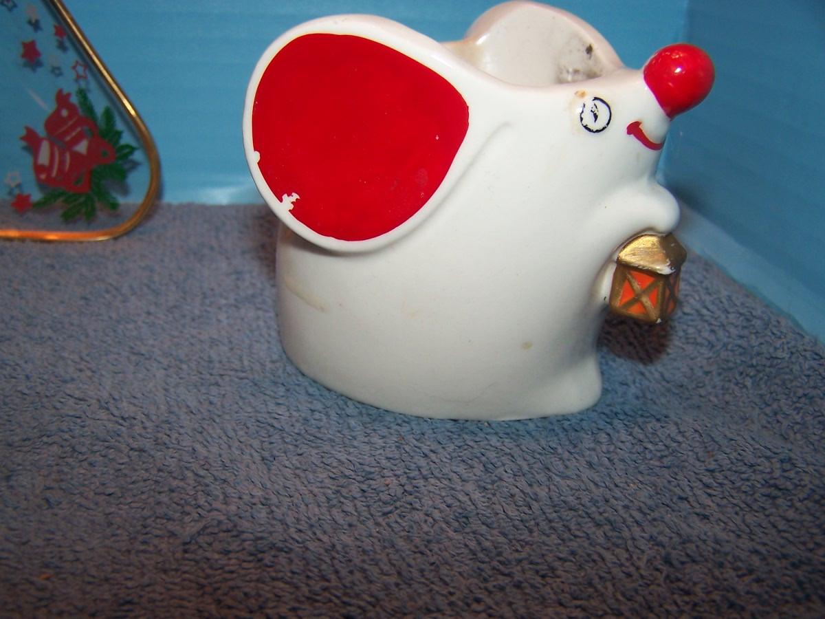 SOME ADORABLE MID CENTURY CHRISTMAS DECORATIONS!!! I THINK THE CERAMIC MOUSE CANDLE HOLDER WAS MADE BY HOLT HOWARD...THE GLASS DISH IS 7 3/4'' ACROSS. LIGHT WEAR...