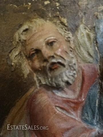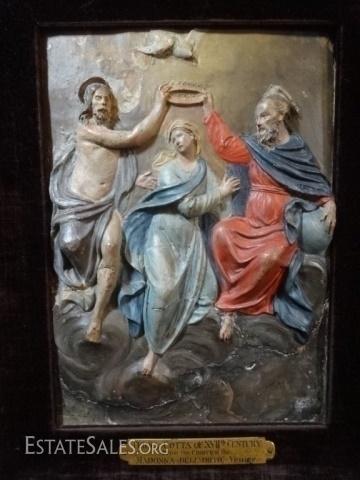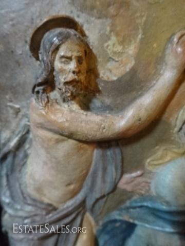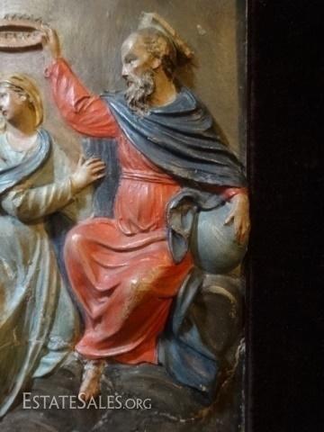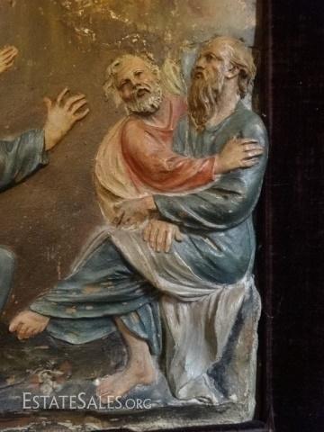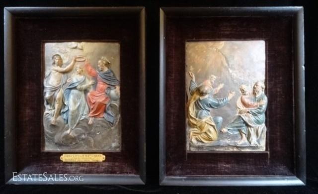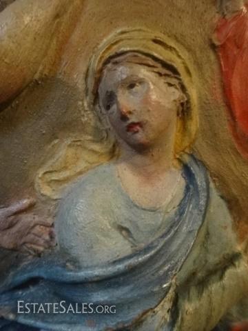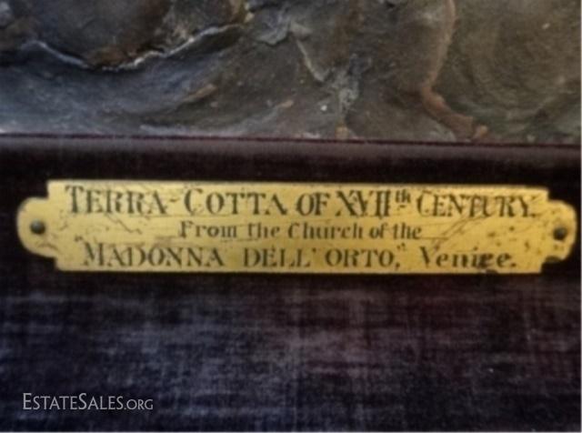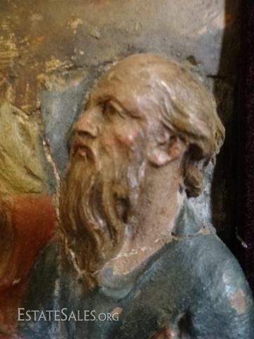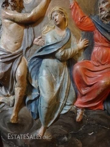 LOT 147: TWO PAINTED TERRA COTTA PLAQUES, AFTER 17TH CENTURY FROM THE MADONNA DELL'ORTO CHURCH IN VENICE, ITALY, INTRICATELY DETAILED, OVERALL VERY GOOD CONDITION COMMENSURATE WITH AGE, WITH SOME CRACKS AND SMALL CHIPS, ONE FIGURE MISSING FOOT, FRAMED SIZE 13" X 17", IMAGE SIZE 8" X 11", SKU298.23