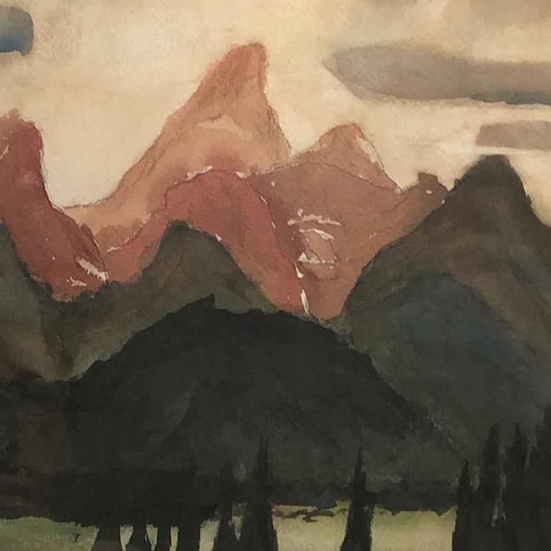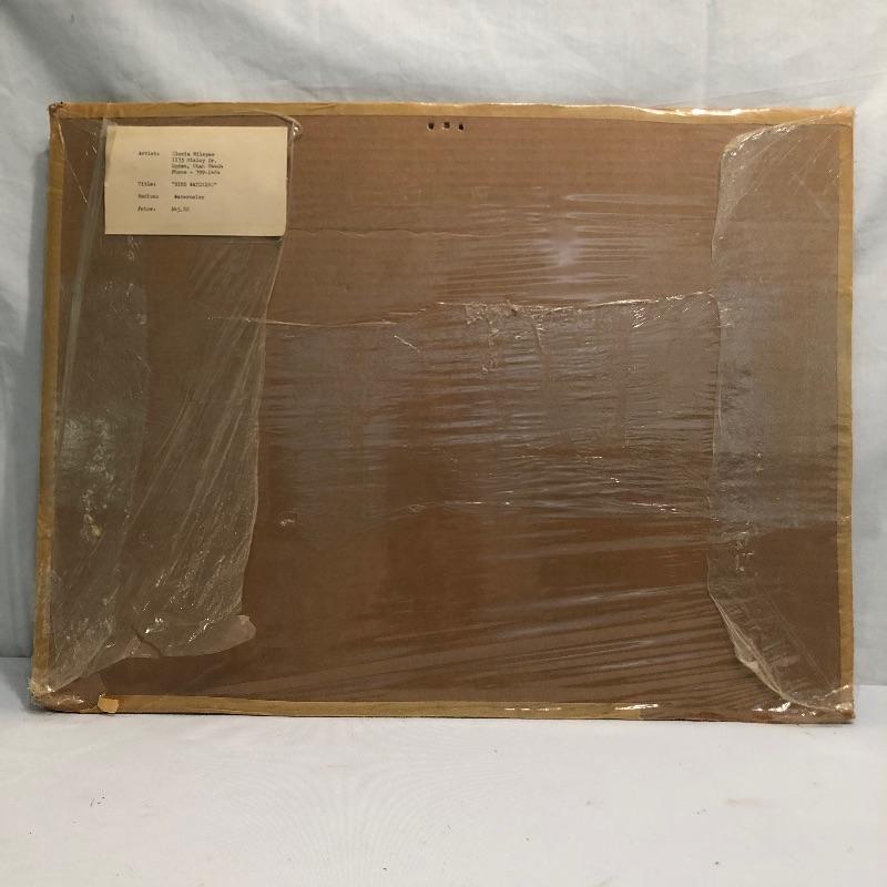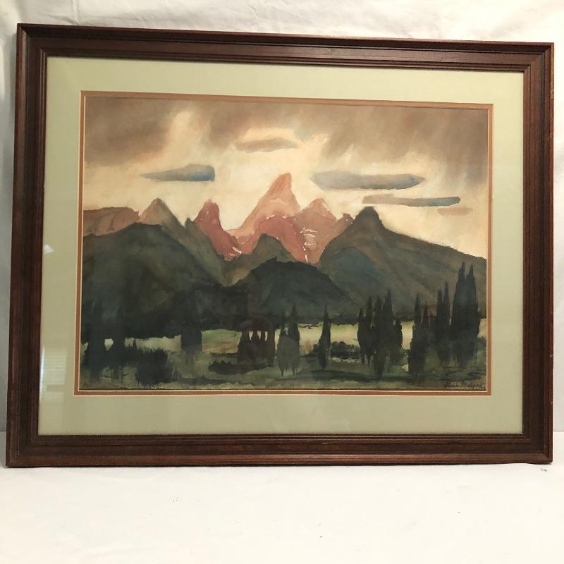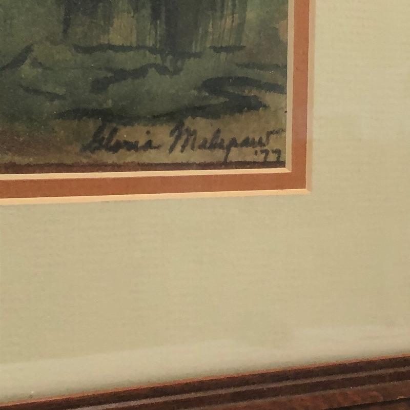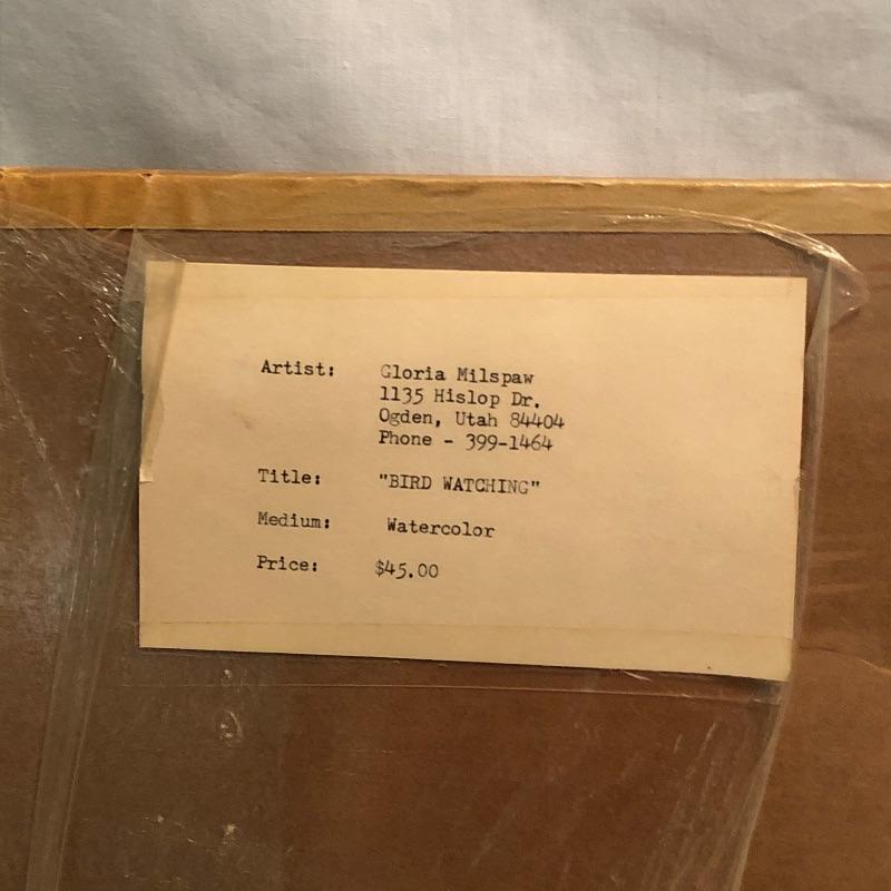 These two paintings by artist Gloria Milspaw are both signed watercolors. The framed piece is a stunning landscape painting that is matted and mounted in a reddish brown wood frame. The unframed piece is titled “˜Birdwatching’; it is set in a matte currently that is a little bent on the corners and could do with getting fresh matting when it is framed.