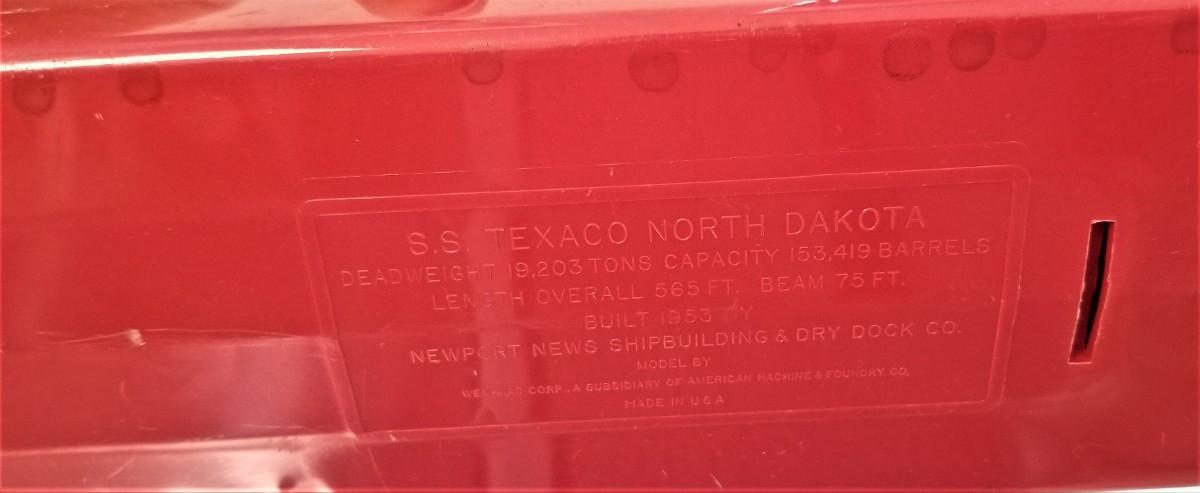 Two vintage Texaco ship models - the larger is the SS Texaco North Dakota - BL 1953 - 27" long - has wheels on the bottom. The other is a metal model of the Texaco Fire Chief, 9" long, from Ertl Collectibles, 2000 Edition 1. Both in good condition.