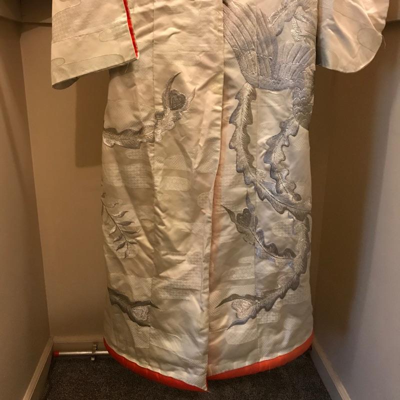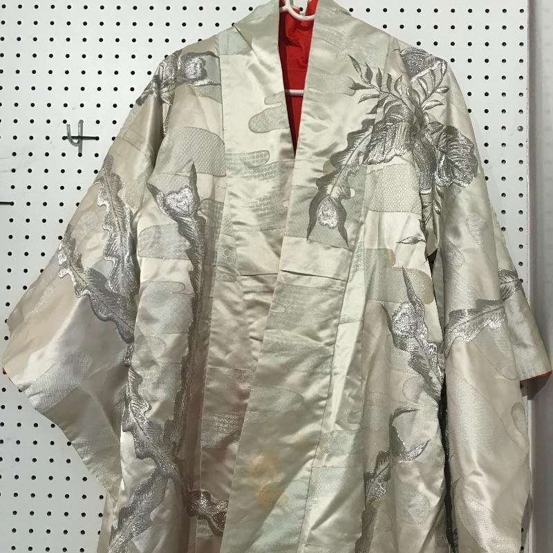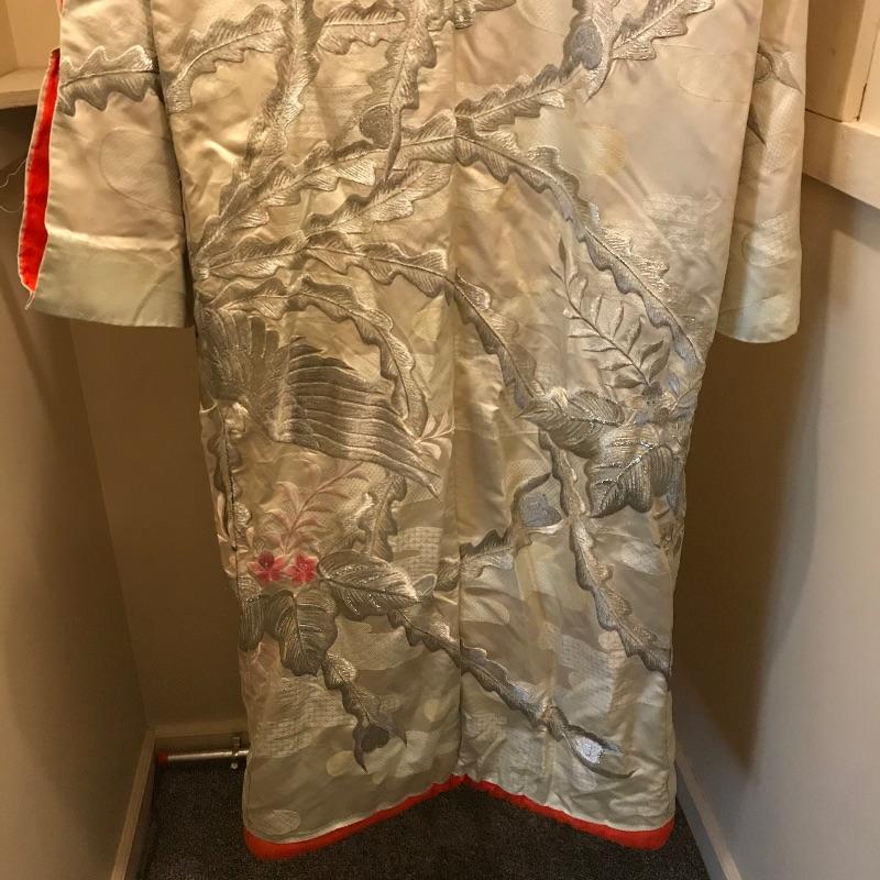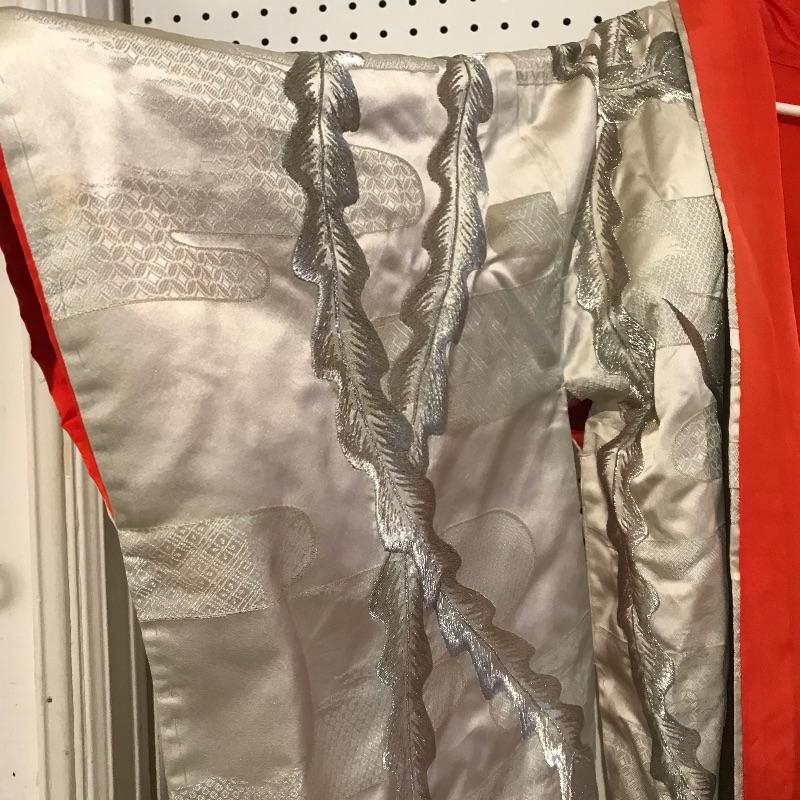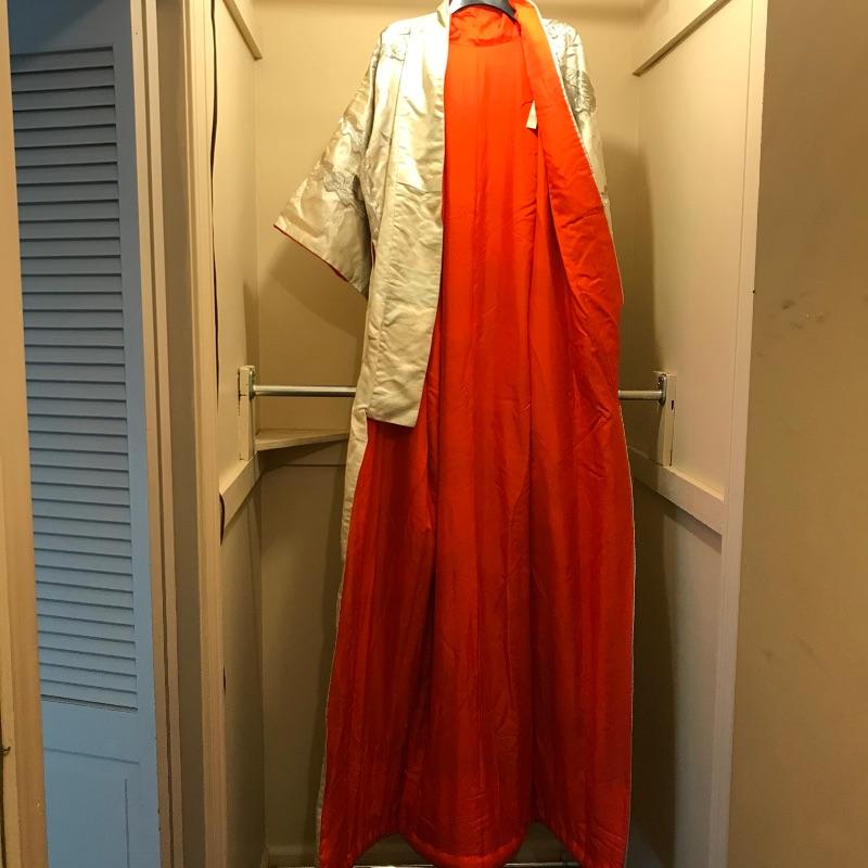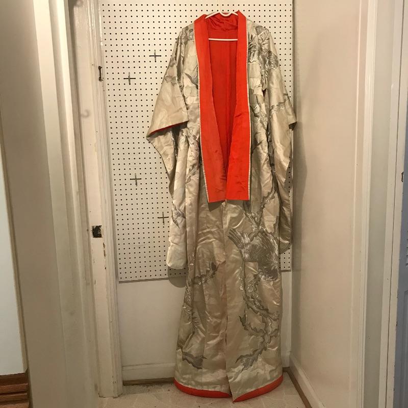 Wow, Stunning. this piece is amazing. Beautiful silver ceremonial kimono with pink flowers, golden avian eyes and a bright royal orange inner lining. The kimono is 6 feet long and in amazing condition, appearing hand made with its weighted bottom. See photos. Lots of wrinkles from storage can be steamed out. Owner thinks it is authentic but we can not verify. Shipping available.