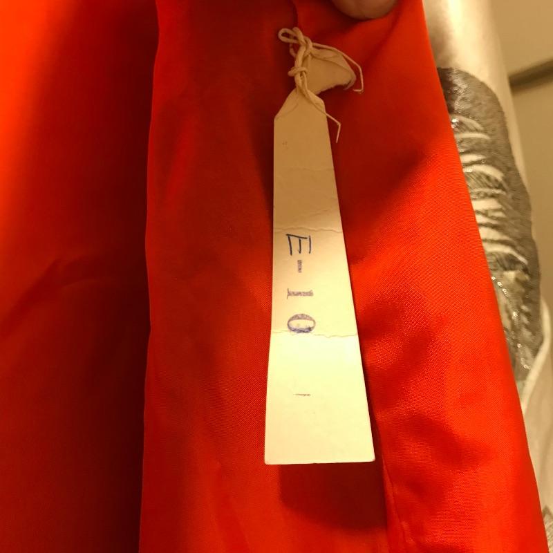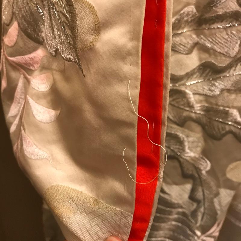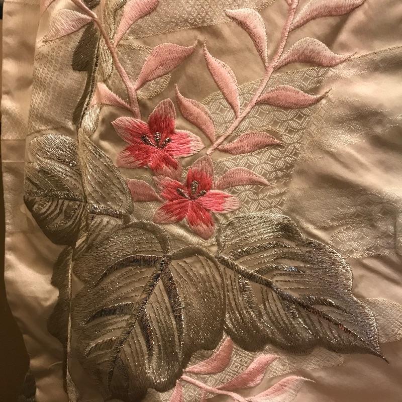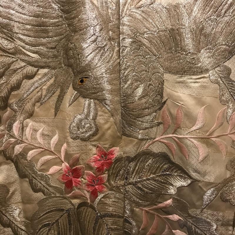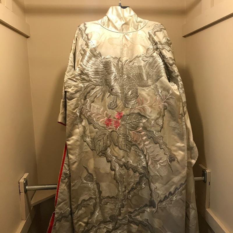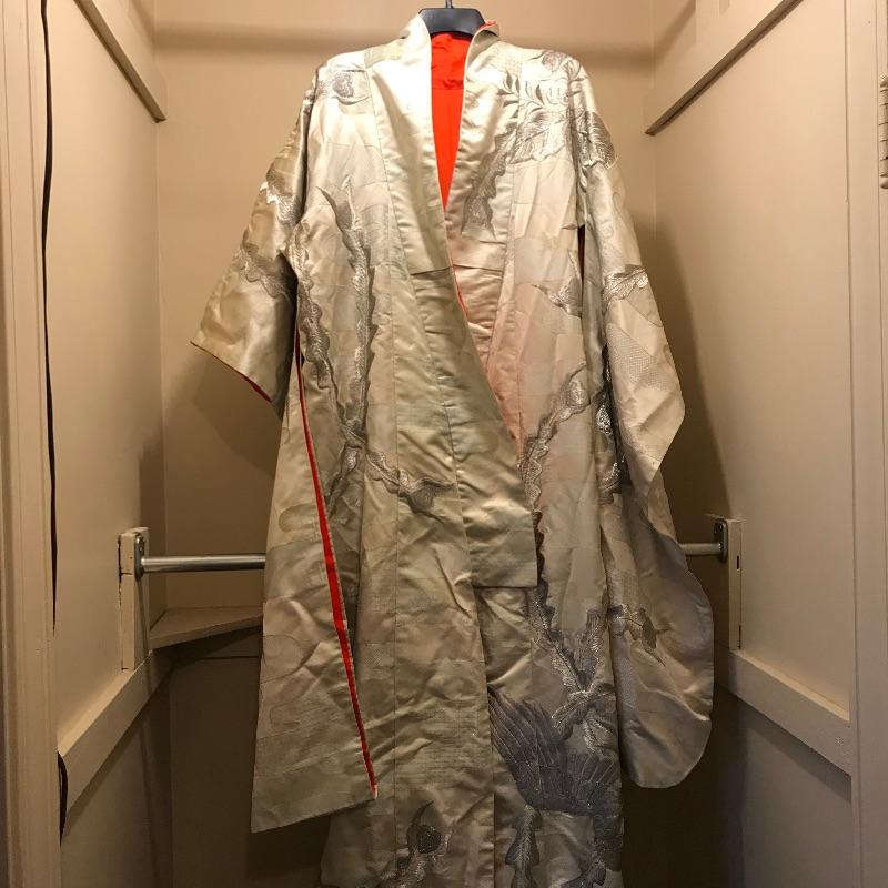 Wow, Stunning. this piece is amazing. Beautiful silver ceremonial kimono with pink flowers, golden avian eyes and a bright royal orange inner lining. The kimono is 6 feet long and in amazing condition, appearing hand made with its weighted bottom. See photos. Lots of wrinkles from storage can be steamed out. Owner thinks it is authentic but we can not verify. Shipping available.