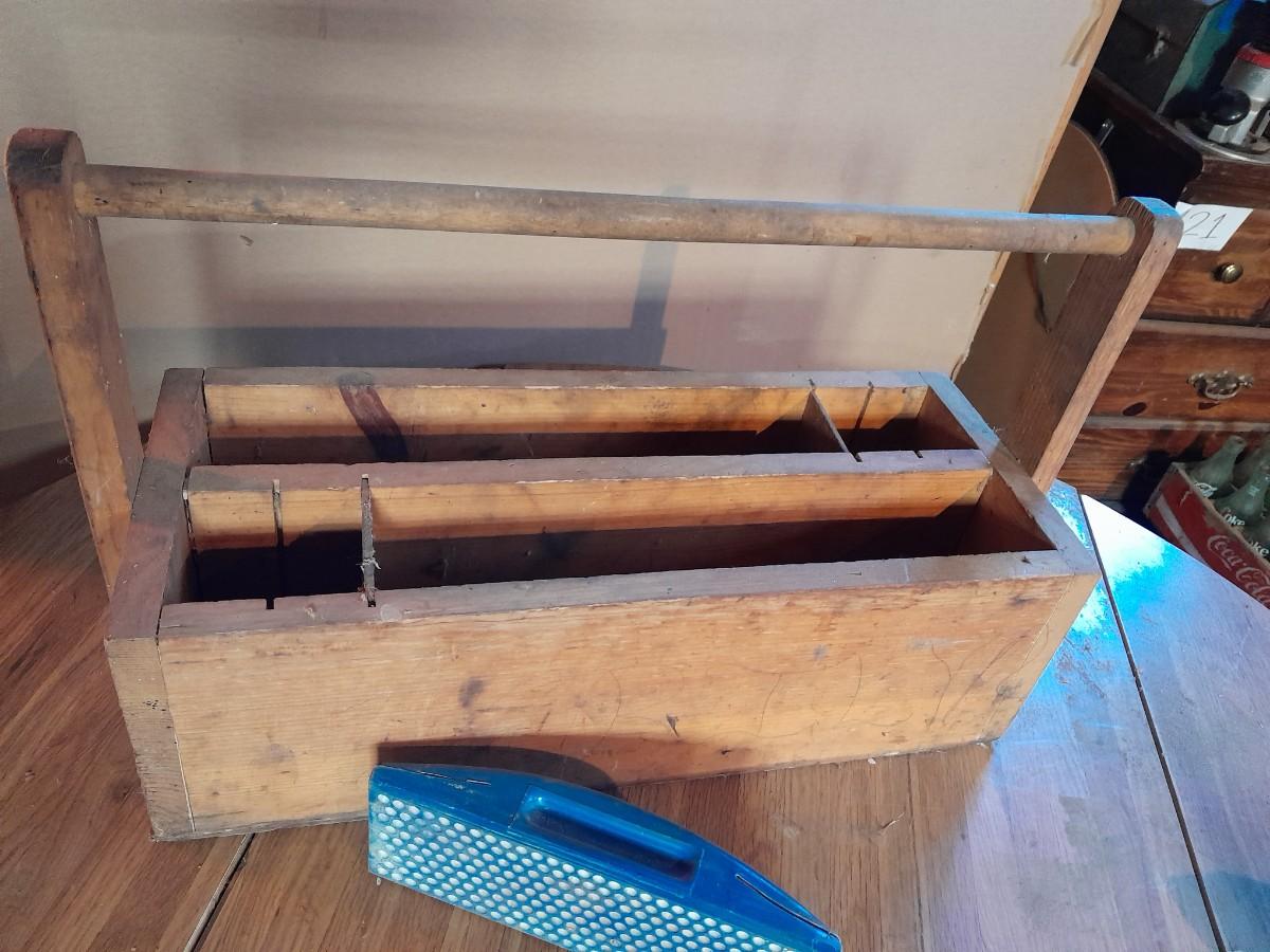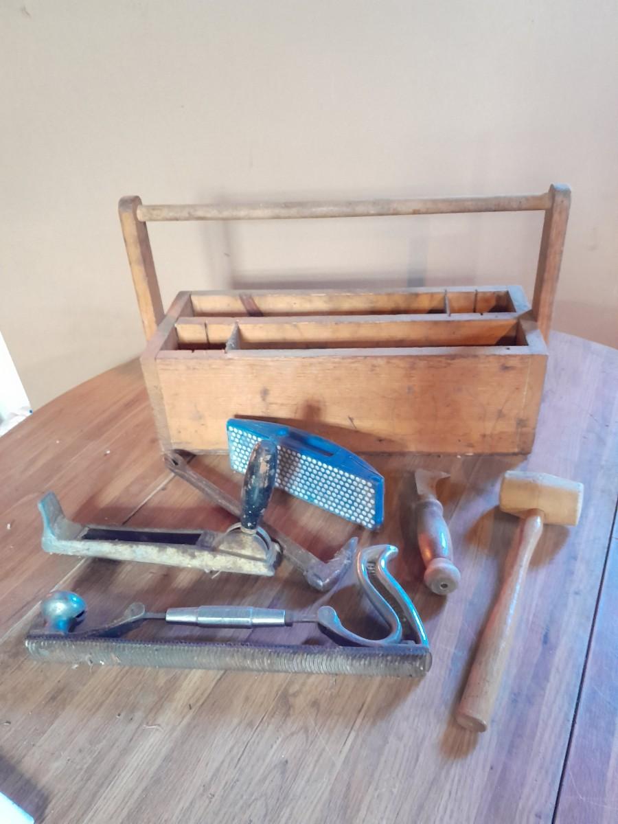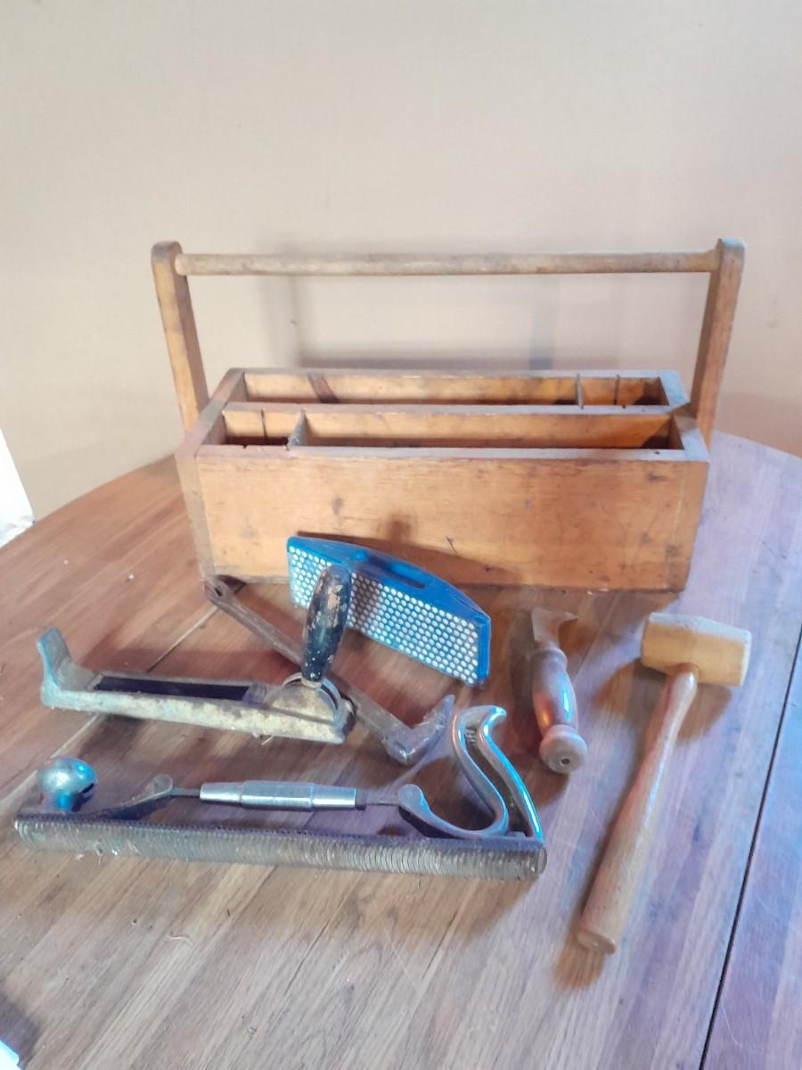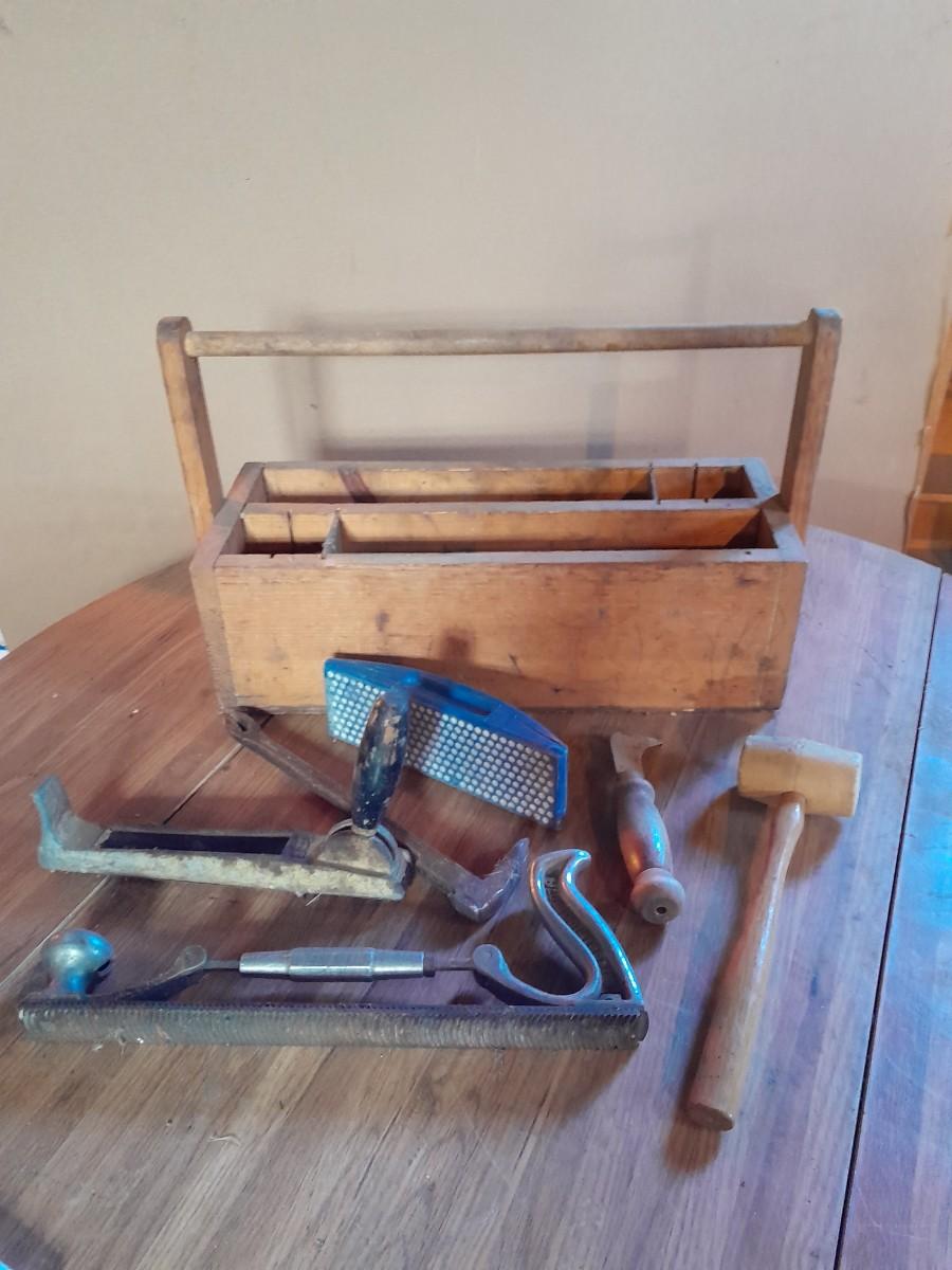 WOODEN TOOL CRATE WITH ASSORTMENT OF TOOLS OLD PLANERS AND MORE