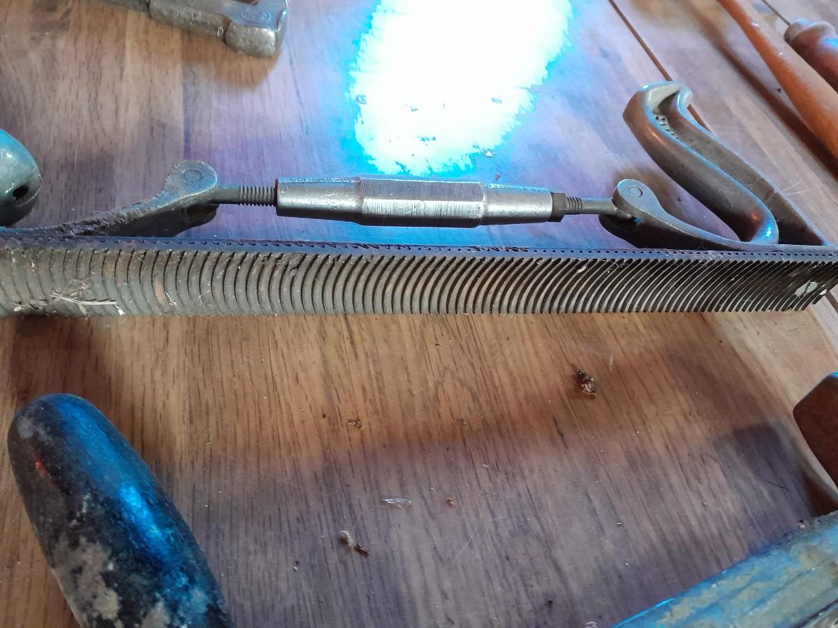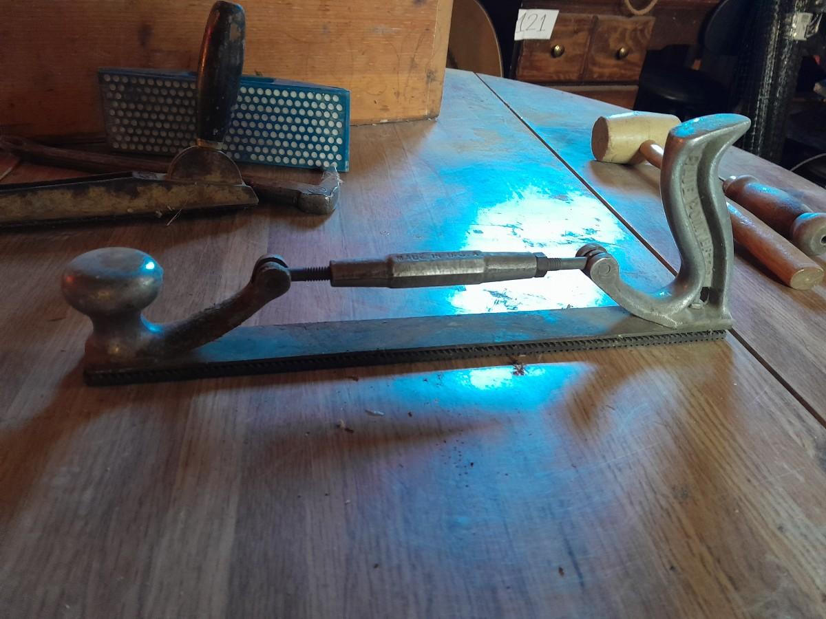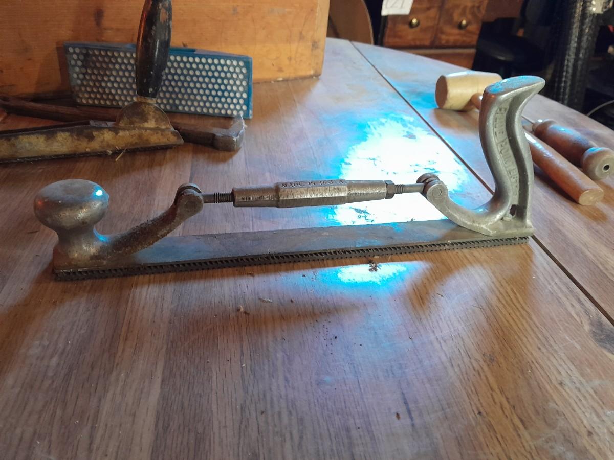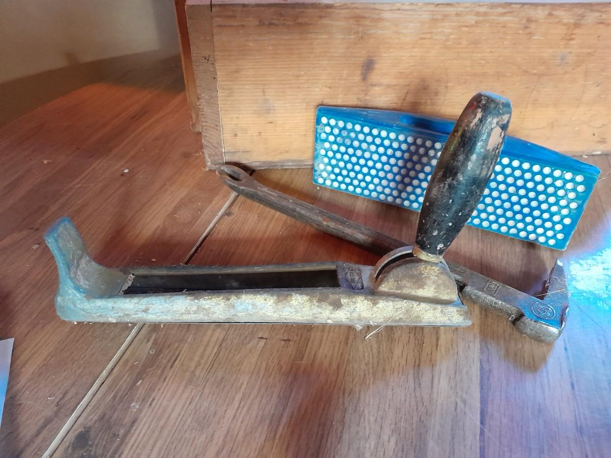 WOODEN TOOL CRATE WITH ASSORTMENT OF TOOLS OLD PLANERS AND MORE