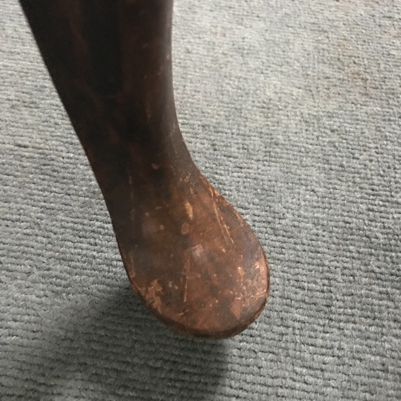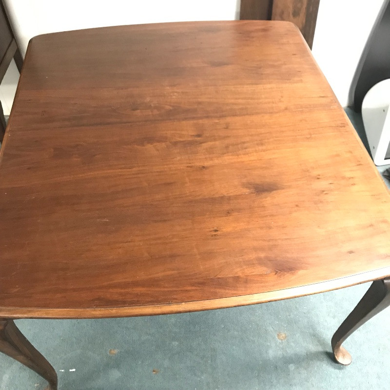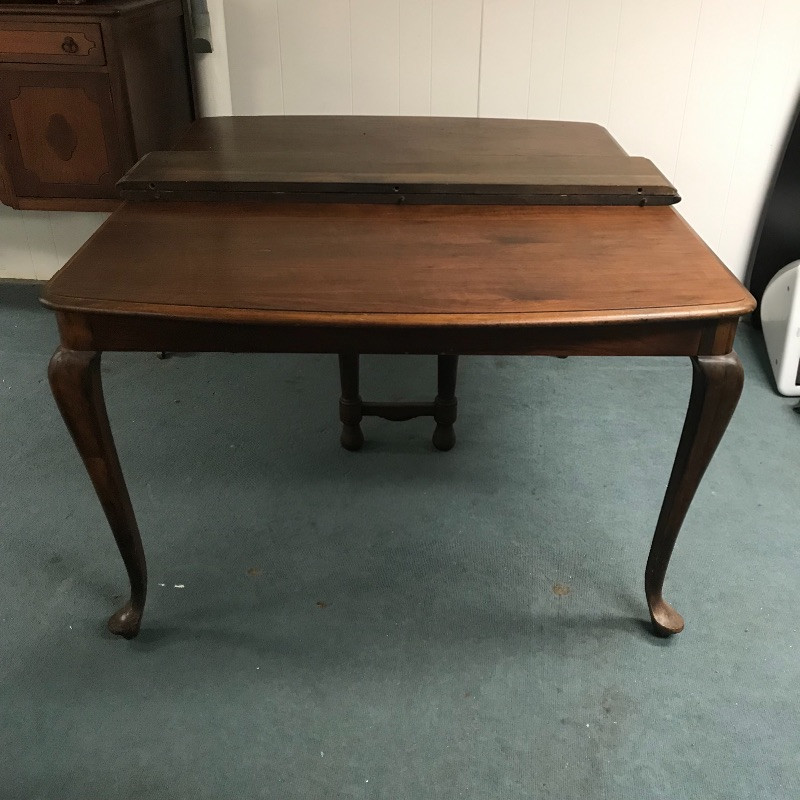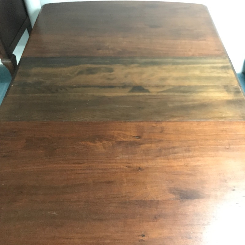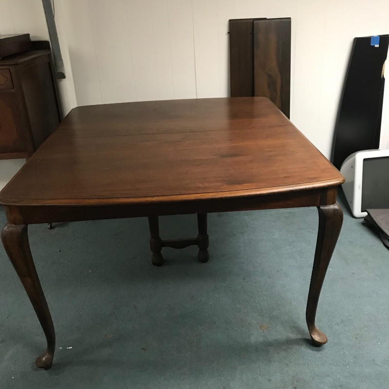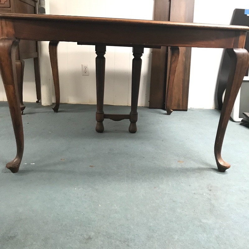 Very nice dining table with beautiful wood grains and stabilizing legs. Table comes with two leaves that fit perfectly, but they have a slightly darker, more ashy coloring. The table measures 54” x 45” x 29” with each leaf adding 9” (72” x 45” x 29”). Table is sturdy and has a lot of life left in it with some blemishes noted in photos. See photos. Check out lots 147 and 149 for complementing credenza and chairs! No shipping, please bring help to load. The table is located in the basement and will require at least one flight up stairs. Contact us if you would like some recommendations for furniture moving services.