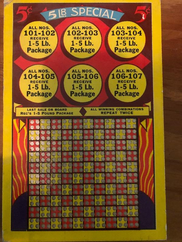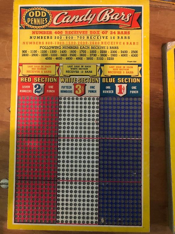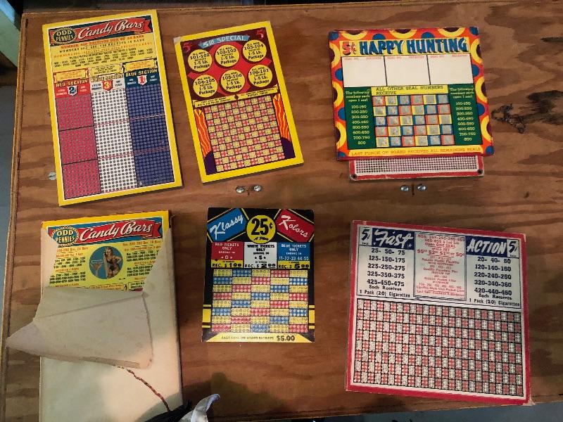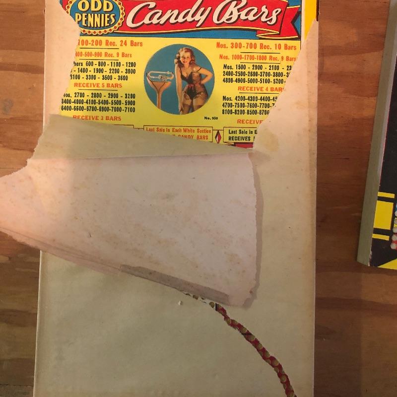6 Boards: Candy bars, 5 pound special, happy hunting, fast action, Klassy Kolors, candy bars with pinup girl_Vintage used condition