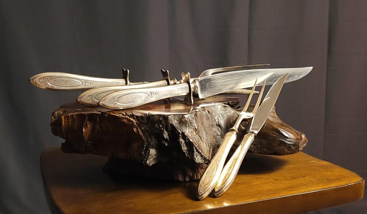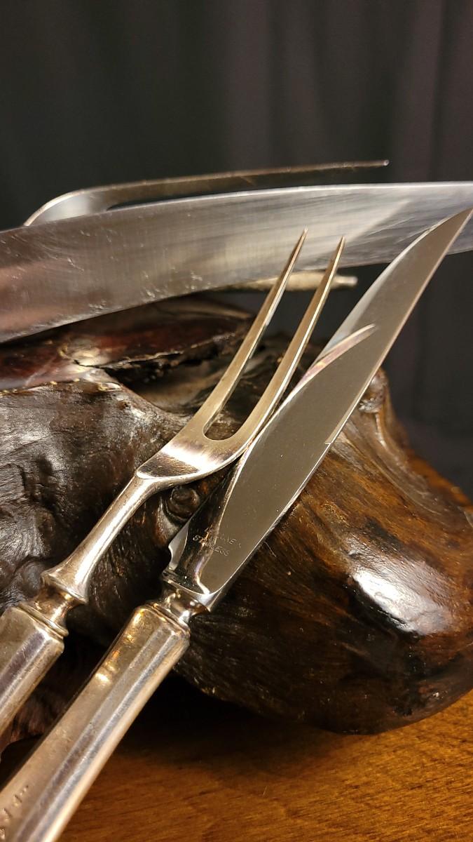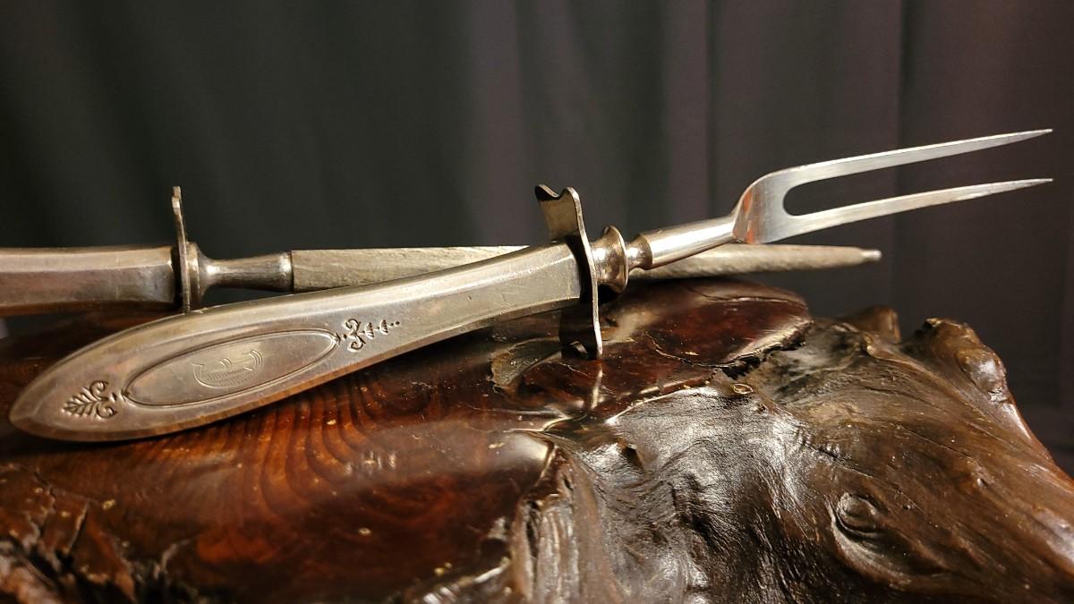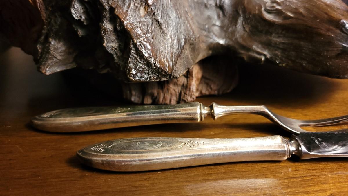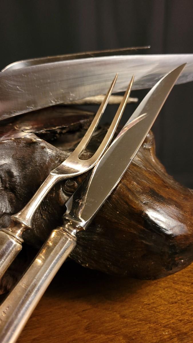 Lot 148: (2) Vintage Silverplated COMMUNITY Carving Sets (Large & Small) w/ 14" Sharpening Rod MONOGRAMMED "E"