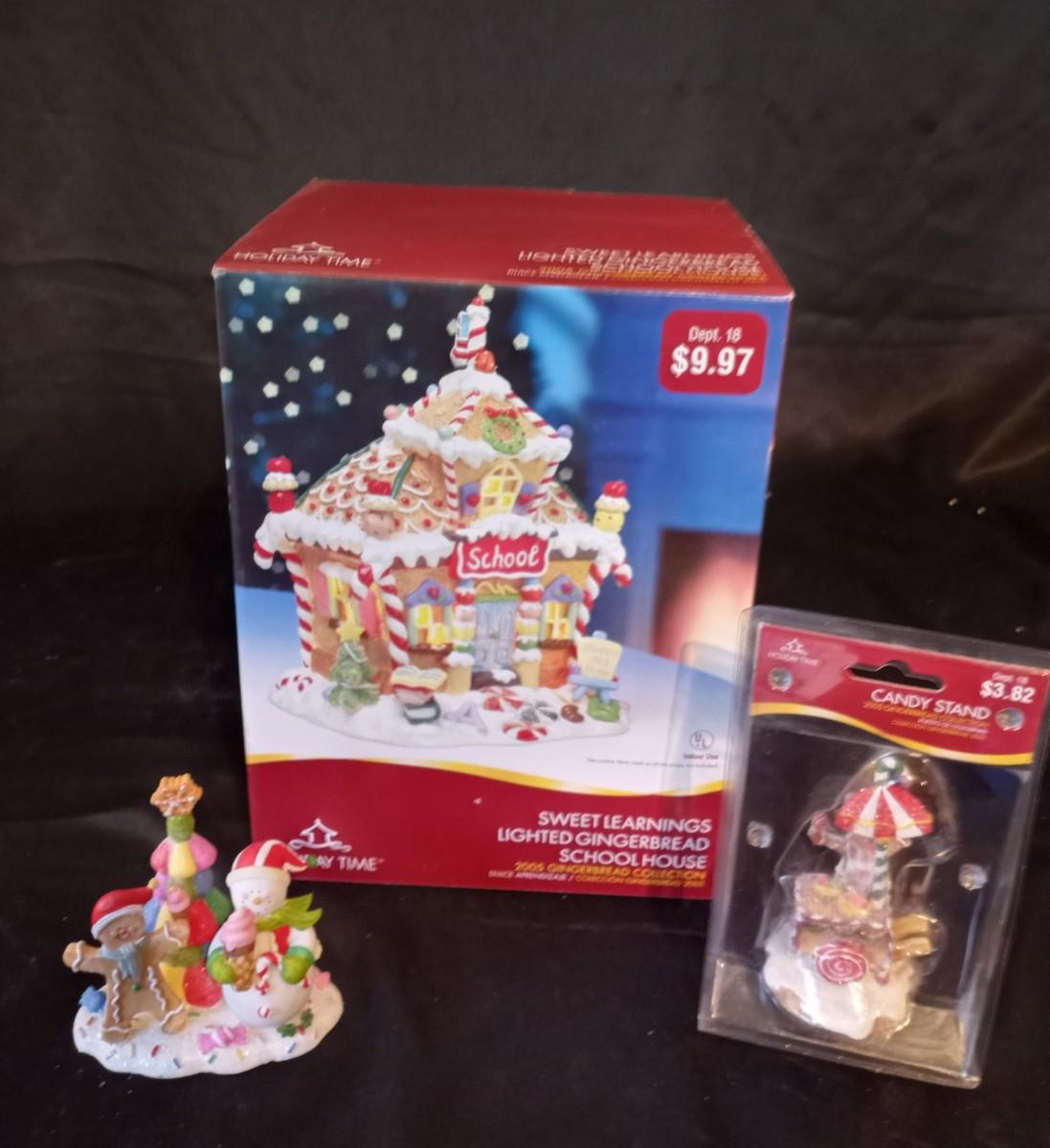 LOT 148 LIGHTED GINGERBREAD HOUSE SCHOOL AND CANDY STAND