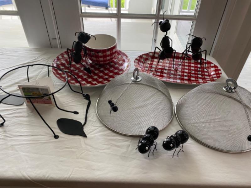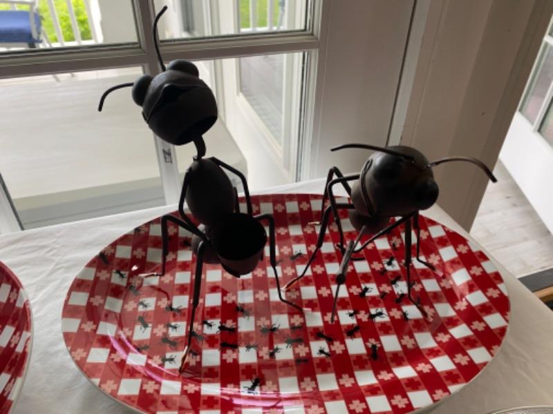 Cute ant outdoor serving set. Small metal ants for table decor and watermelon holder