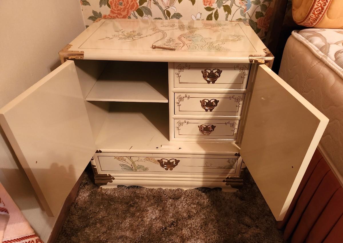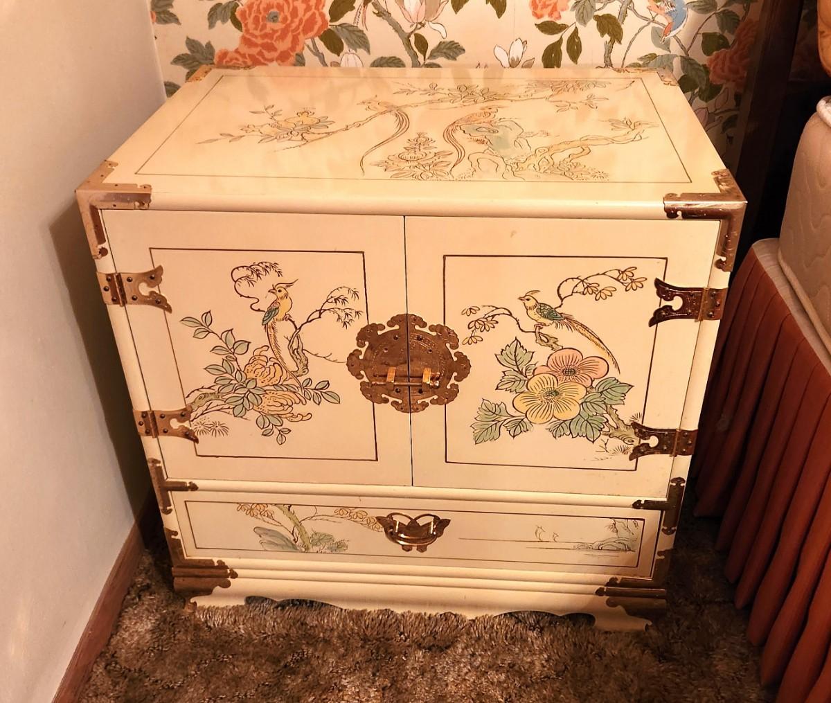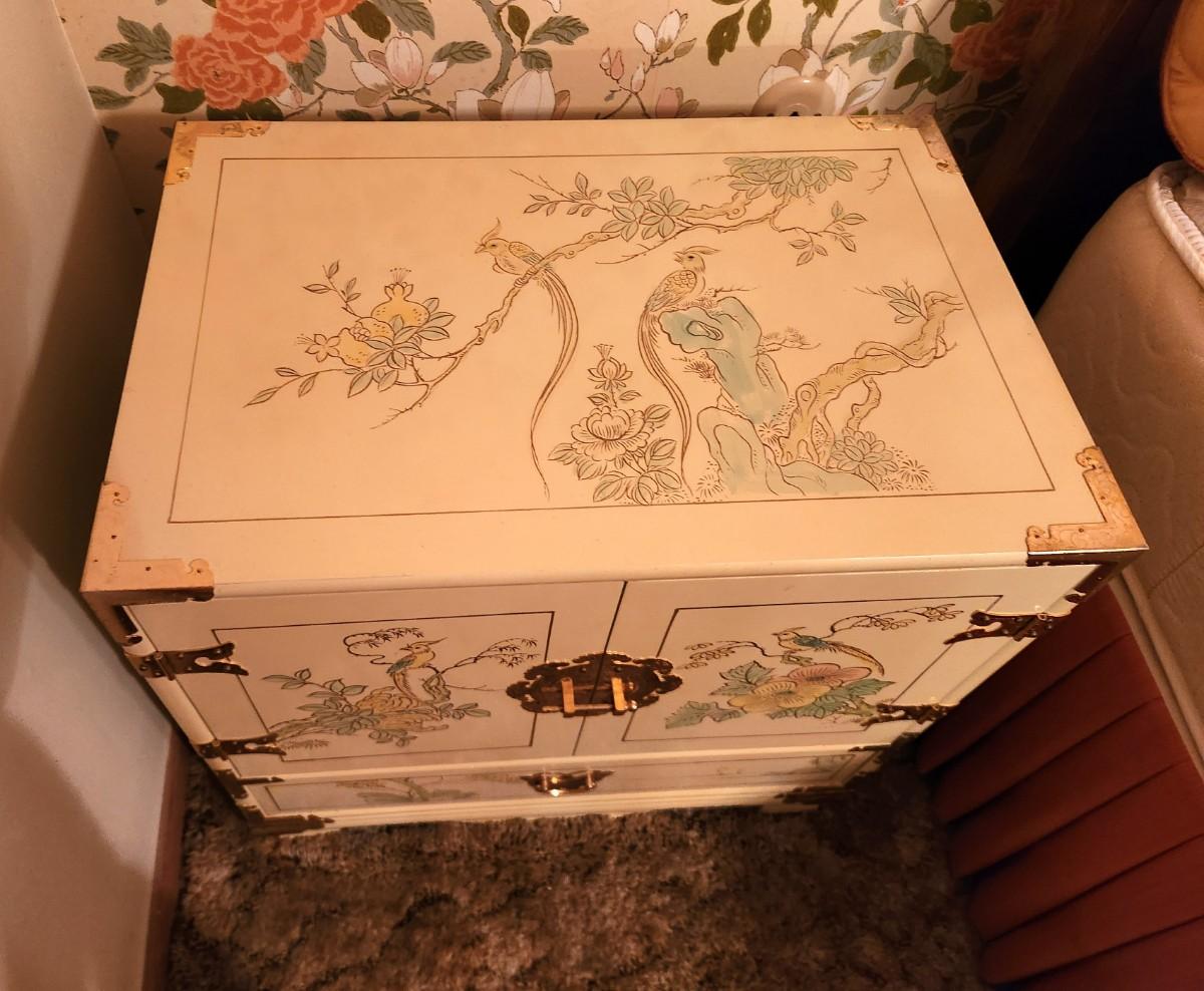 Asian Style nightstand - matches the lingerie chest in an earlier lot. Heavy floral design, brass fittings. 4 drawers. 24" across, 16" deep, 24" tall.
