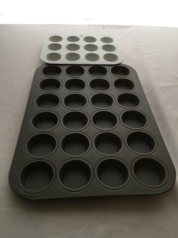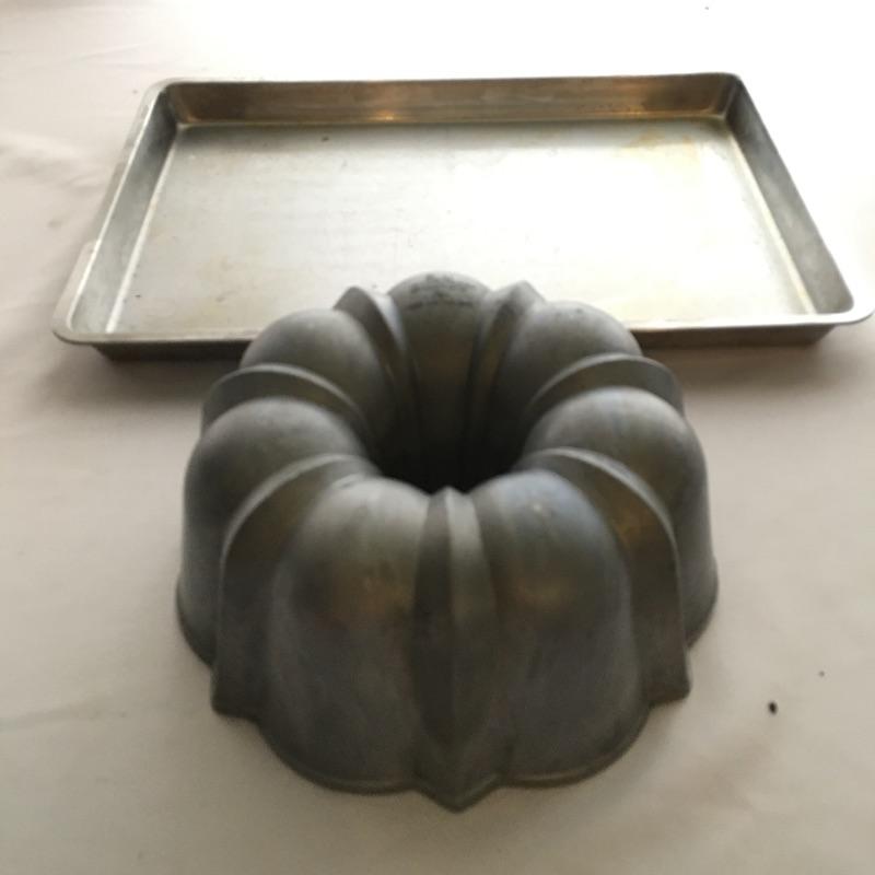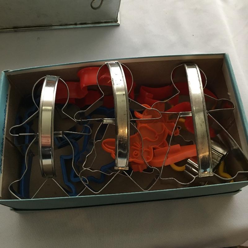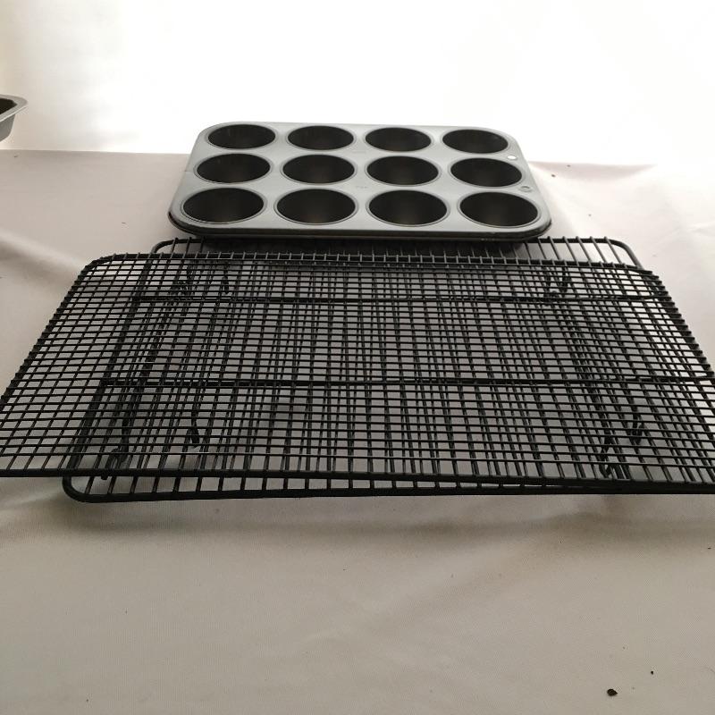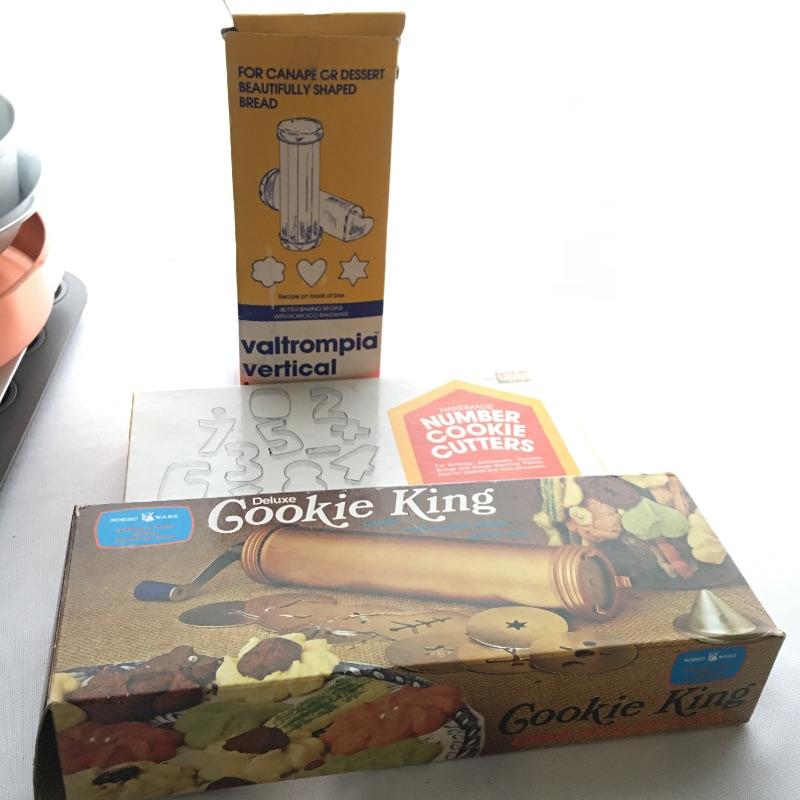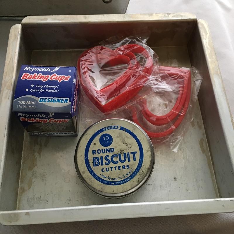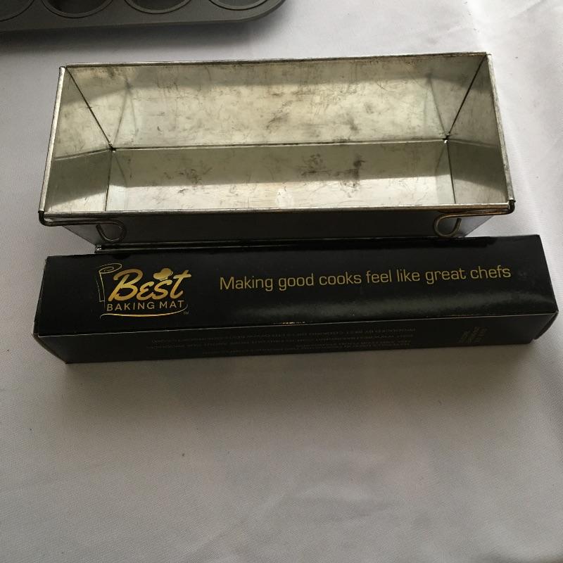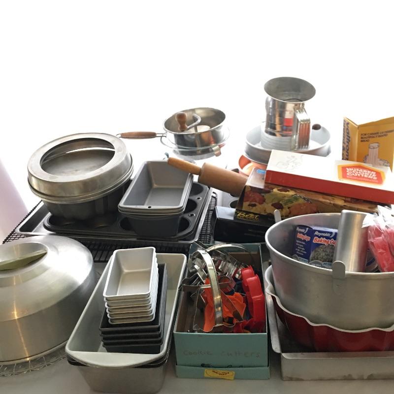 Baking essentials. Lot includes mini Bundt pan, muffin pans, cake pans, bread pans, cookie cutters, rolling pin and oodles more. You will be ready for just about any baking needs that arise. Largest baking sheet measures 11.25” x 16.25”.
