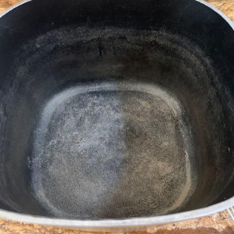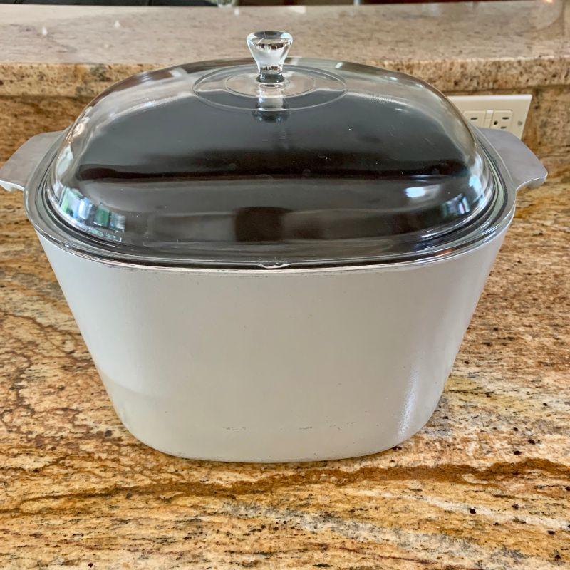 Big enough for those family gatherings. Cast aluminum Dutch oven with dome glass lid. Some hard water stains in the bottom. Needs a good scouring.