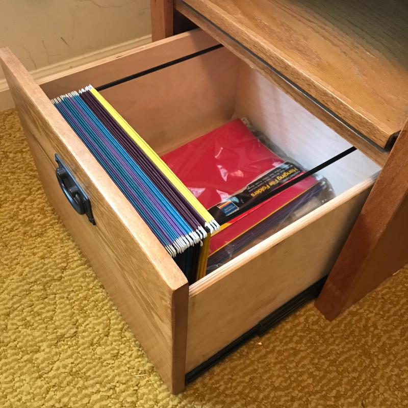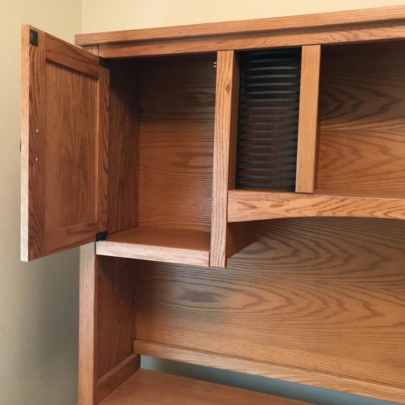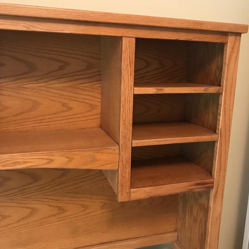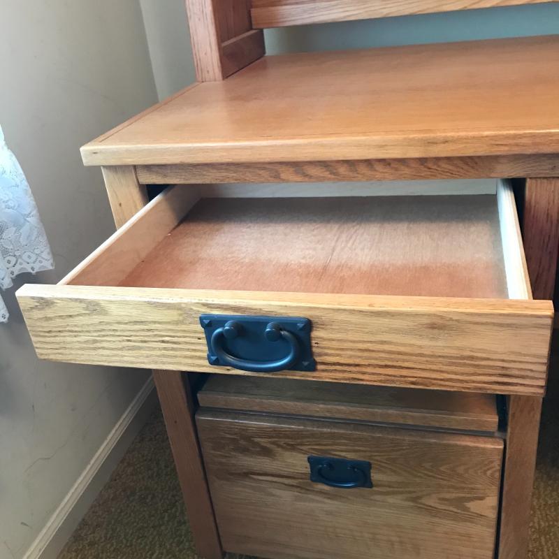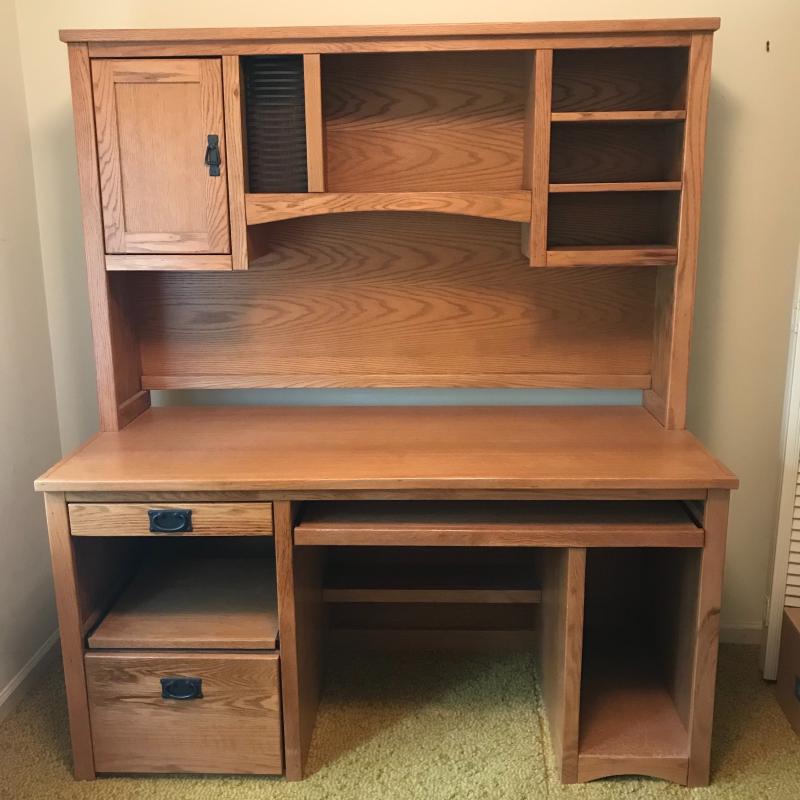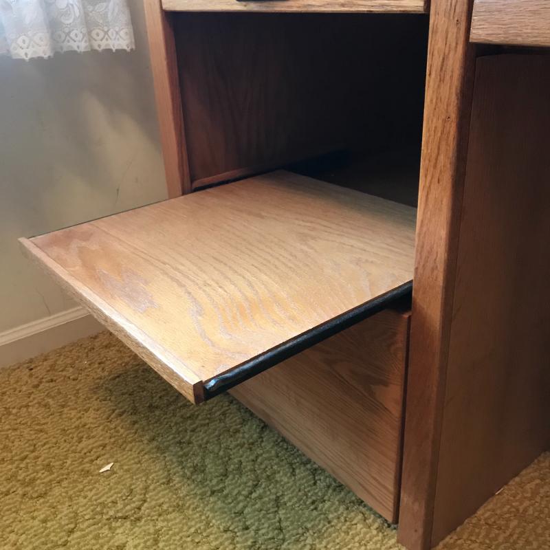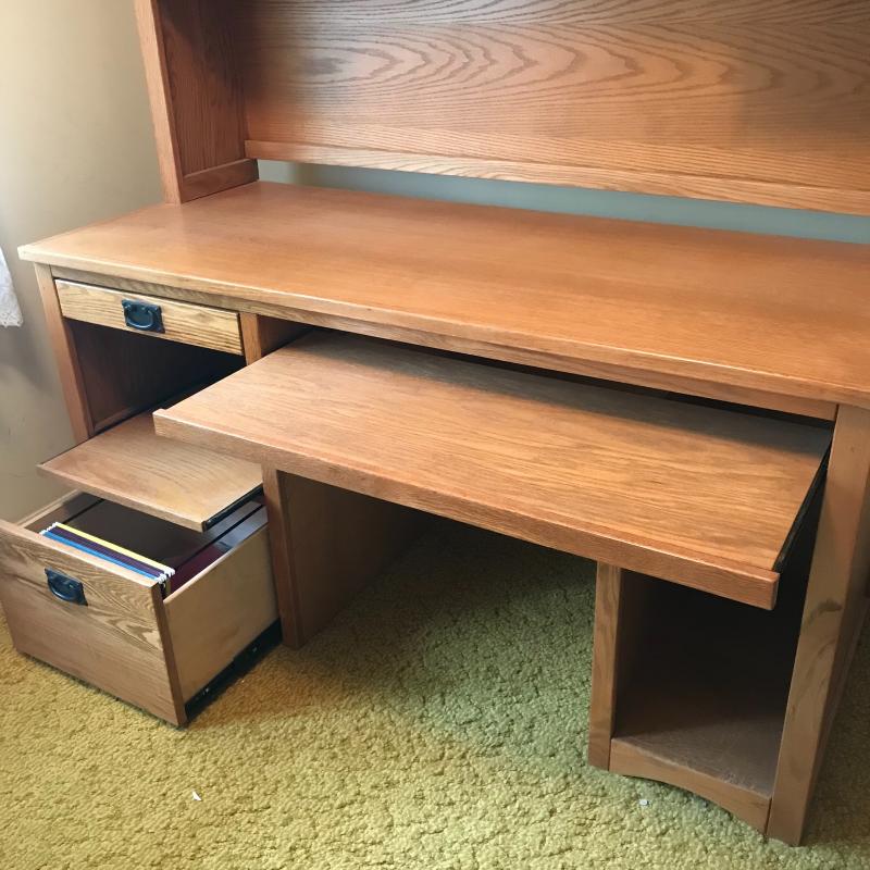 Beautiful and sturdy, this desk was well crafted and cared for. Rolling shelves for keyboard and printer, file cabinet and tower cubby make this the perfect office desk. Desk top and bottom are secured by screws and cd organizer plates can be removed. Some scratches in tower cubby, see photos. Desk measures approx. 59.5”x24.75”x68.25”. Local pick up only, the desk is heavy, please bring help to load.