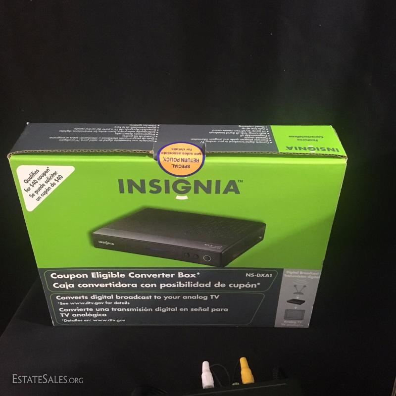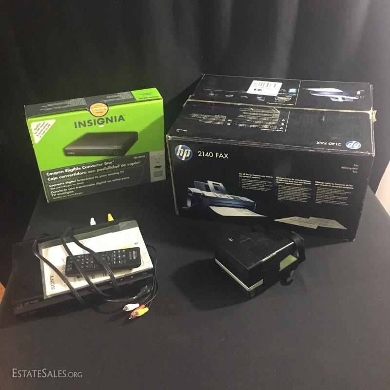 HP 2140 Fax machine, Polaroid Camera Sun 600, Sony DVD player with remote and Insignia Digital Converter Box.