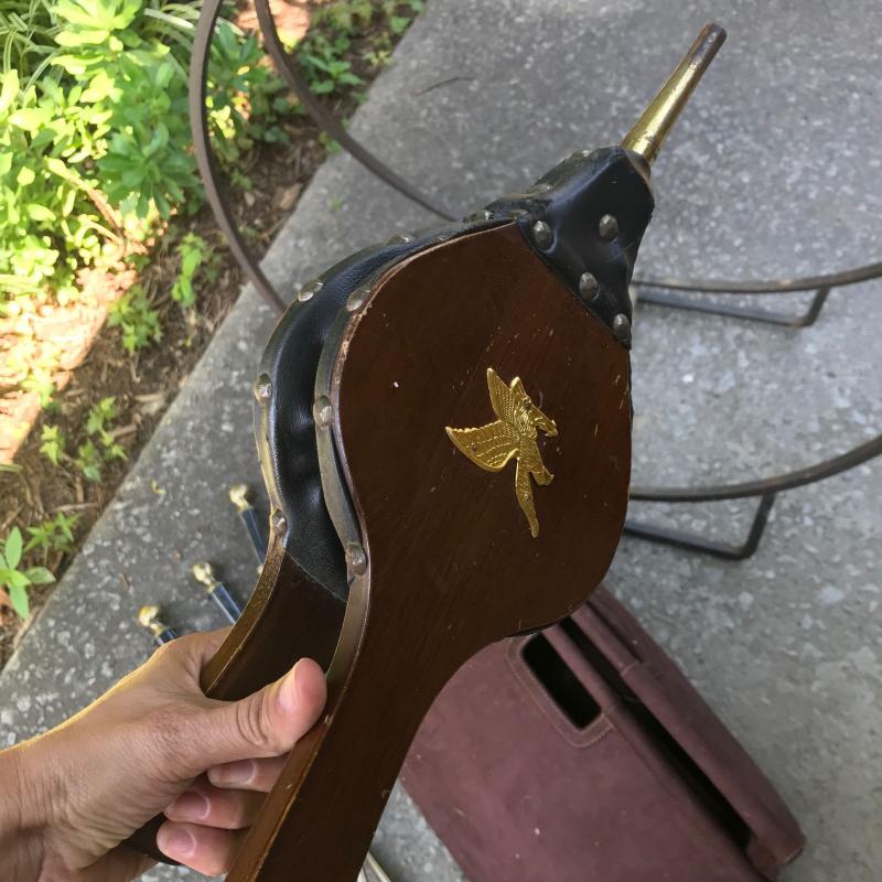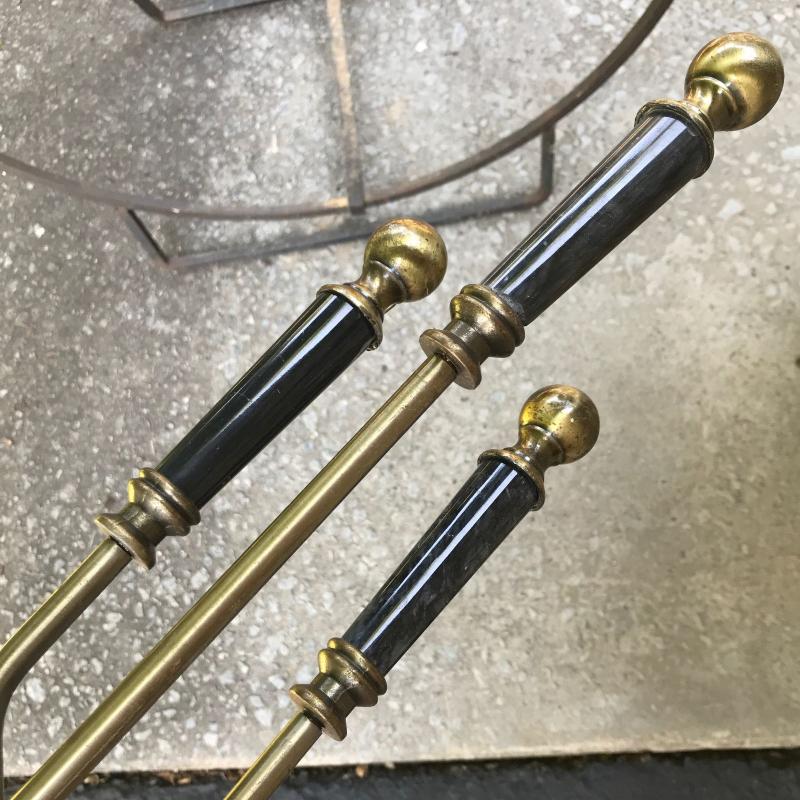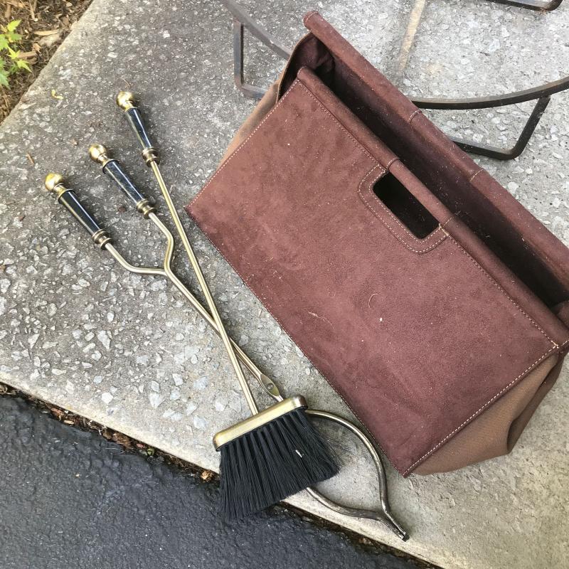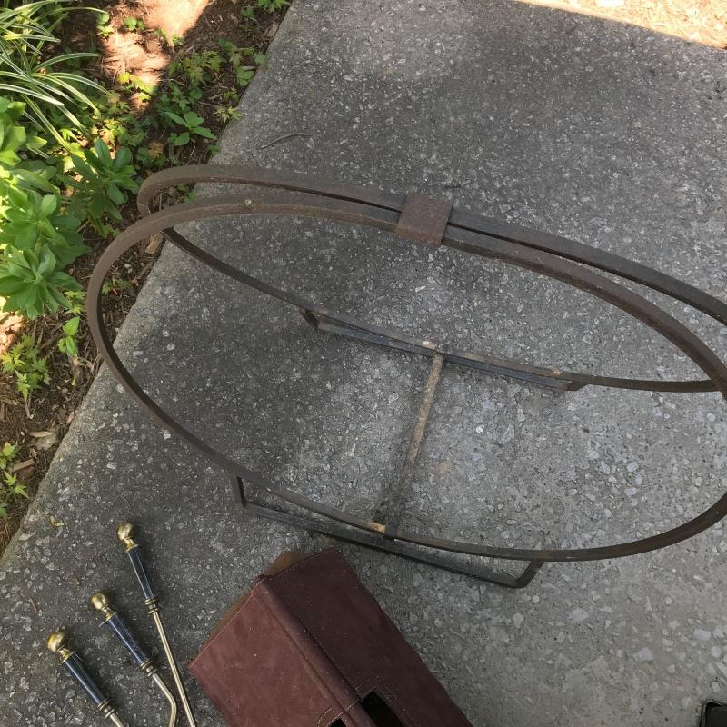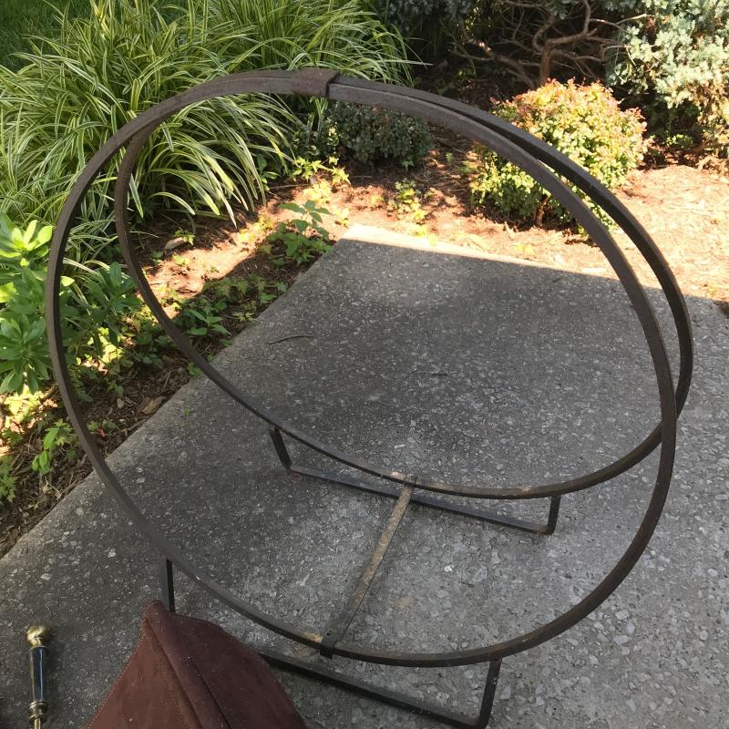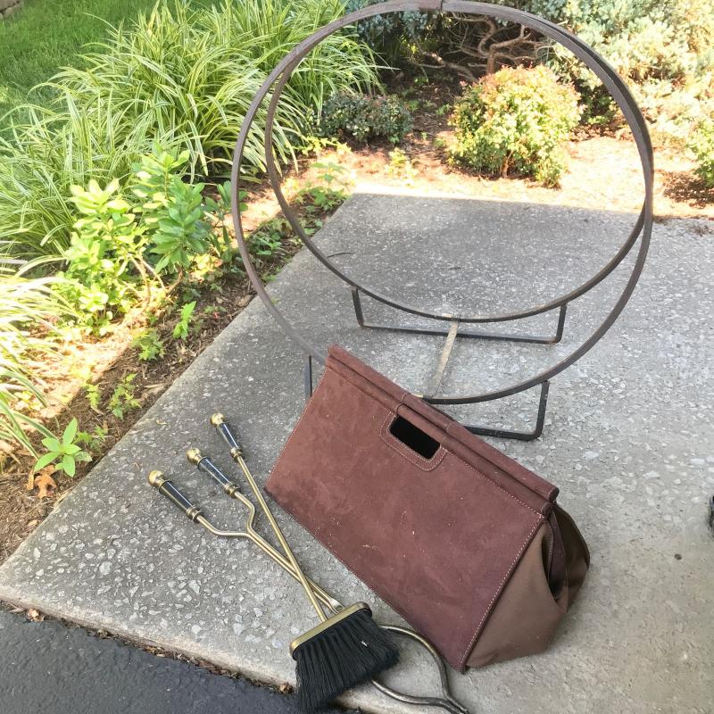 Lot includes circular metal firewood stand (approx. 30.5” x 31”), leather firewood carrier, fireplace tools and fire bellow. No shipping.