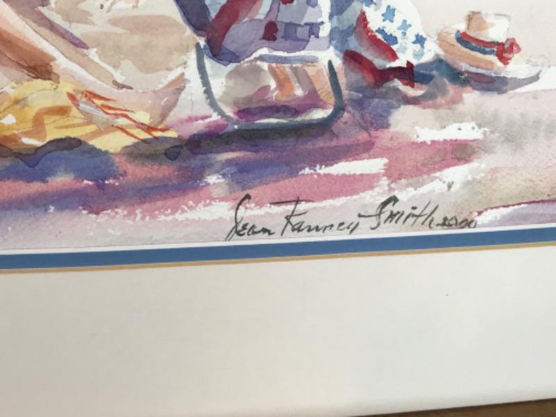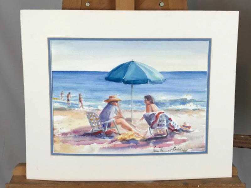 Pair of Jean Ranney Smith signed original watercolor paintings.. “Friends At The Beach” measures 20”x16” including mat