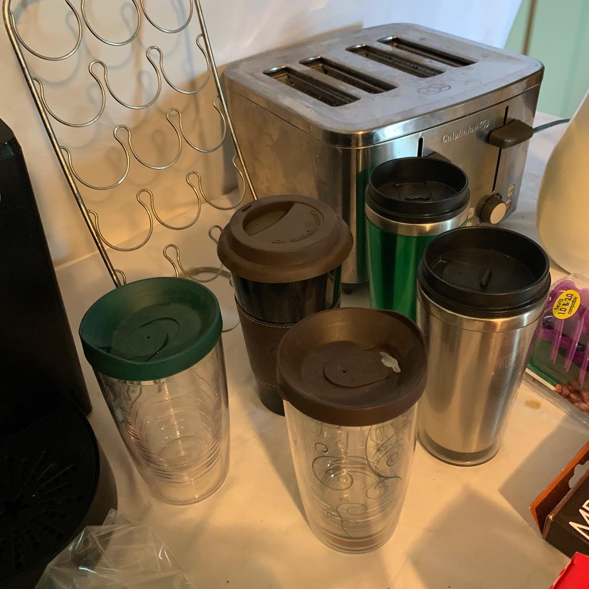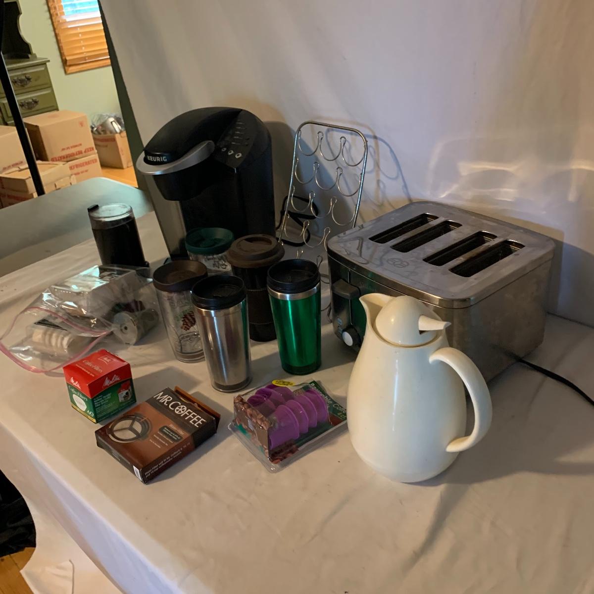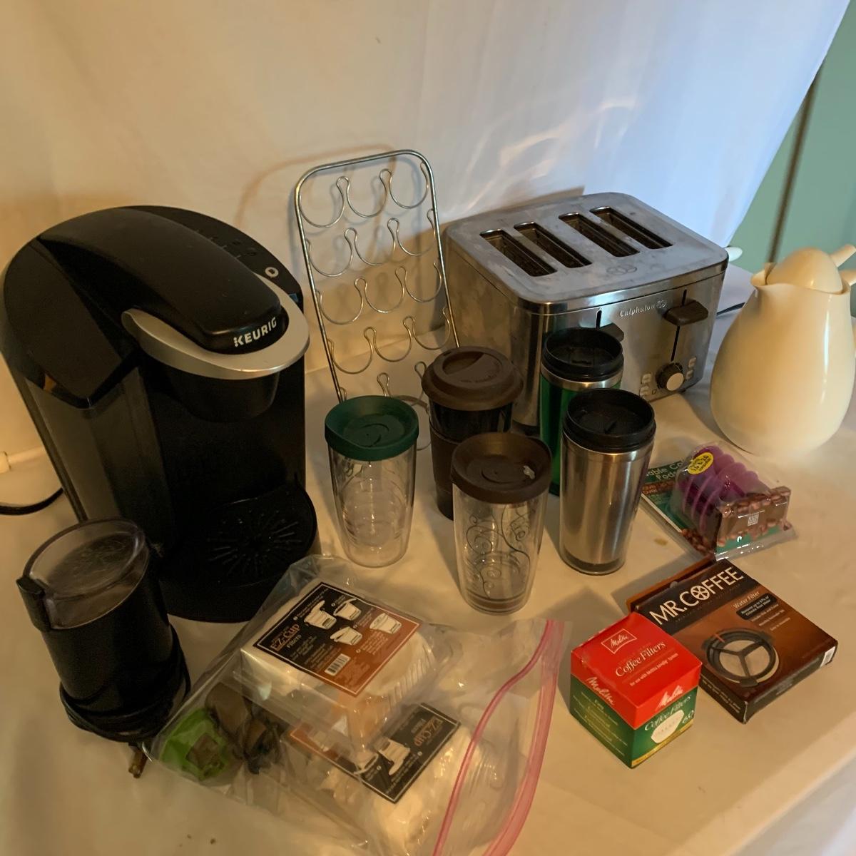 Who doesn’t LOVE a good cup of coffee? This Keurig model # K40 machine makes a delicious cup in seconds. This lot also includes a grinder, five travel mugs, a coffee pot, a rack for Keurig coffees, assorted coffee accessories, and a Calphalon toaster that is capable of toasting up to four things at once. Local pickup only.
