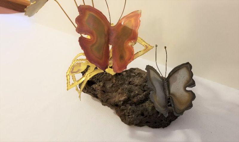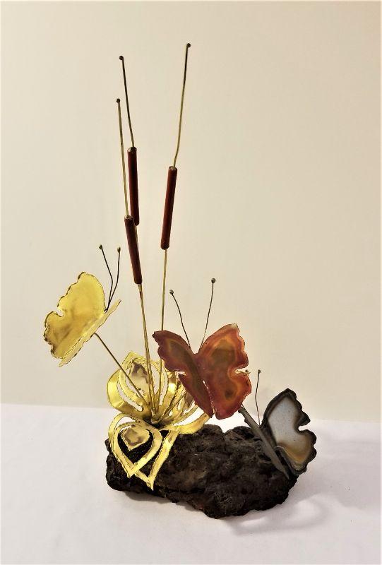 MidCentury decorative sculpture (mixed media) - wooden base, metal butterflies and cattails. Typical mid-century "art." 15" tall