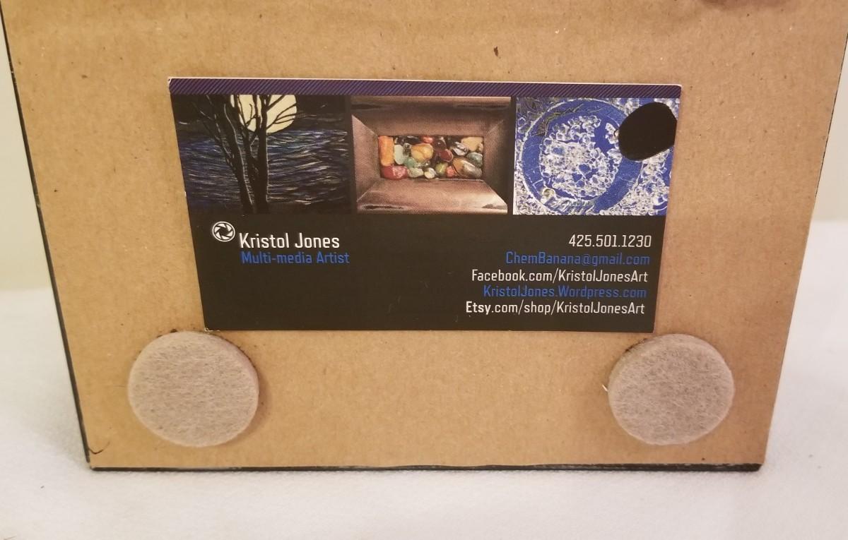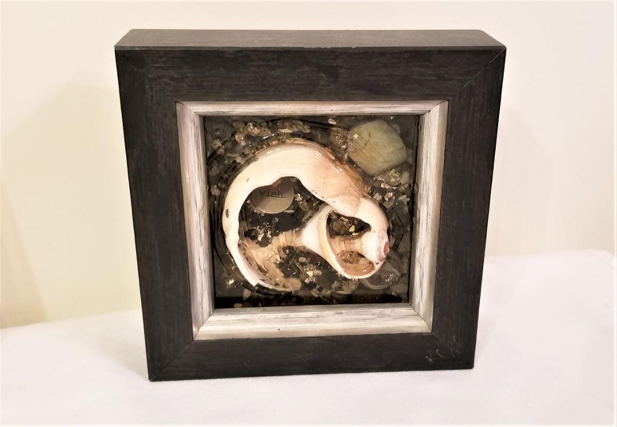 Interesting Mixed Media art piece - shells, rocks, "Wish" metal pendant" - done by Kristal Jones, mixed media artist. Measures 6" x 5.75" x 1.5" deep.