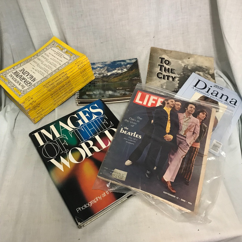 Vintage history is depicted in this wonderful collection of 1951-152 magazines. Includes National Geographical in good condition, a 1968 Life Magazine with the Beatles on the cover and what appears to be a signature over Paul McCartney (cannot verify). It is bag kept in good condition. A Ladies Home Journal booklet on Princess Diana and an old children’s book called “To the City”. Also included is a book of Images of the World from National Geographic. This lot has great insight to the history of the world. Shipping available.