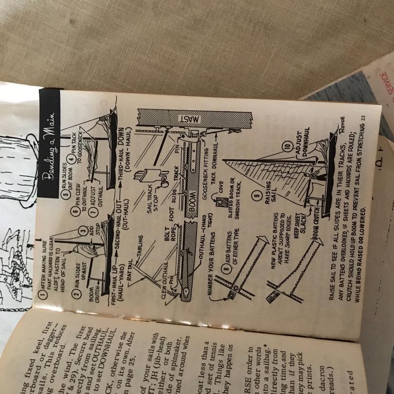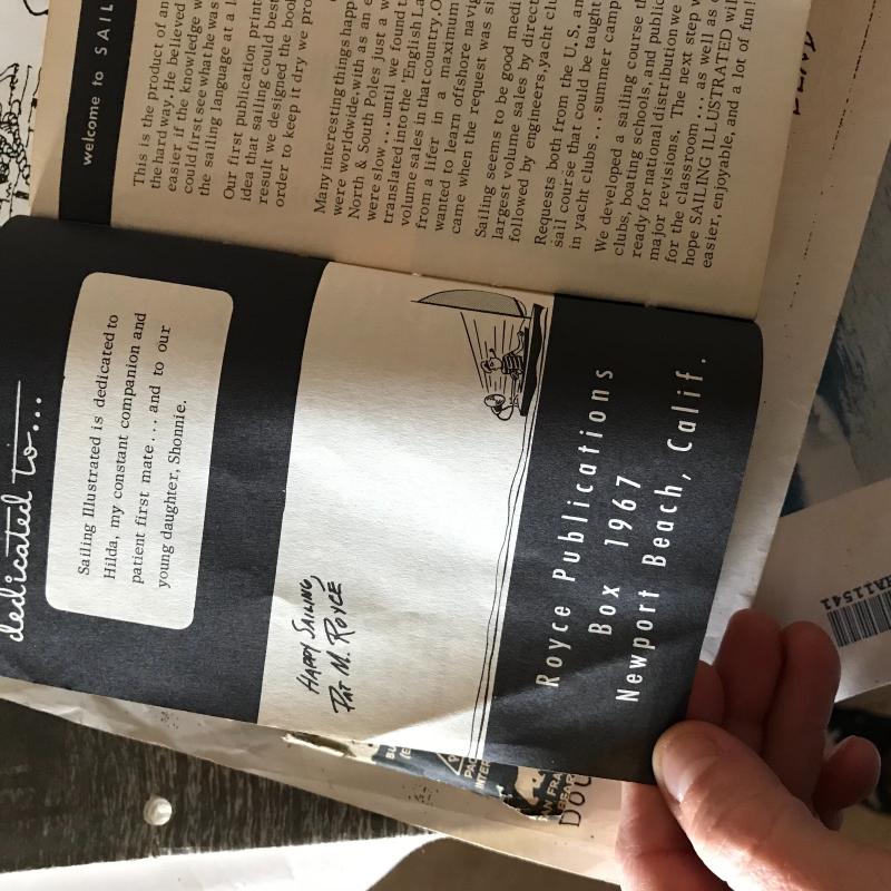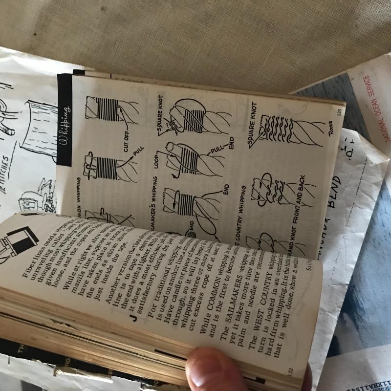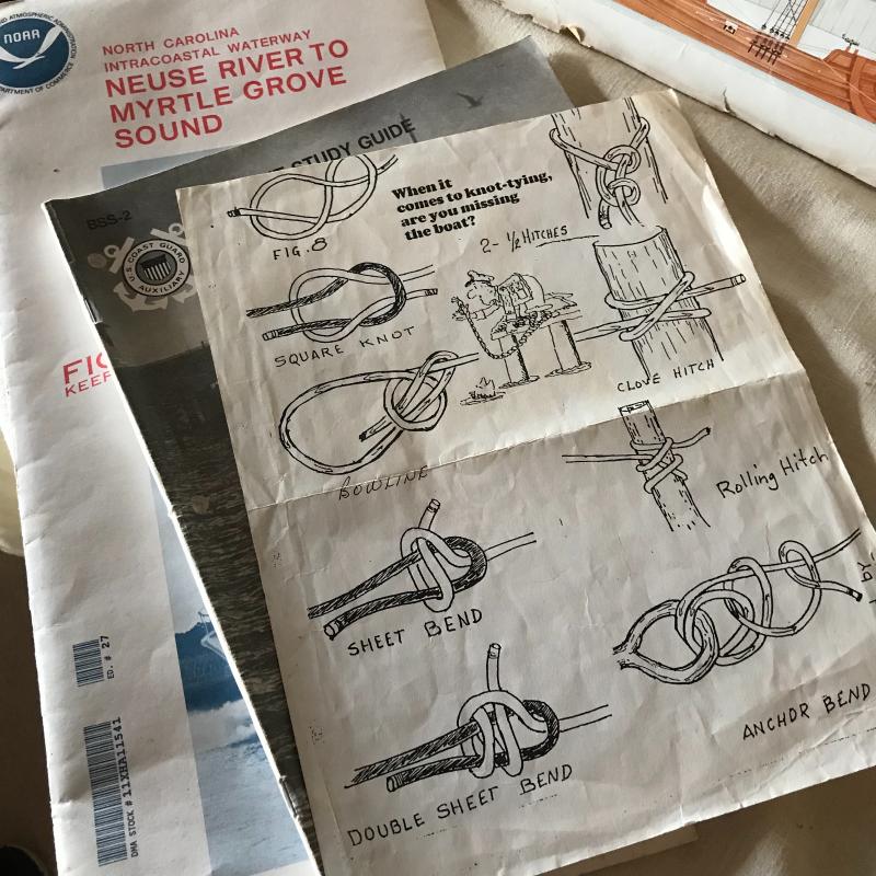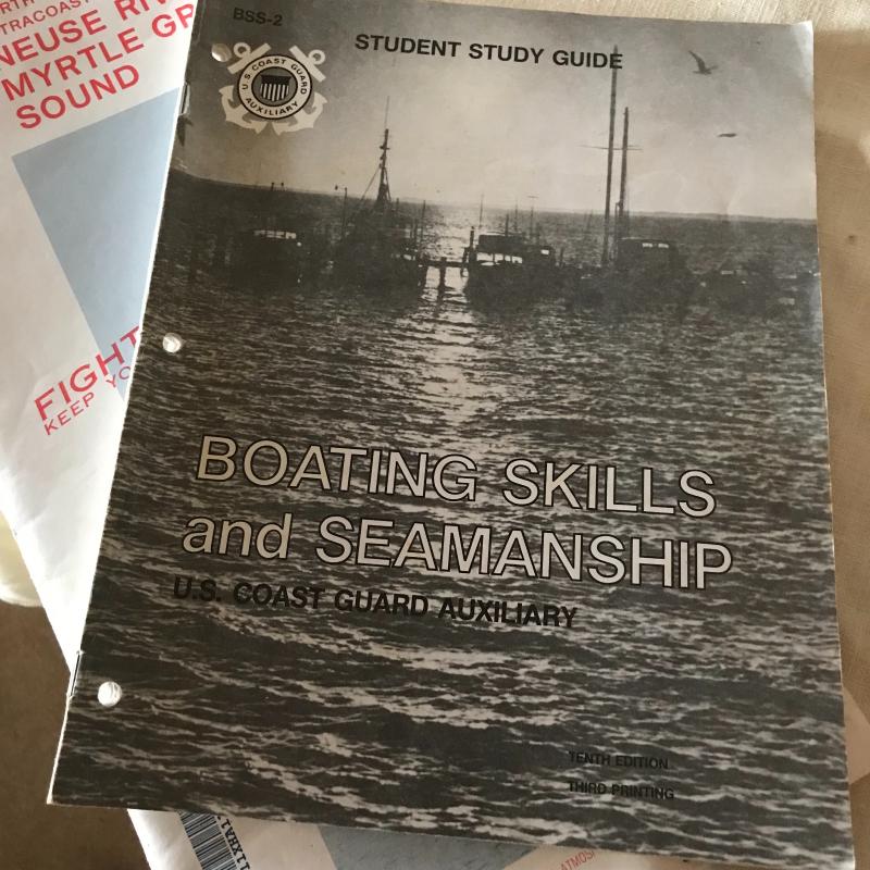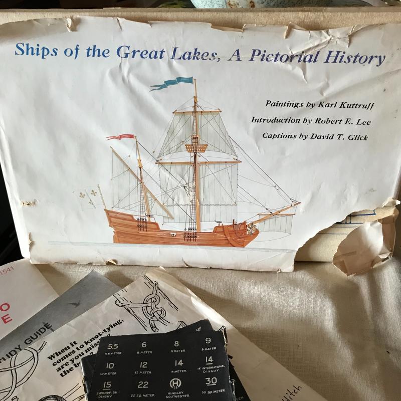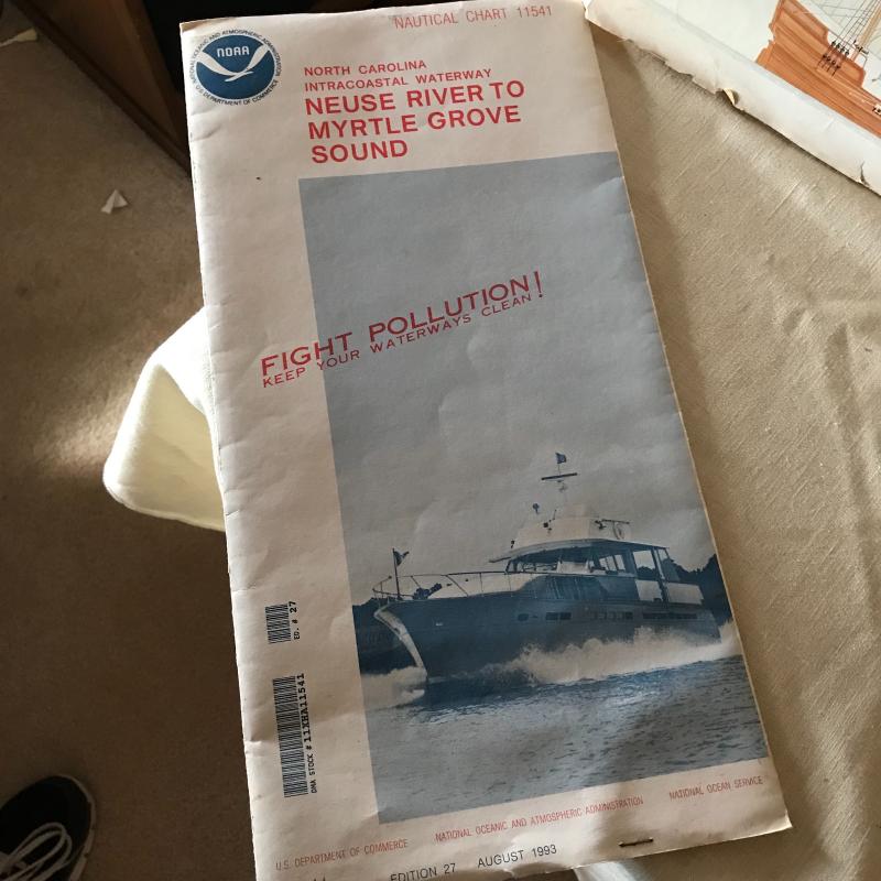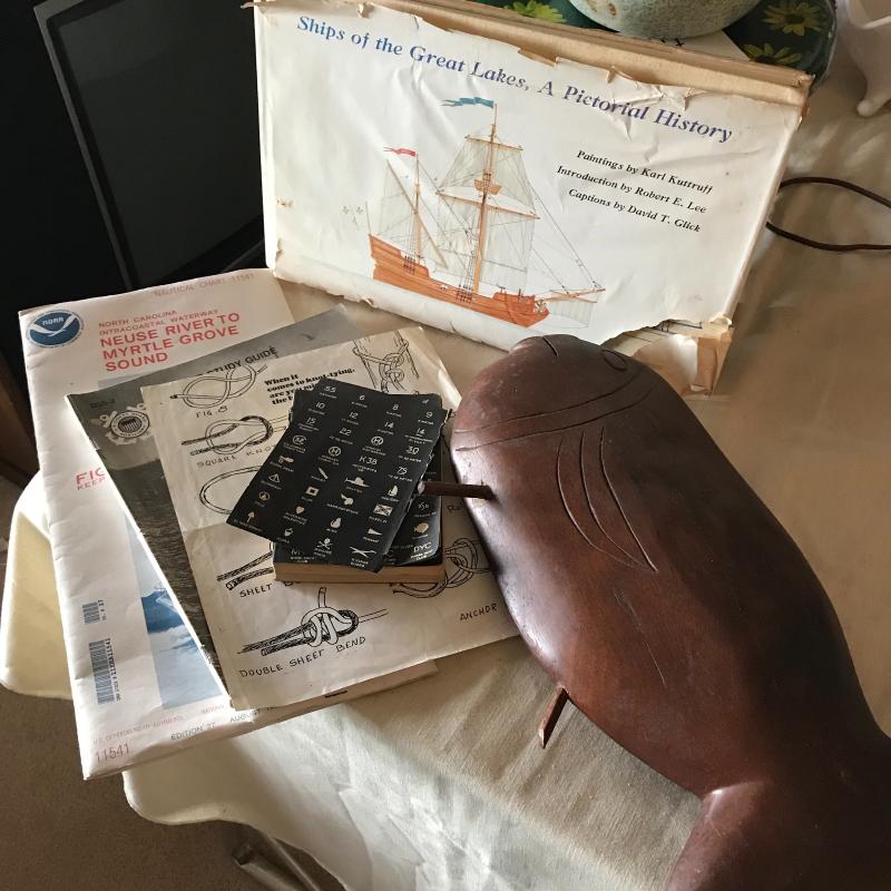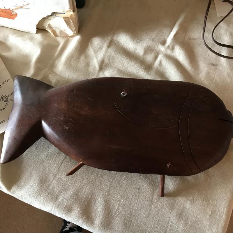 Cool lot for your favorite fisherman. Contains heavy wooden fish (possibly teak wood?). Used to balance on pegs but one is broken. Has eye hook now for hanging. Lot also includes small book called “Sailing Illustrated” published in 1967 with cover torn off, a boating skills and seamanship guide, a nautical chart of the Neuse River to Myrtle Grove Sound, and a book called Ships of the Great Lakes, A Pictorial History,” published in 1976.