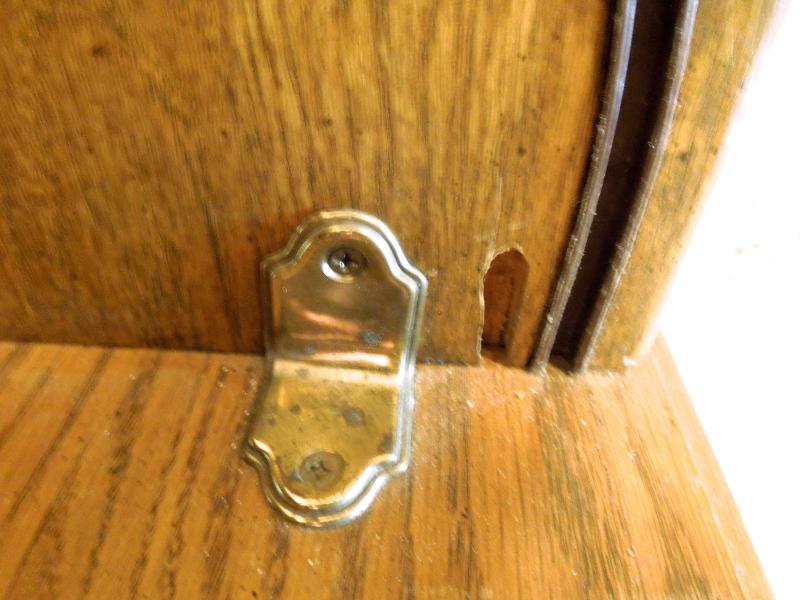 Nice walnut finish roll top desk. 48" H x 42" W x 25" D. Brass hardware. Lock has been removed and no keys. Has drawer for hanging files. Very light surface scratching in places. Patch of dirt splatter along inside bottom as pictured.
