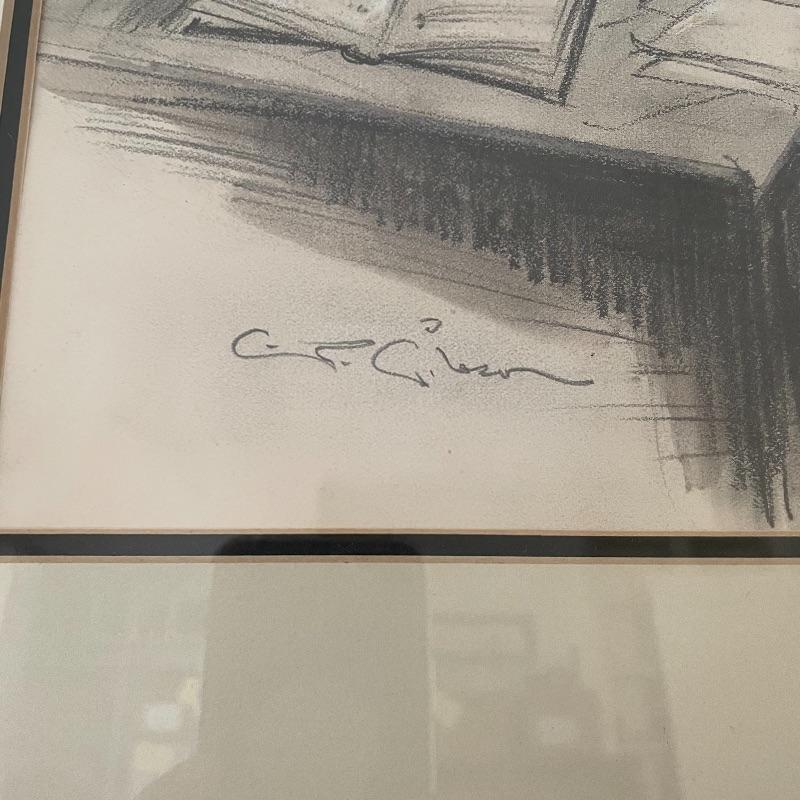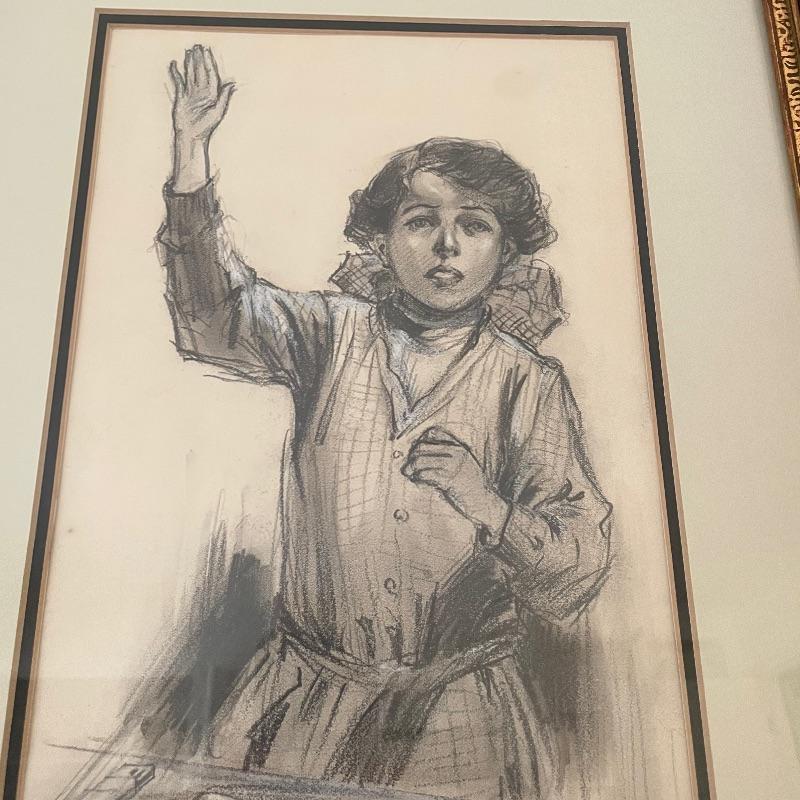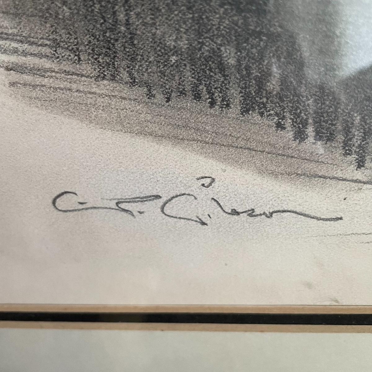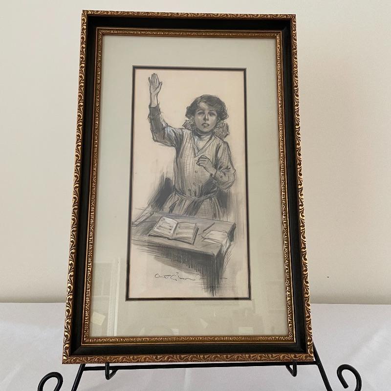 Artist Charles Dana Gibson was famous for his depictions of graceful and beautiful women during his life from 1867 to 1944 (see image from the Encyclopedia Brittanica). This lovely framed piece is no exception, the emotion captured by Gibson is wonder. Art appears to stray from his pen-and-ink style and looks a bit like charcoal. The signature appears to be pencil, but we cannot confirm if this is an original. It sits behind glass and nice layered matting. The painted wooden frame measures approximately 15” x 23”. Shipping available. Please call UPS with dimensions at 828-252-6930 for a shipping quote prior to bidding.
