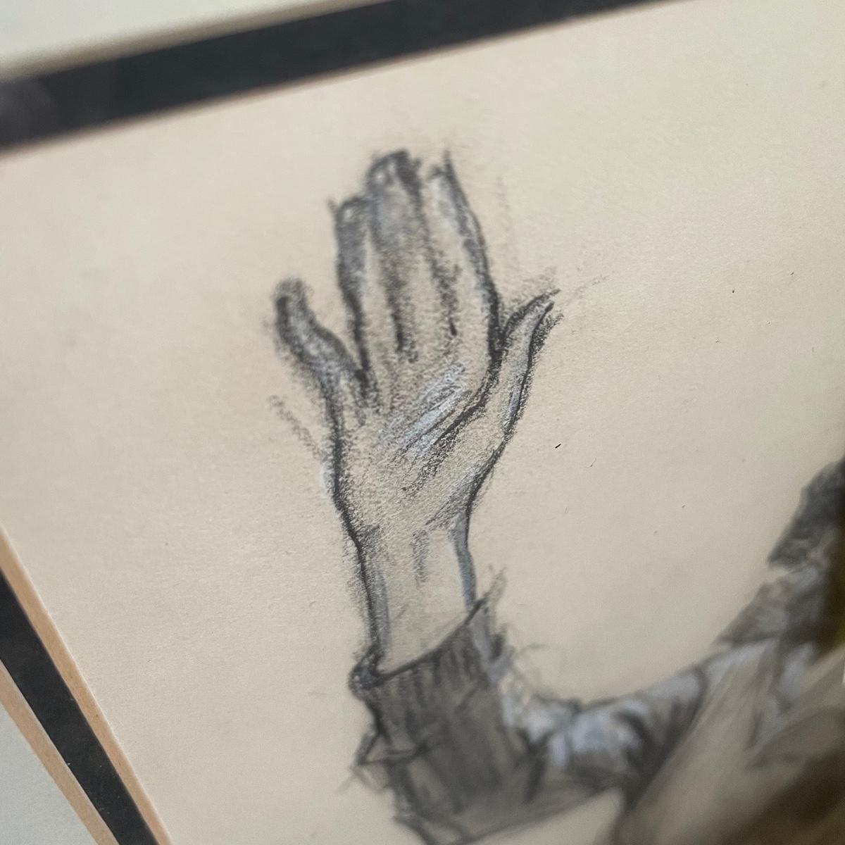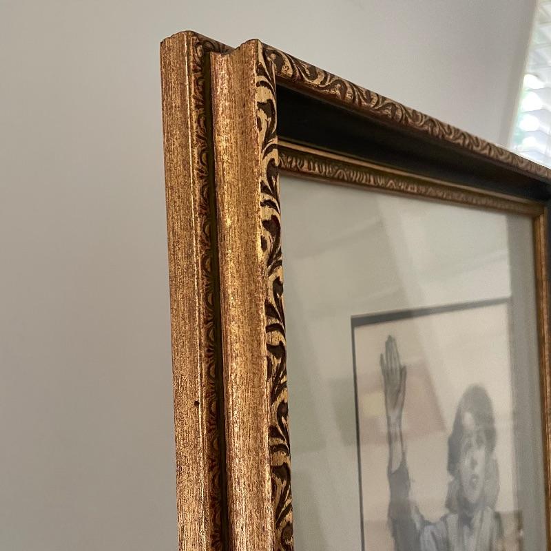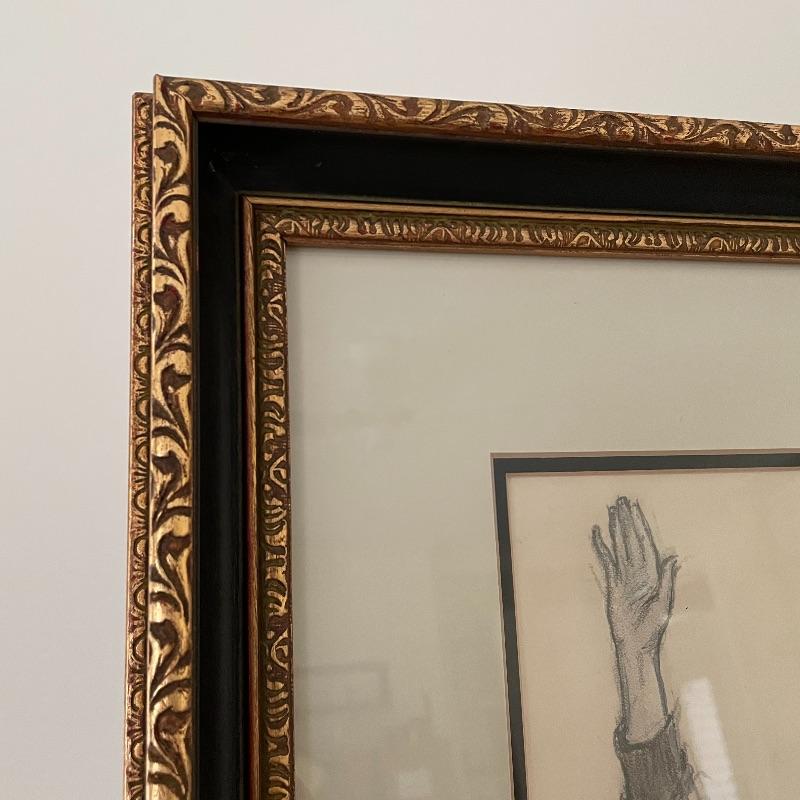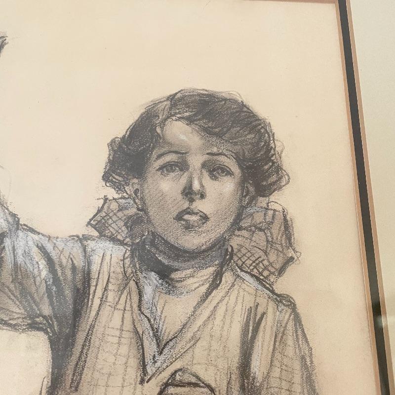 Artist Charles Dana Gibson was famous for his depictions of graceful and beautiful women during his life from 1867 to 1944 (see image from the Encyclopedia Brittanica). This lovely framed piece is no exception, the emotion captured by Gibson is wonder. Art appears to stray from his pen-and-ink style and looks a bit like charcoal. The signature appears to be pencil, but we cannot confirm if this is an original. It sits behind glass and nice layered matting. The painted wooden frame measures approximately 15” x 23”. Shipping available. Please call UPS with dimensions at 828-252-6930 for a shipping quote prior to bidding.