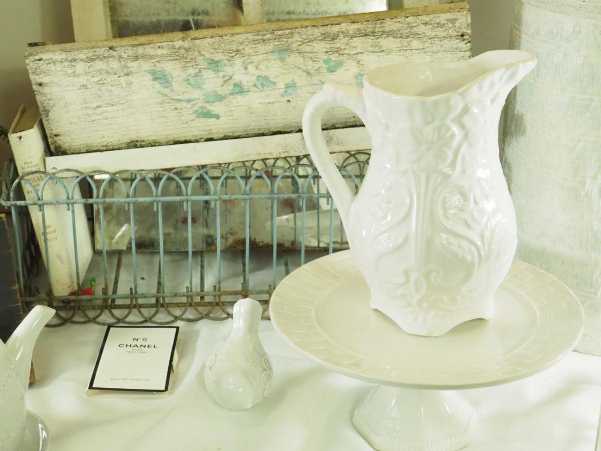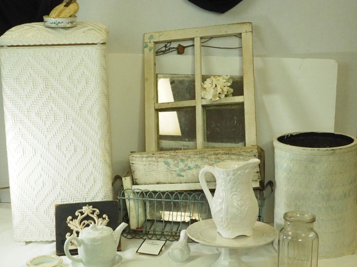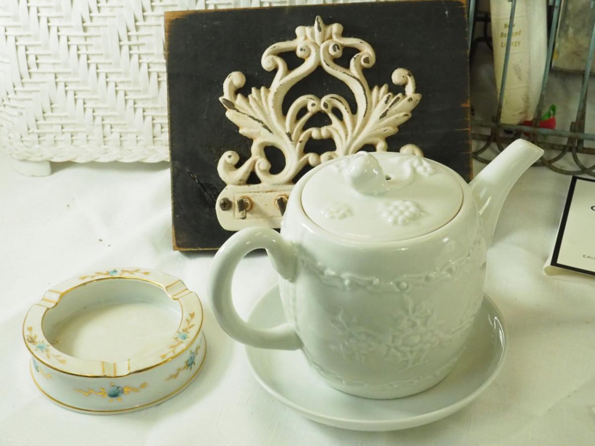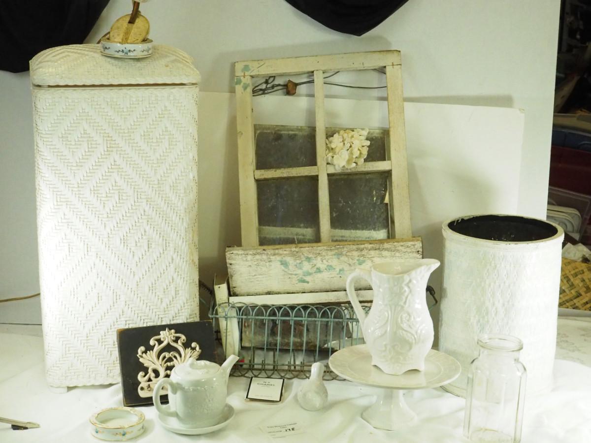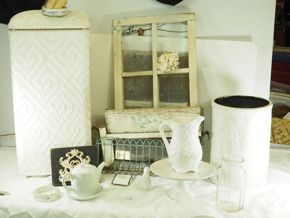 lot 148- Shabby Chic , pitcher, tea pot mirror window planter, white rattan hamper, Key hook, Vintage wall light. Antique ashtrays, cake platter.
