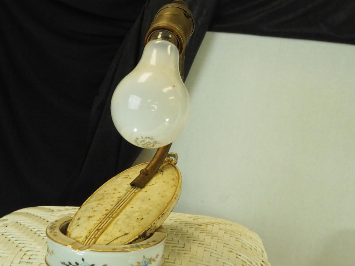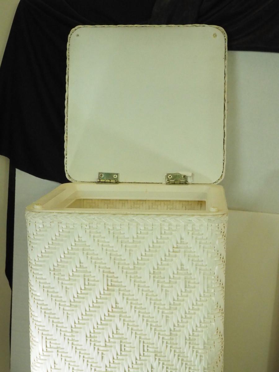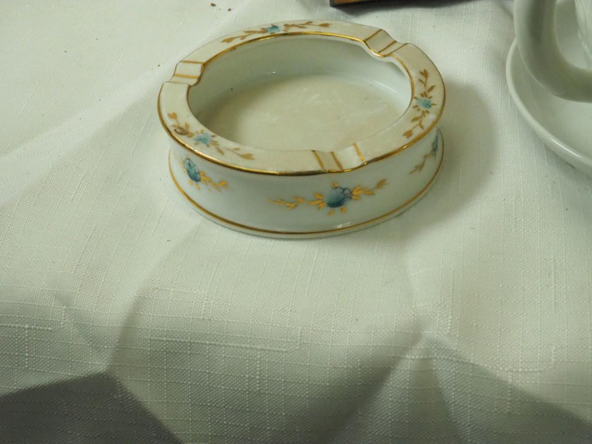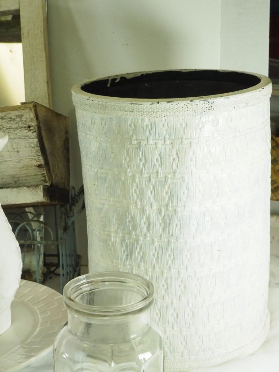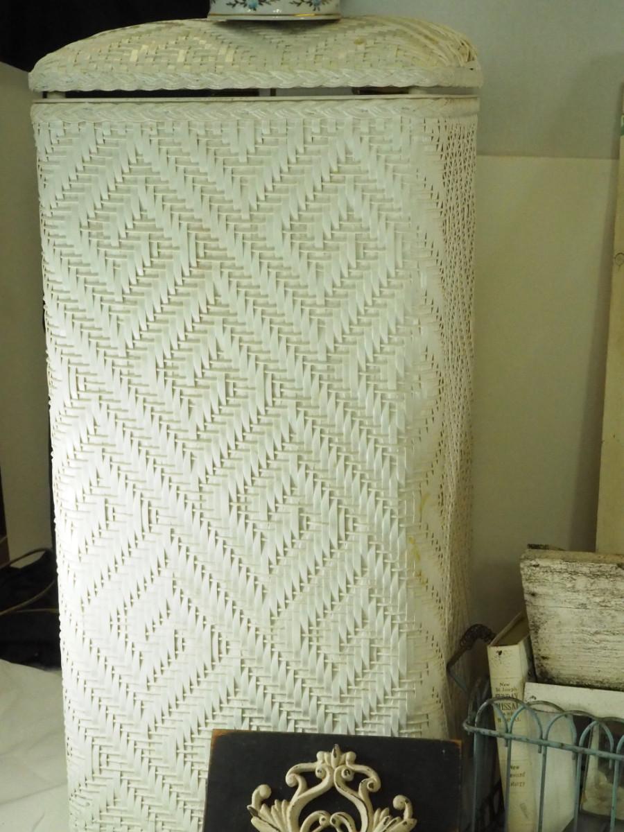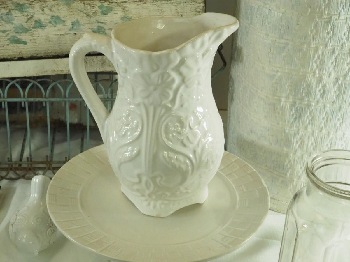 lot 148- Shabby Chic , pitcher, tea pot mirror window planter, white rattan hamper, Key hook, Vintage wall light. Antique ashtrays, cake platter.