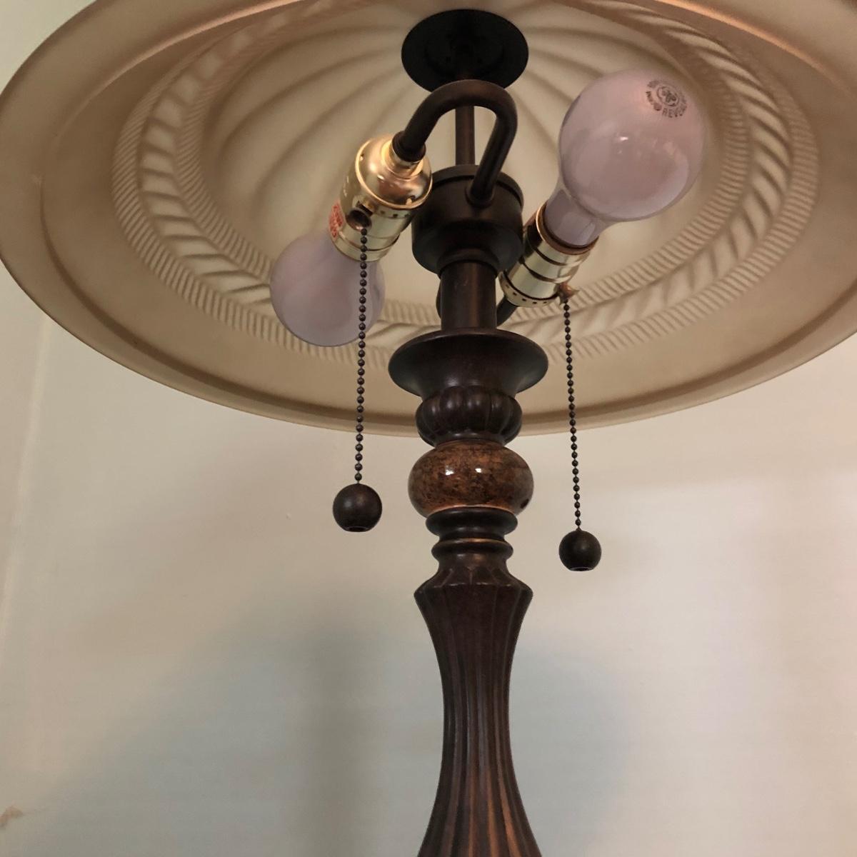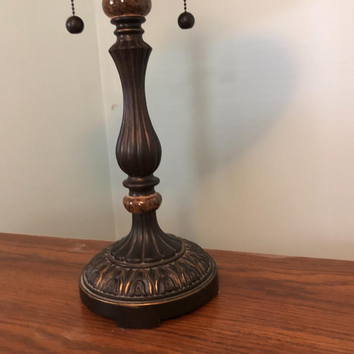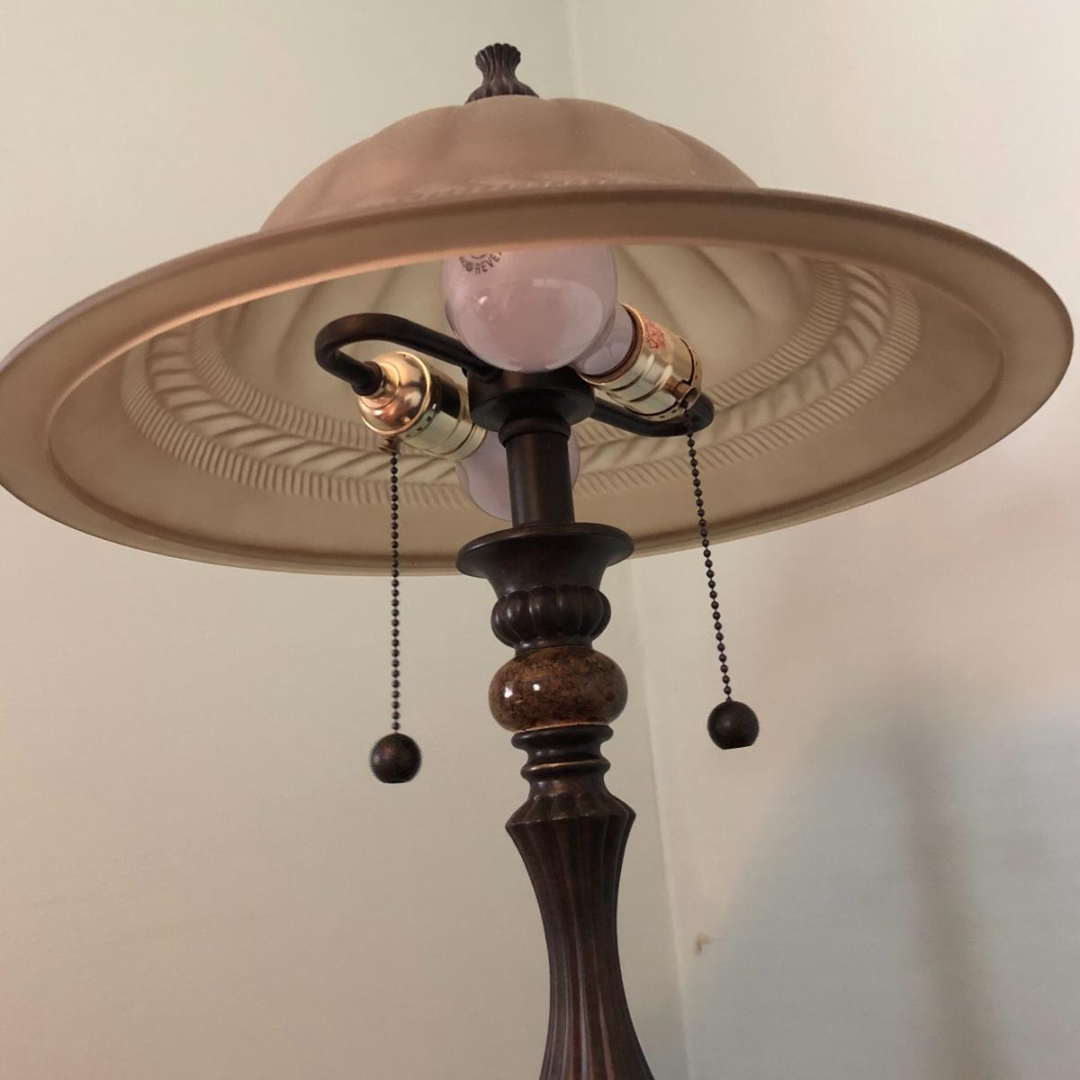 The lamp has a glass shade, two light bulbs and is approximately 25” tall. Local pick up only.