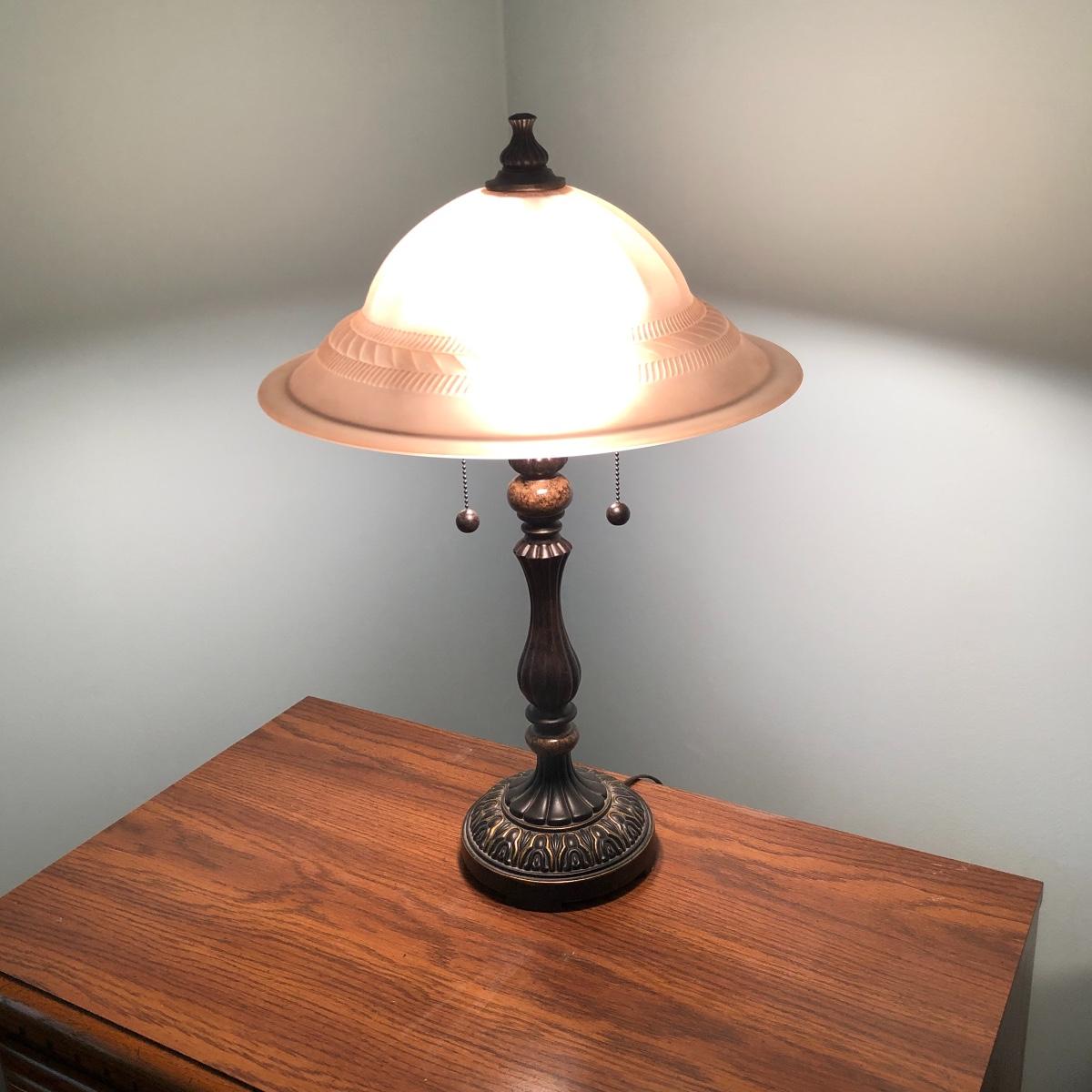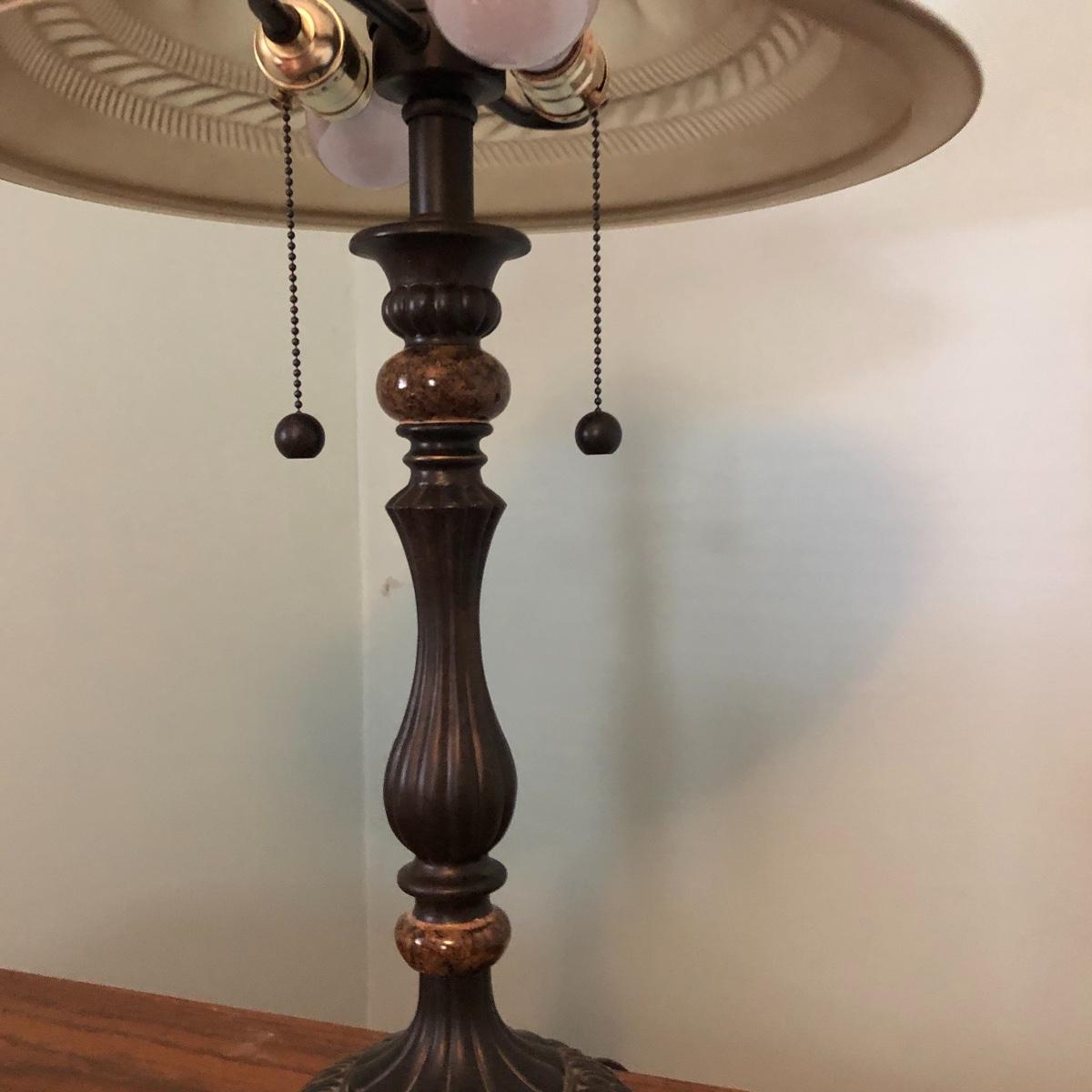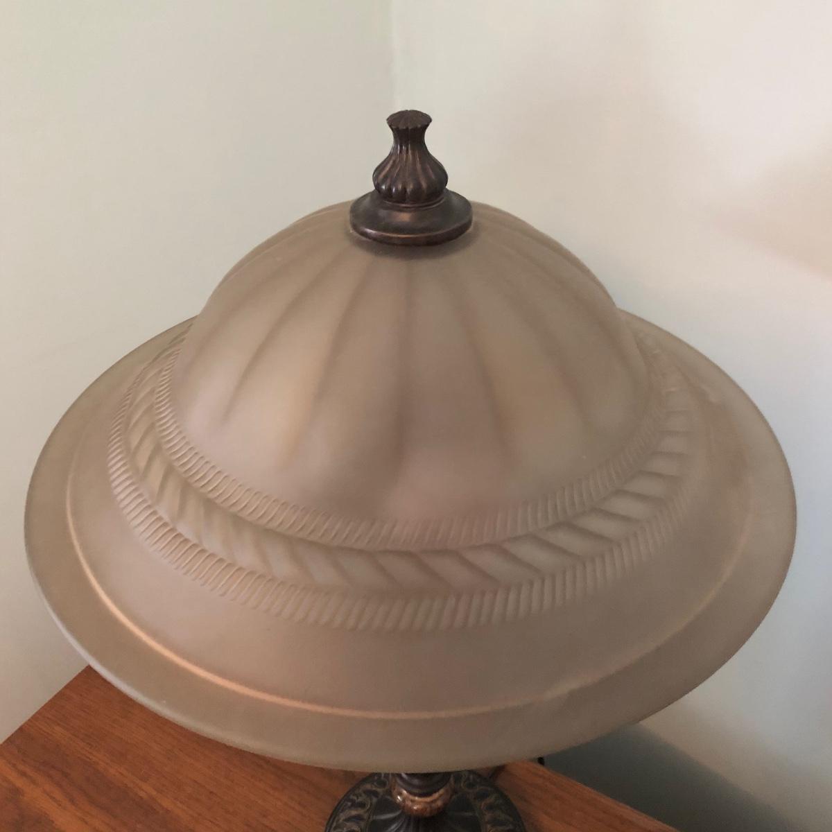 The lamp has a glass shade, two light bulbs and is approximately 25” tall. Local pick up only.